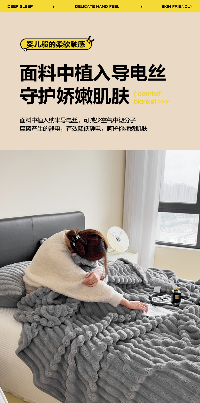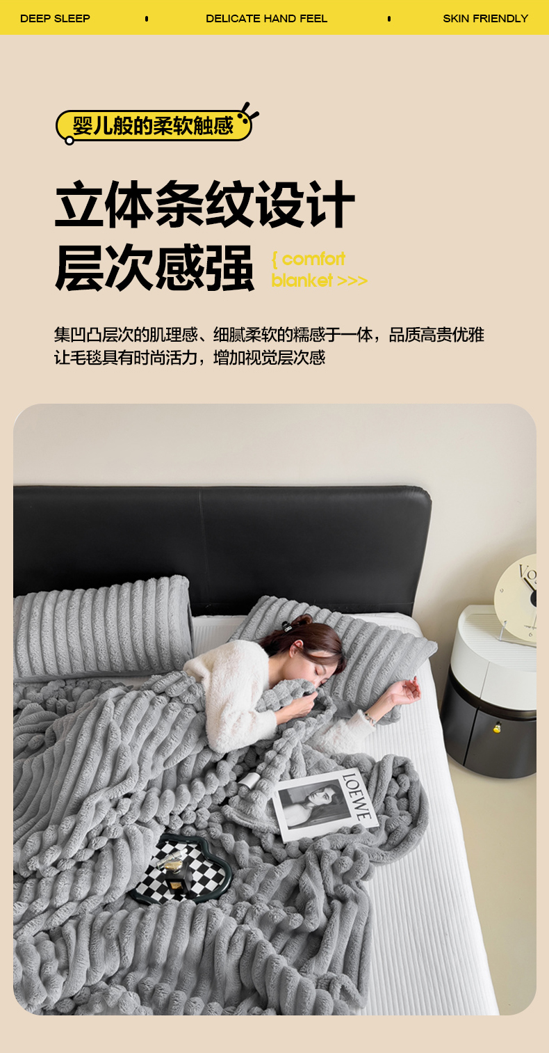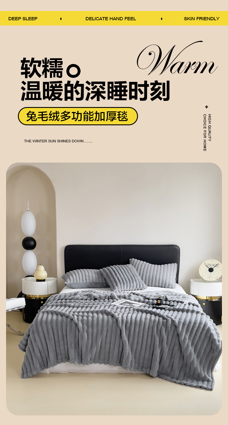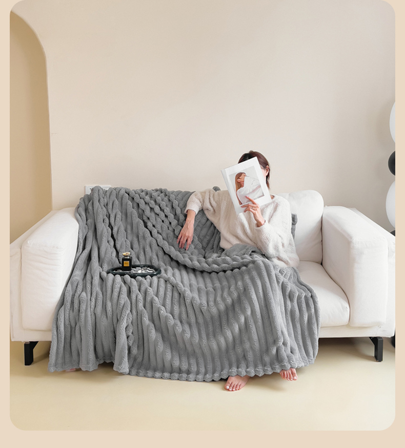 商品名称:一帆毯业 跨境外贸2025新款仿兔毛宽抽条牛奶绒盖毯 抽条浅灰