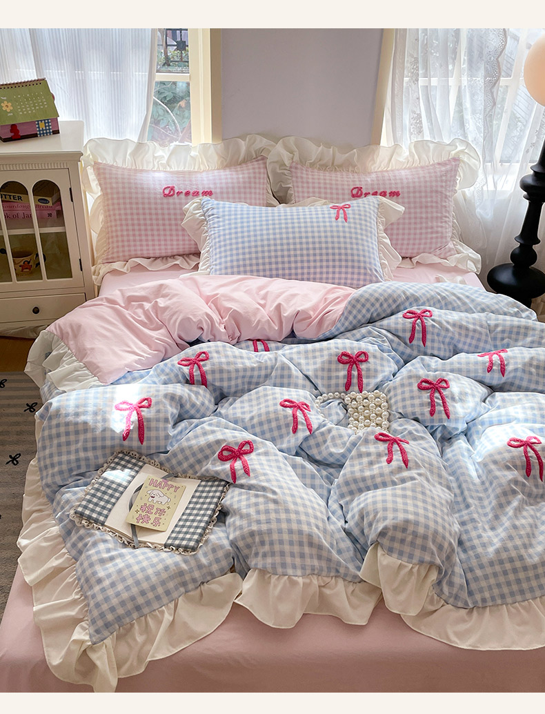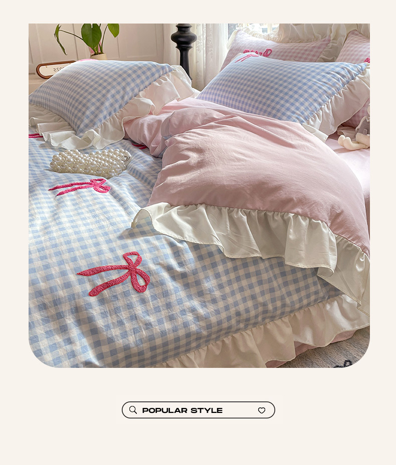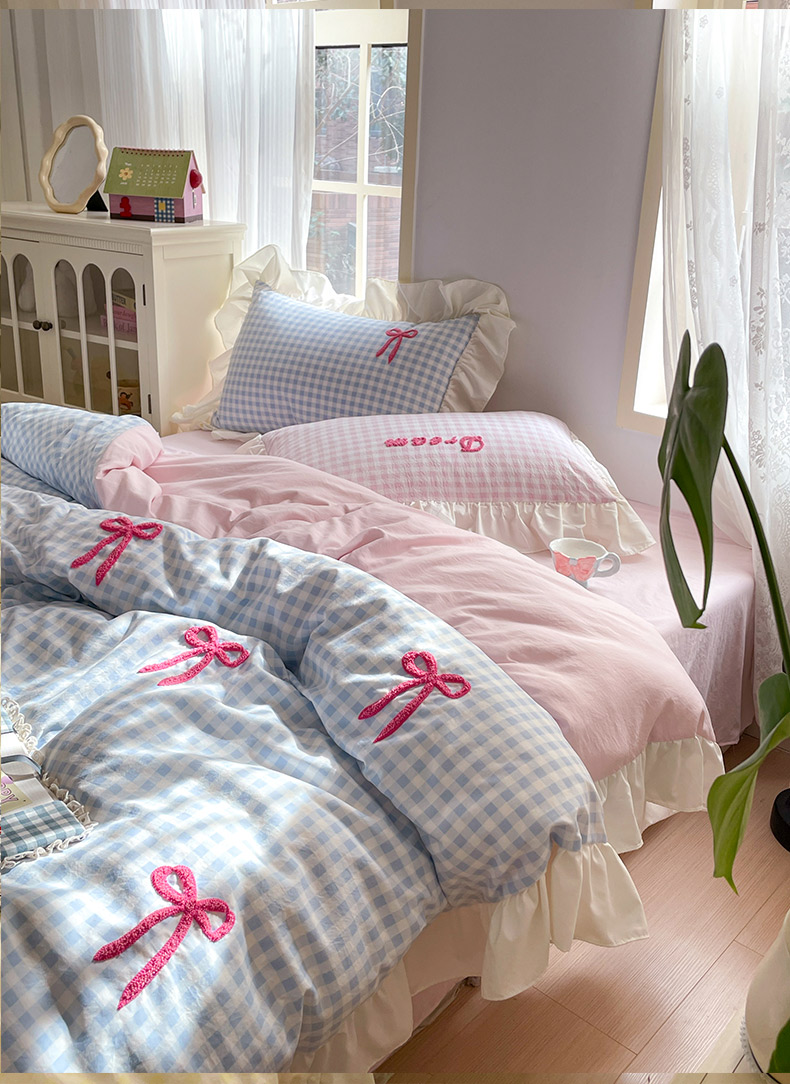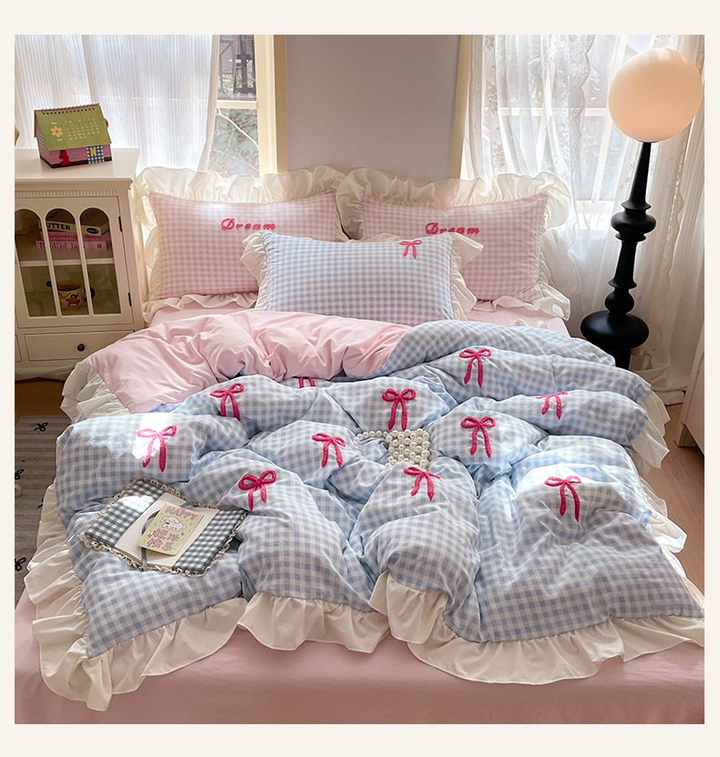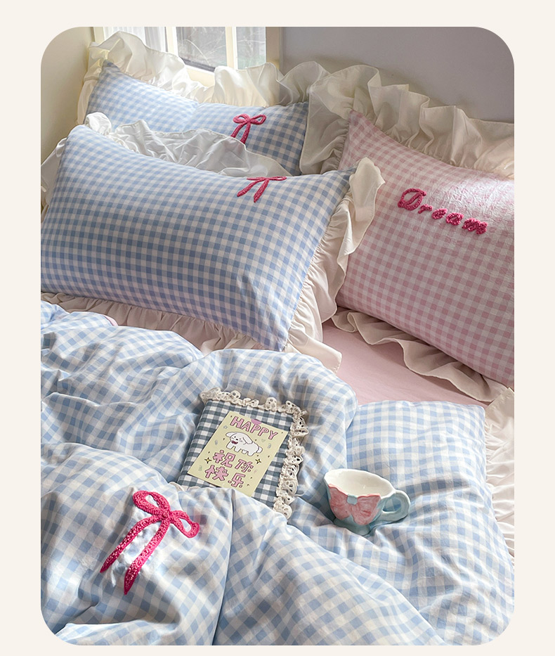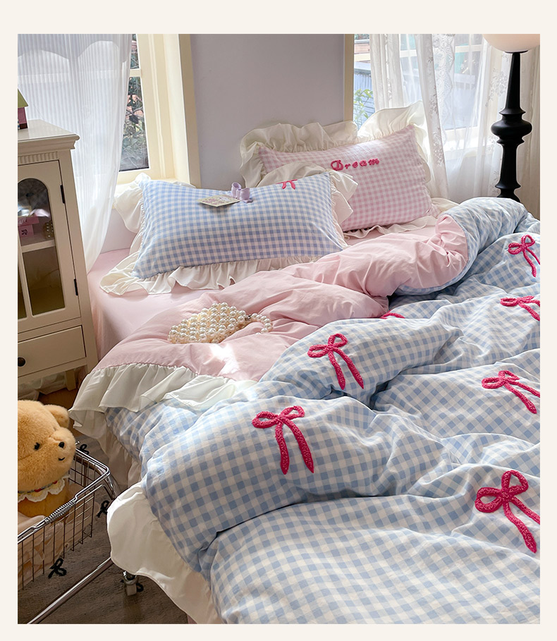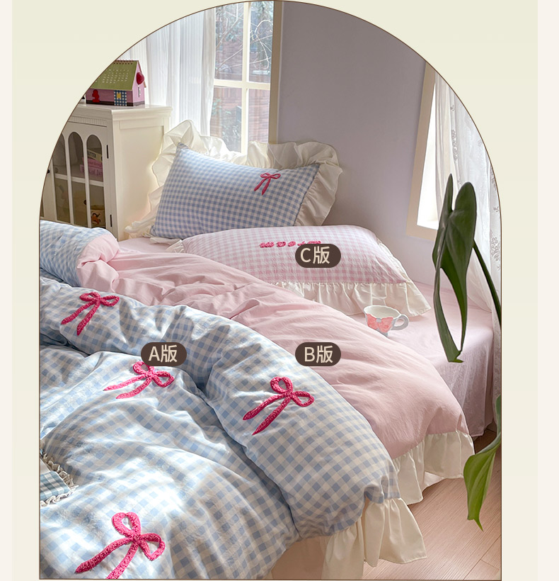 当前位置: 91家纺网 > 商品网购 > 床品套件 > 四件套 > 全棉普通四件套 > 沐辰2025春夏新款韩式花边款蝴蝶结四件套 韩式蝴蝶结-蓝