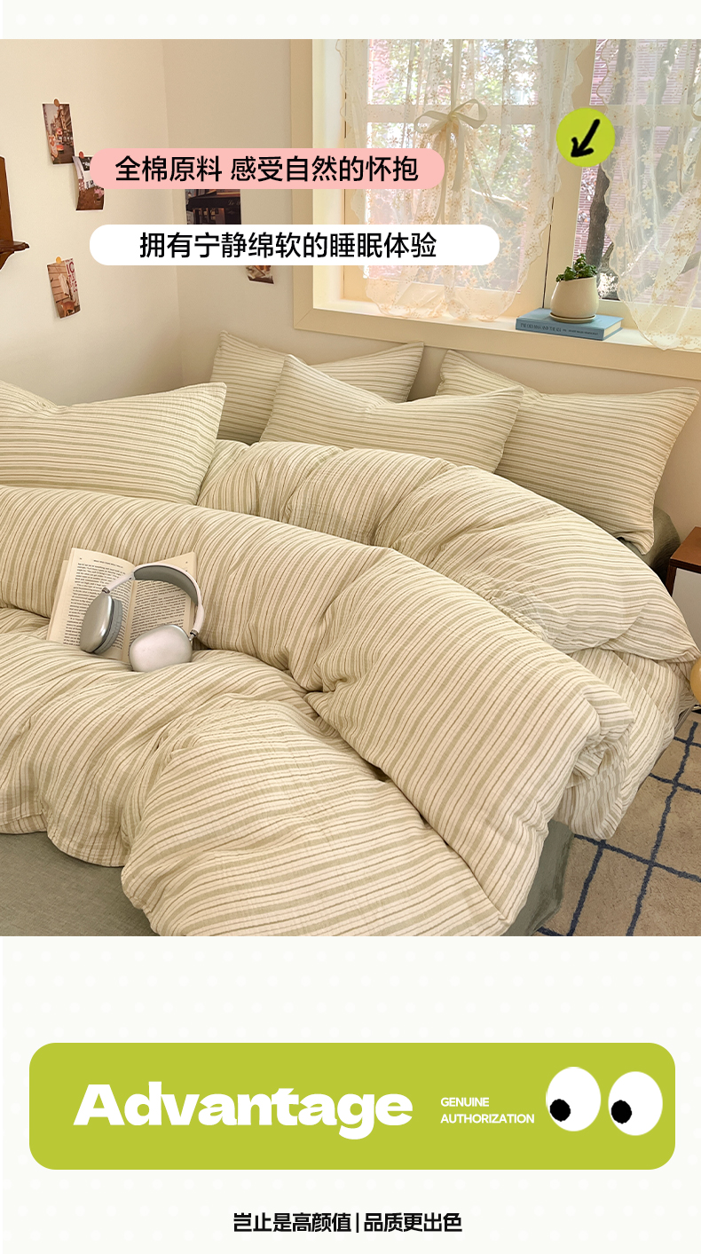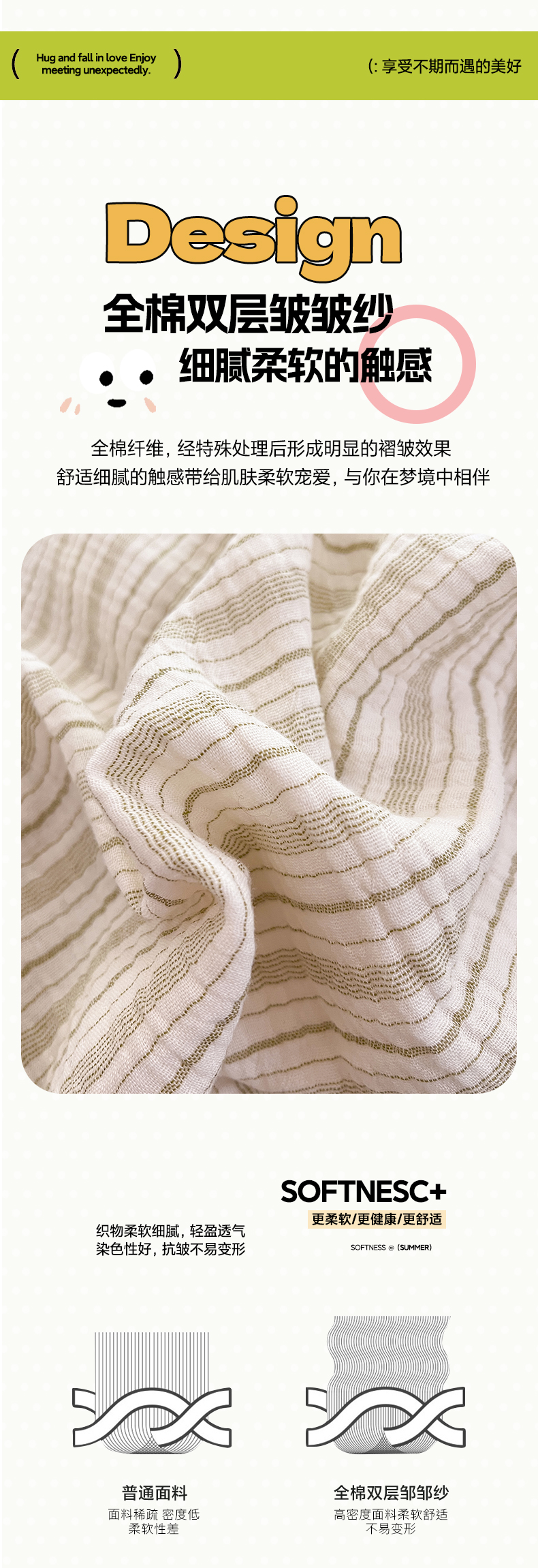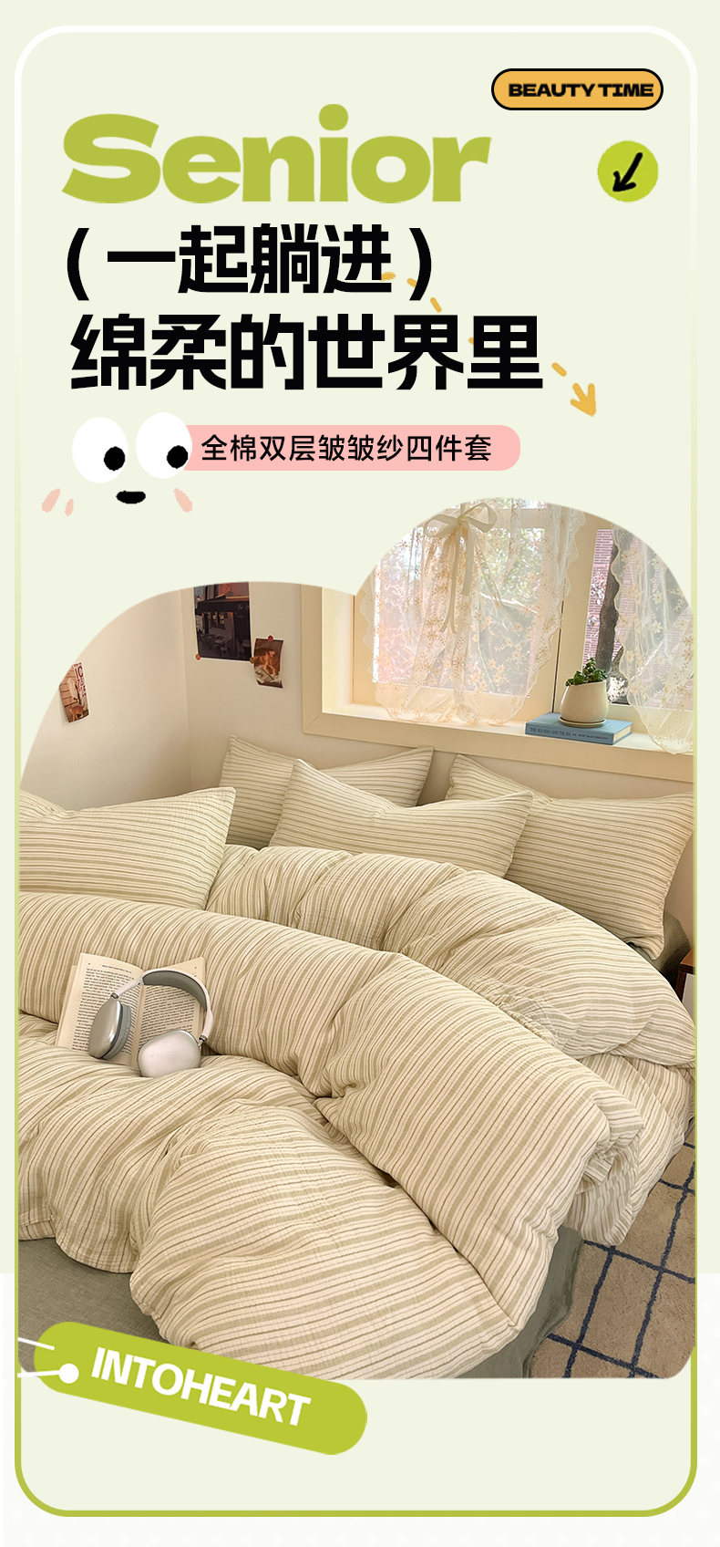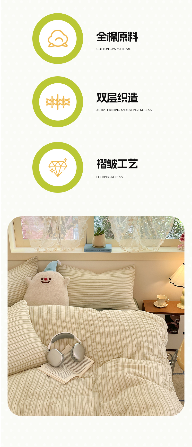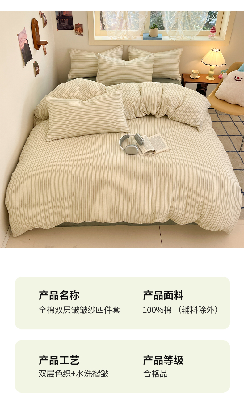 商品名称:艾咪-Amy ntmy 2025新款条纹款全棉双层皱皱纱四件套 小半浅绿