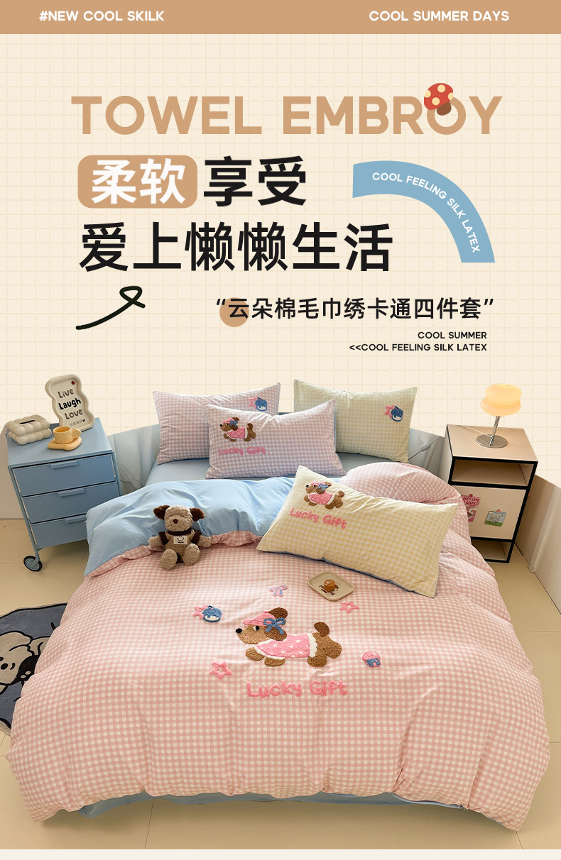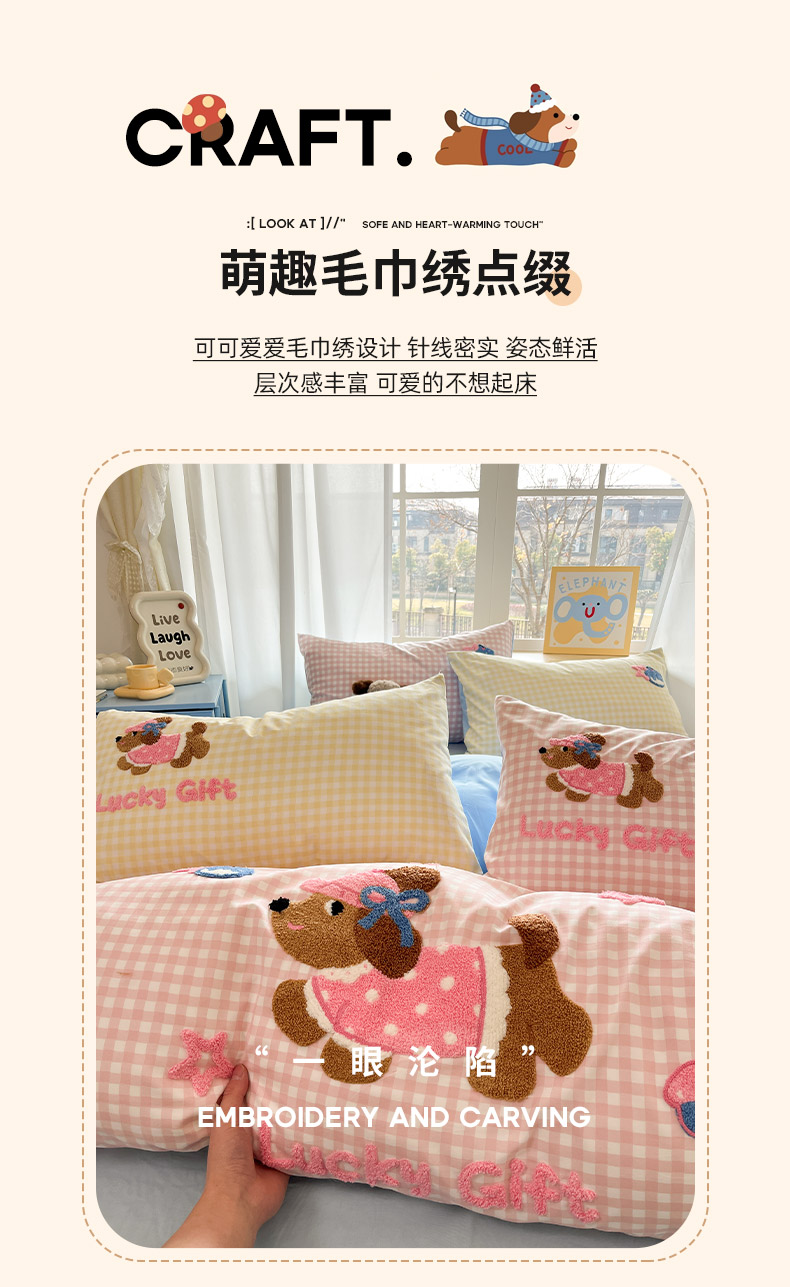乐坊2025新款云朵棉毛巾绣四件套 腊肠狗-粉格