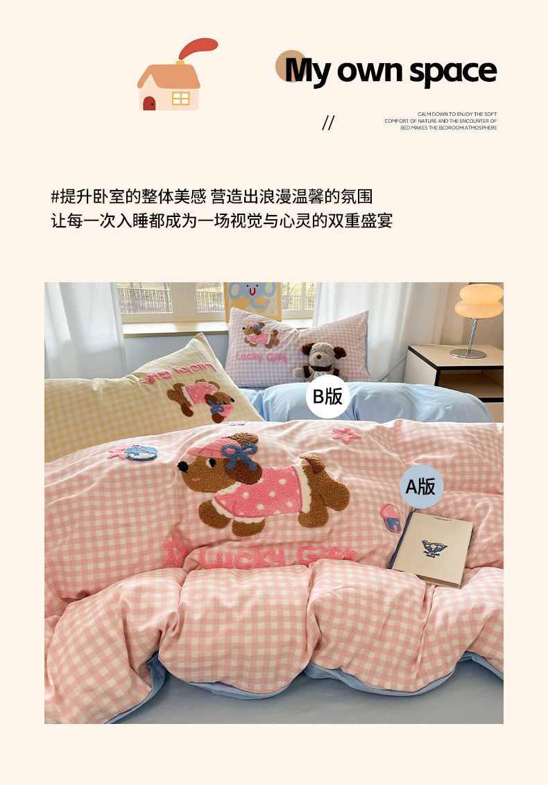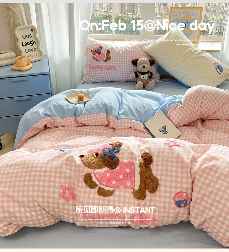 (总)乐坊 2025新款300g高克重兔绒卡通贴布绣牛奶绒四件套冬季加厚保暖,萌宠猫咪白粉,萌宠猫咪粉,可爱兔兔,快乐企鹅,美拉德狗狗,熊熊腊肠狗