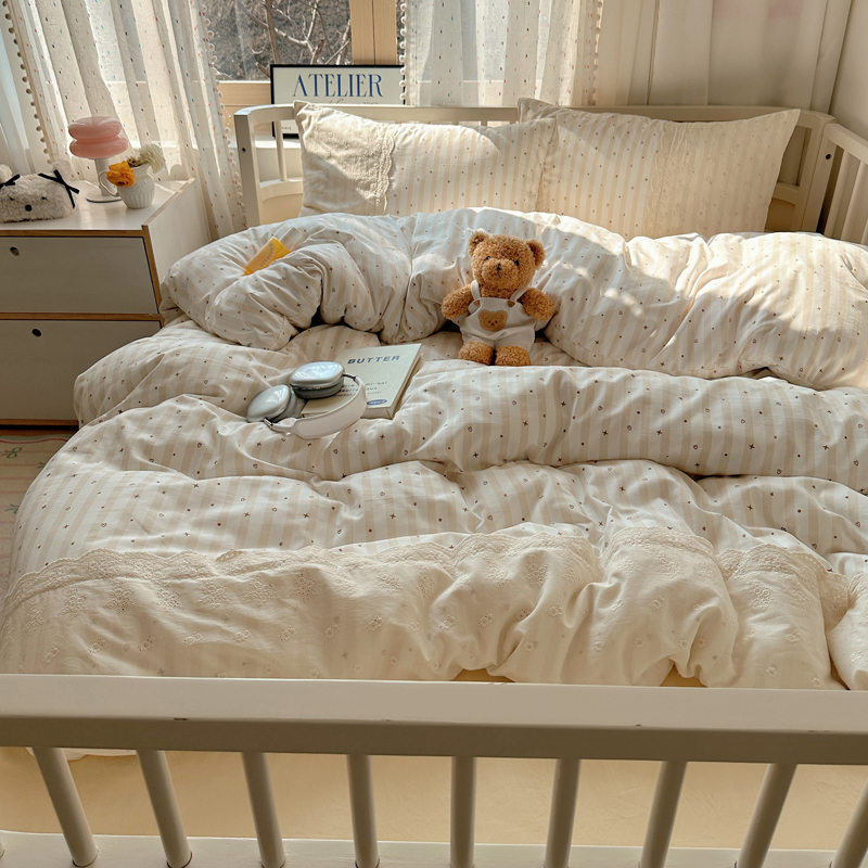 商品名称:顾里家纺 2025新款简约小资系列云感双层纱四件套 条纹星星咖