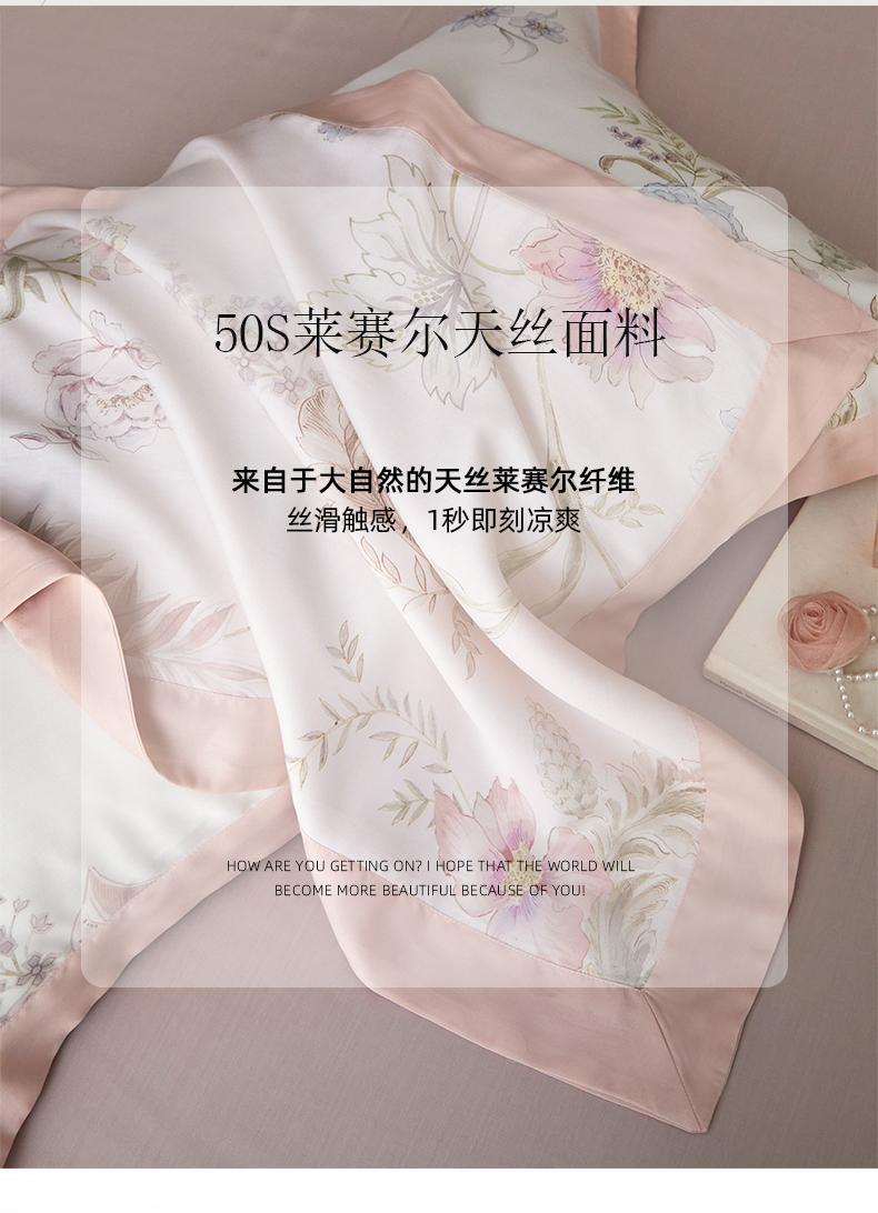 商品名称:薏思家纺 2025新款50支莱赛尔天丝数码印花夏被+四件套(礼盒包装) 芳菲-米白