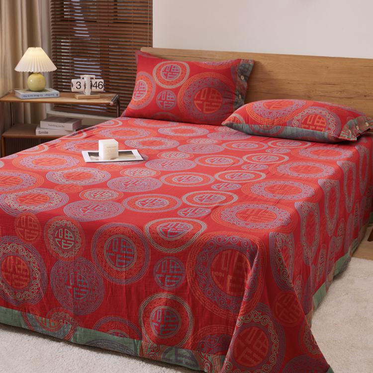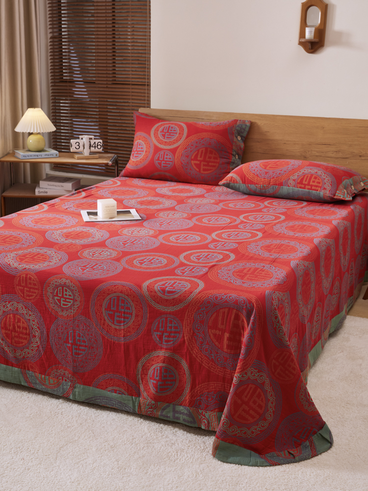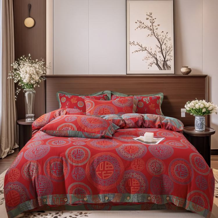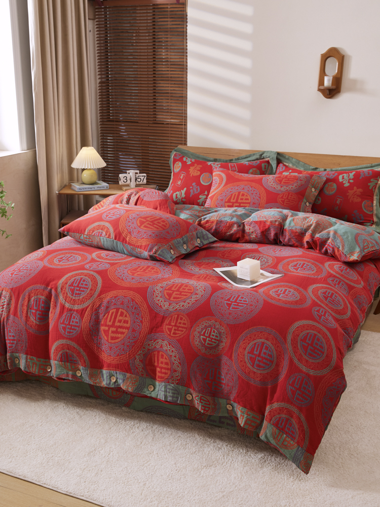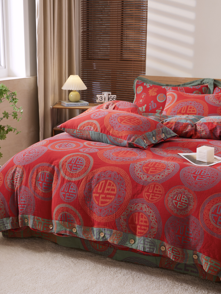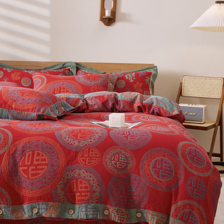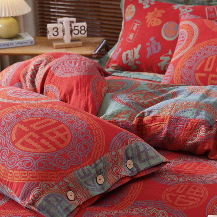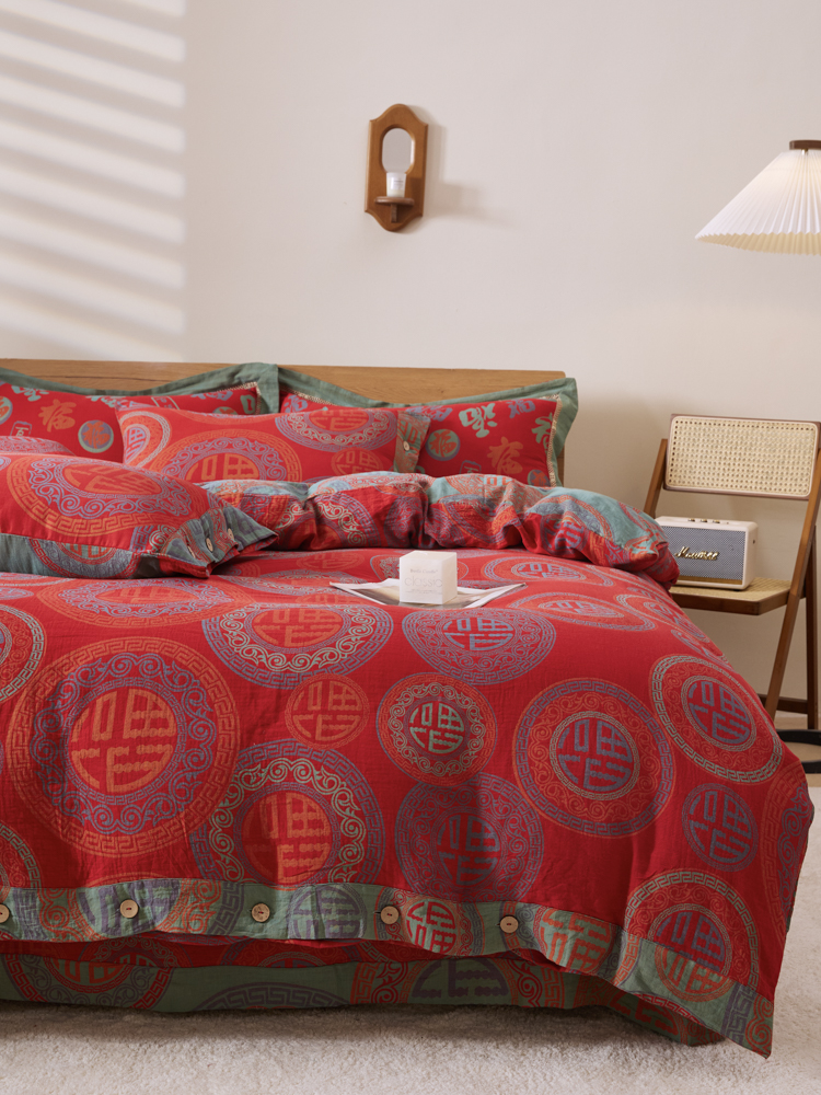 2025新款全棉色织双层纱纽扣款四件套 福星高照