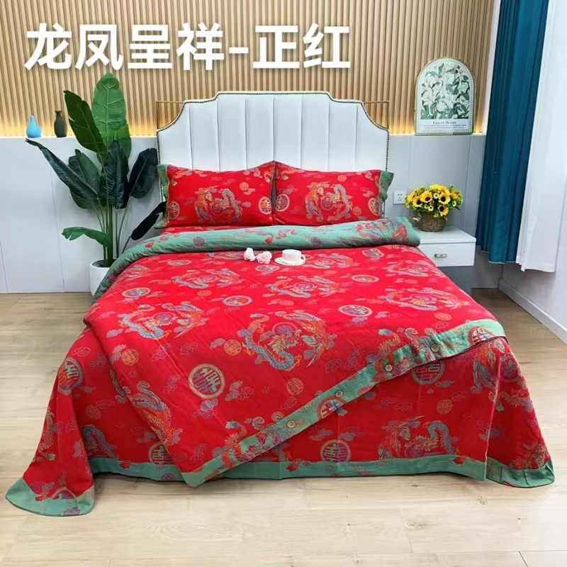 商品名称:2025新款全棉色织双层纱纽扣款四件套 龙凤呈祥-正红