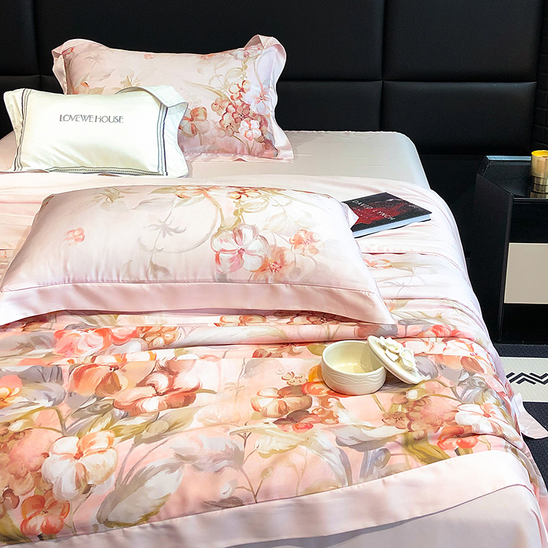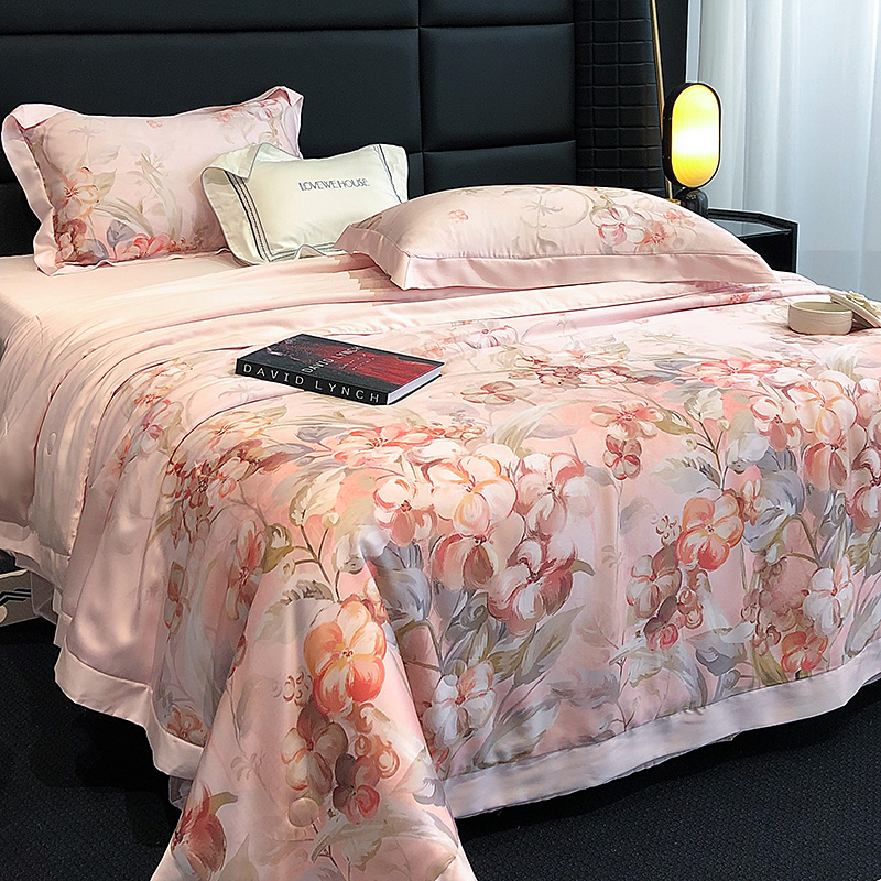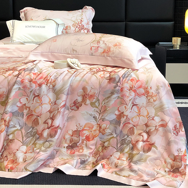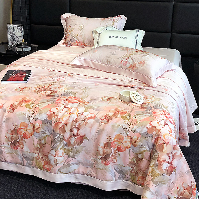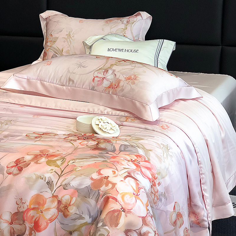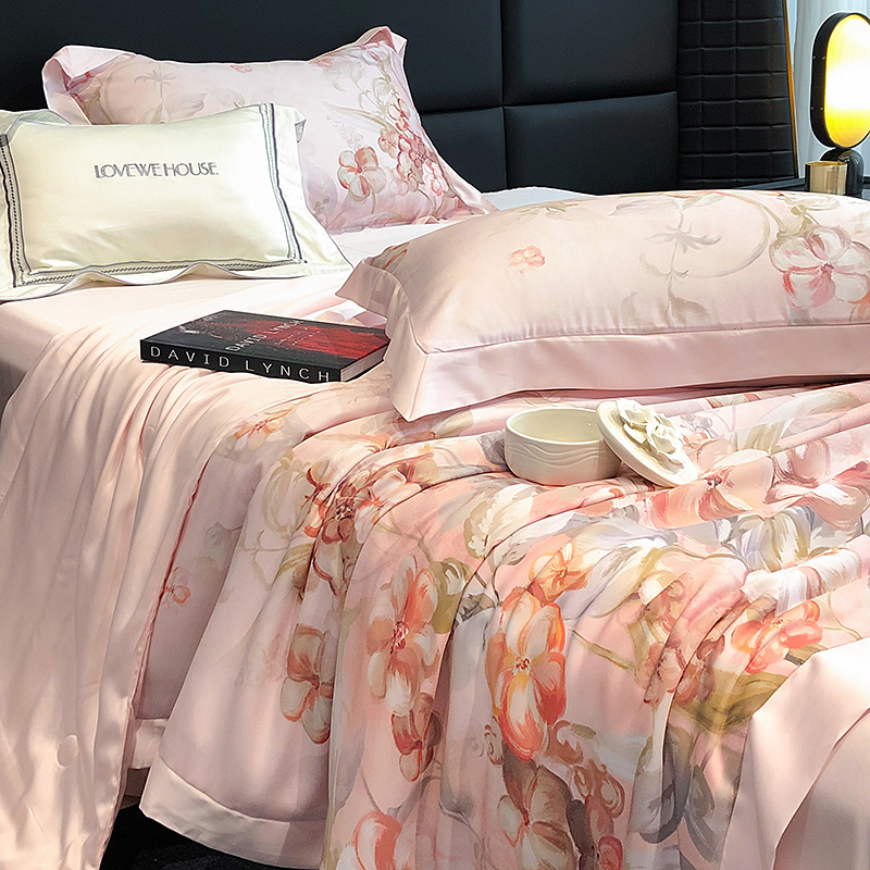 • 91家纺网 家纺一手货源 找家纺 若未家居 LOVEWE HOUSE 2025新款兰精天丝印花夏被及夏被四件套 花西子 粉(床单款+床盖款)