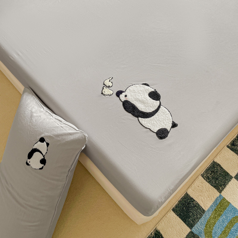 • 91家纺网 家纺一手货源 找家纺 海岛哥哥 2025春夏新款卡通毛巾绣床笠 顽皮熊猫-灰