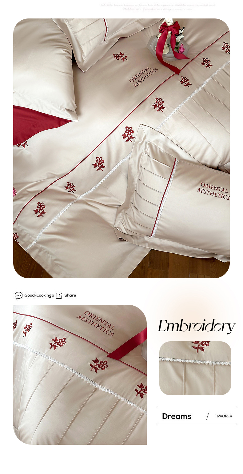 红番天家居馆 2025新款全棉纯棉贡缎长绒棉手工捏折刺绣蕾丝四件套-觅春 觅春-云朵吐司