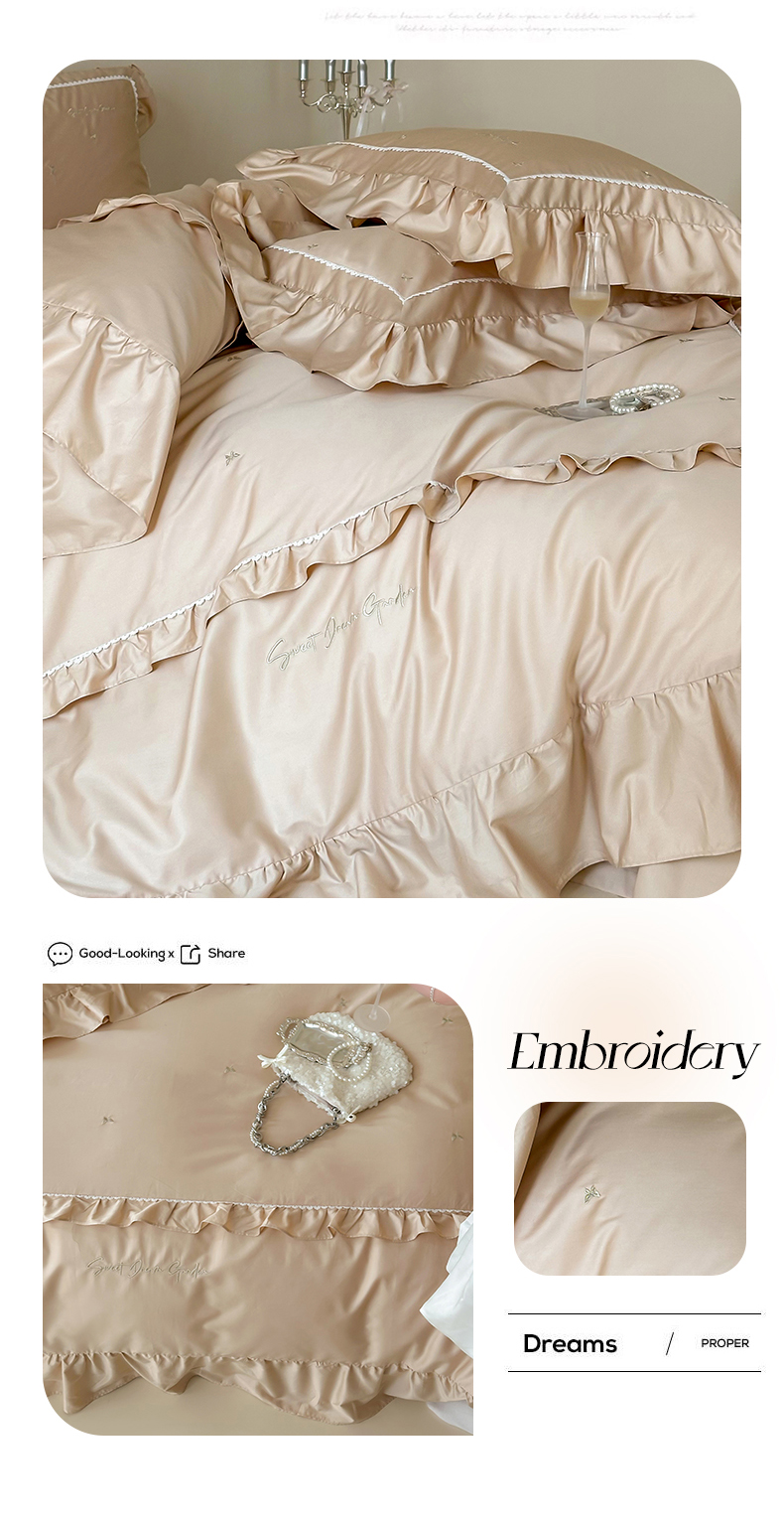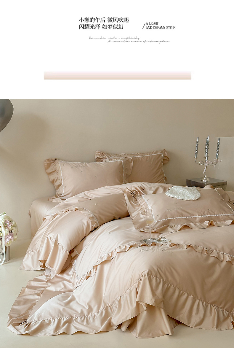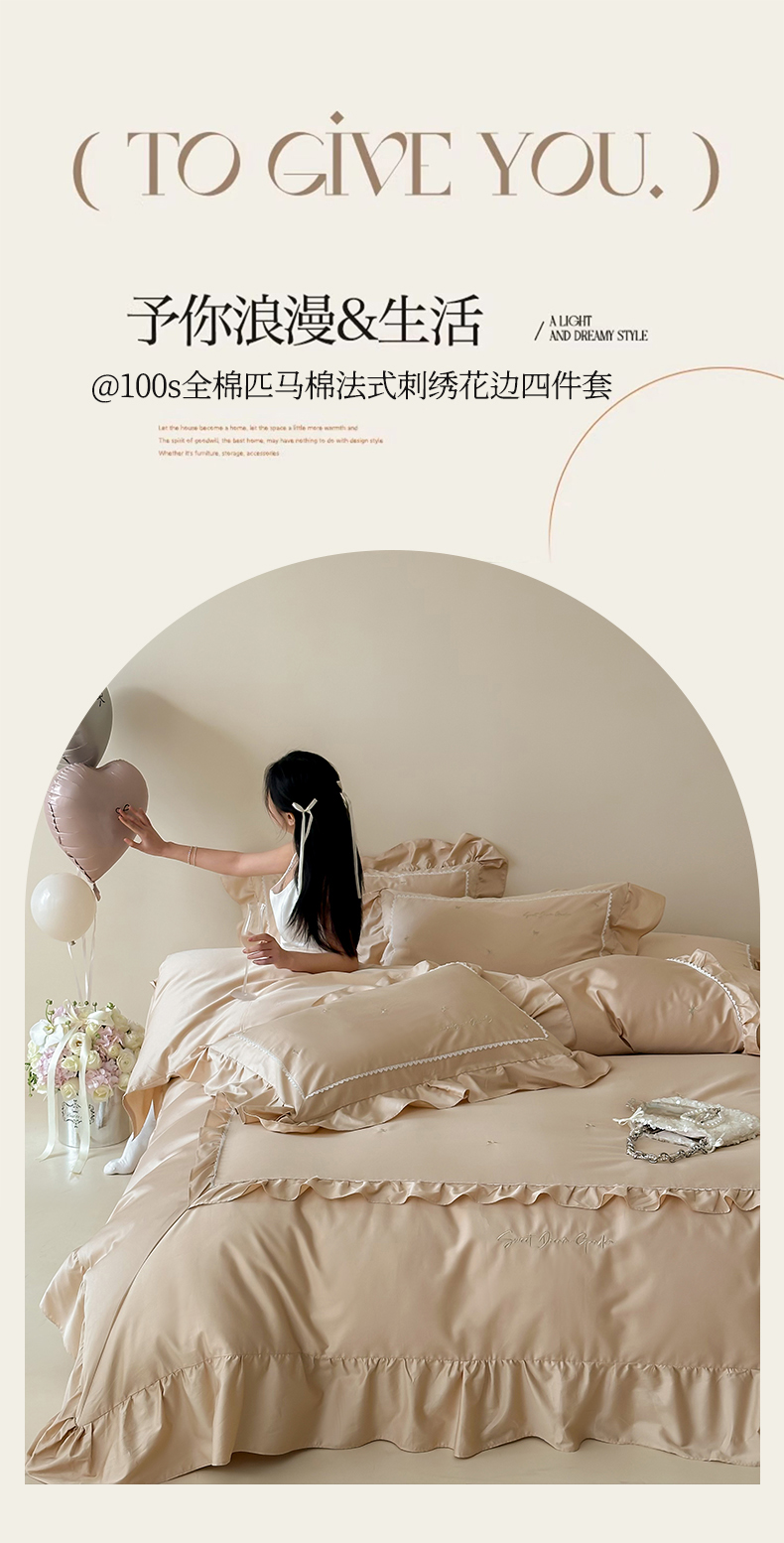 商品名称:红番天家居馆 2025新款全棉纯棉贡缎长绒棉法式刺绣花边四件套-蝶梦 蝶梦-浅香槟