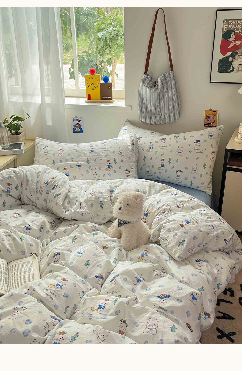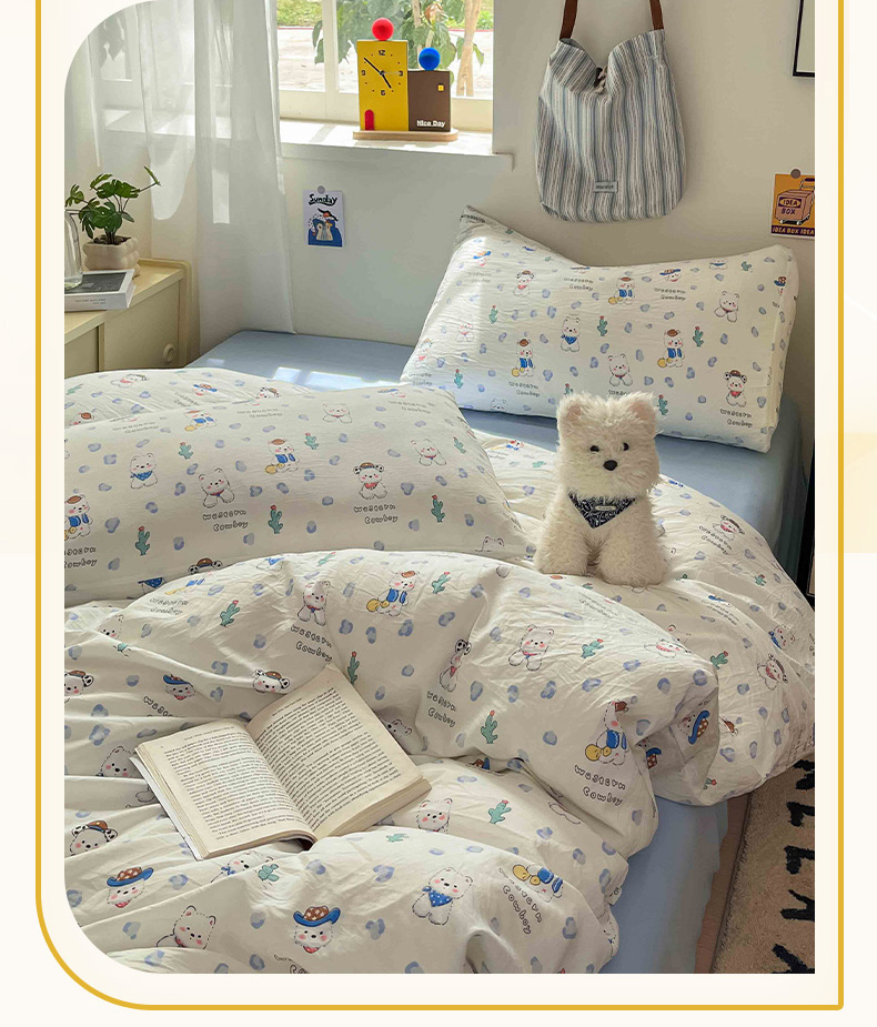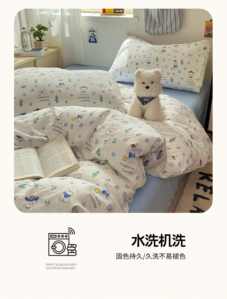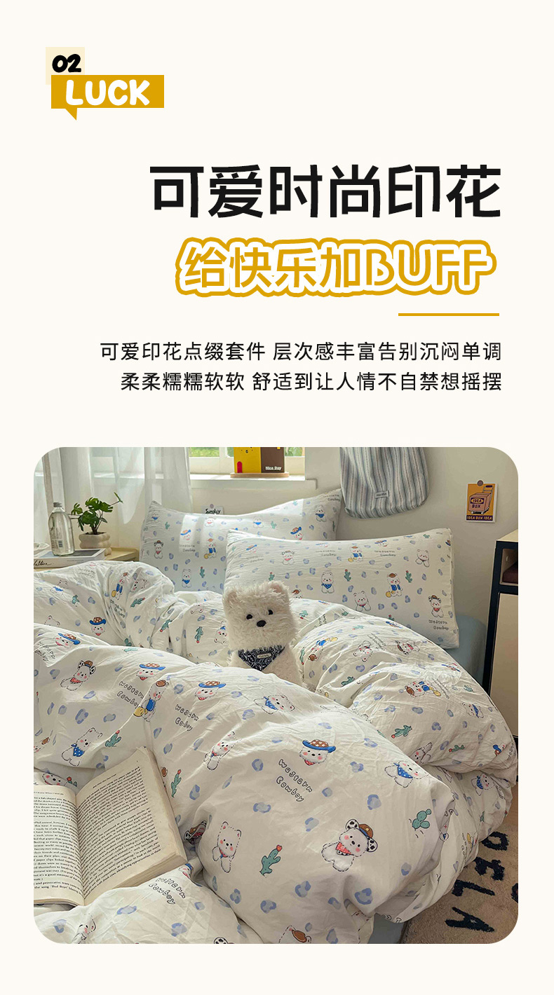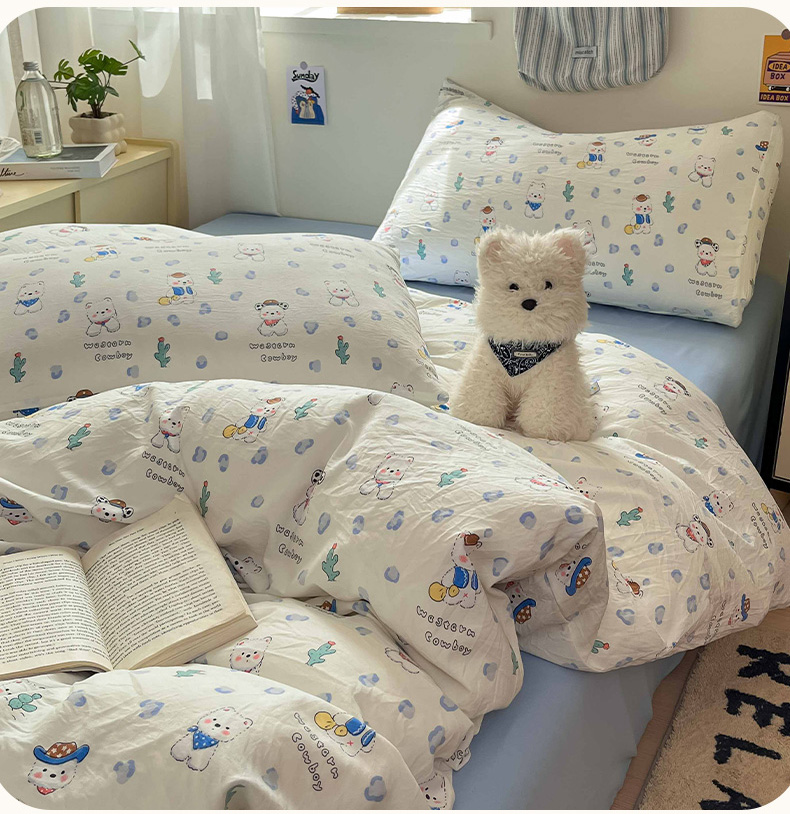 商品名称:罗亿家纺 2025新款软绵绵的双拼印花小清新水洗云朵棉四件套(含买家秀场景二) 小狗安安蓝