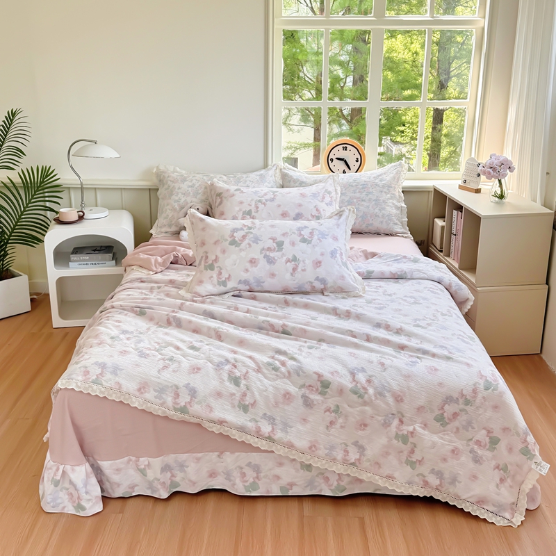 (总)奥虎家纺 2025新款纯棉花边小竹棉夏被四件套,初夏,芳华,花季,花开半夏,花颜,简爱,黎落,蔷薇