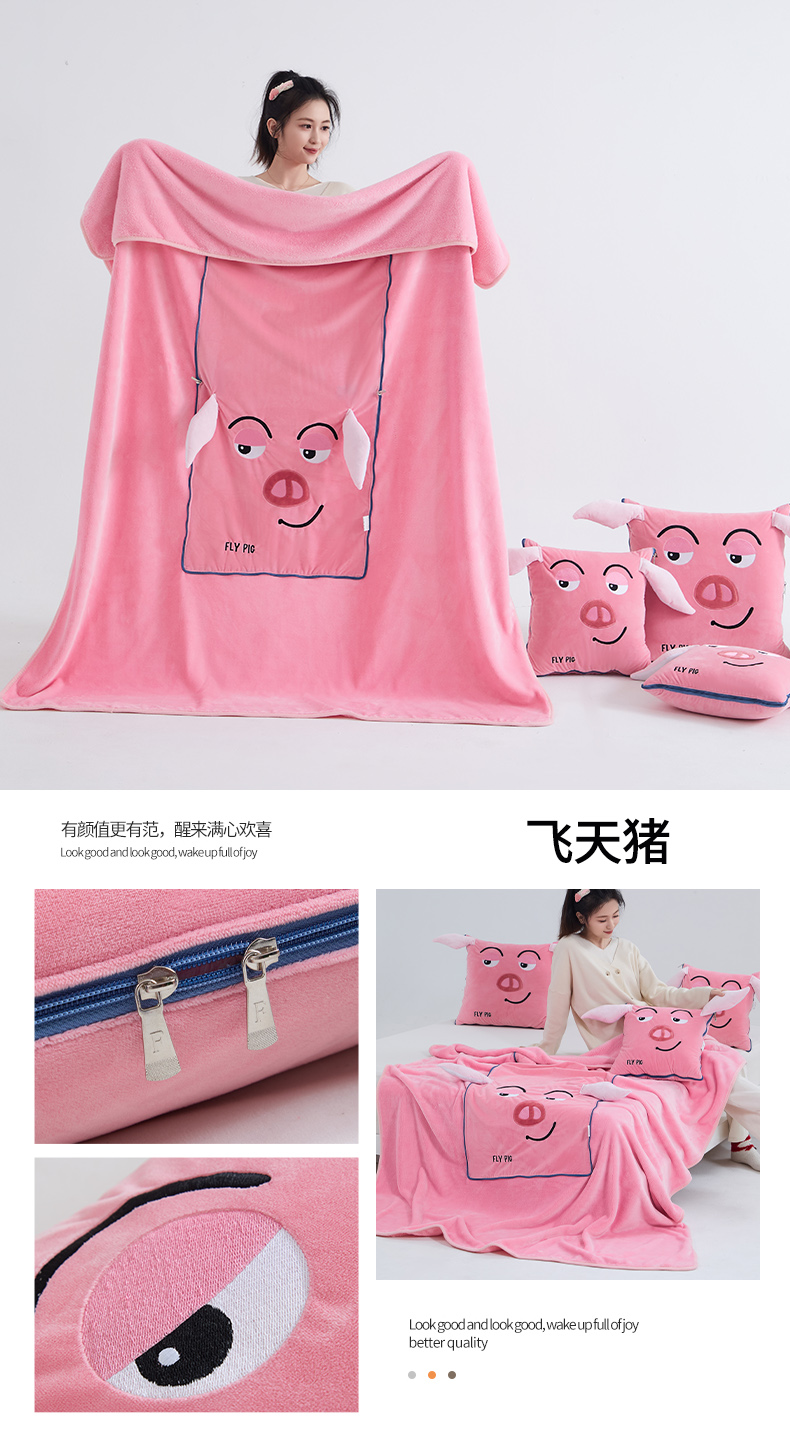 商品名称:吉利家居 2025新款法莱绒贴布立体刺绣抱枕毯 飞天猪