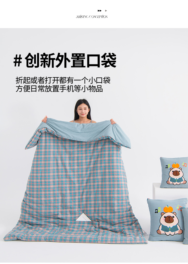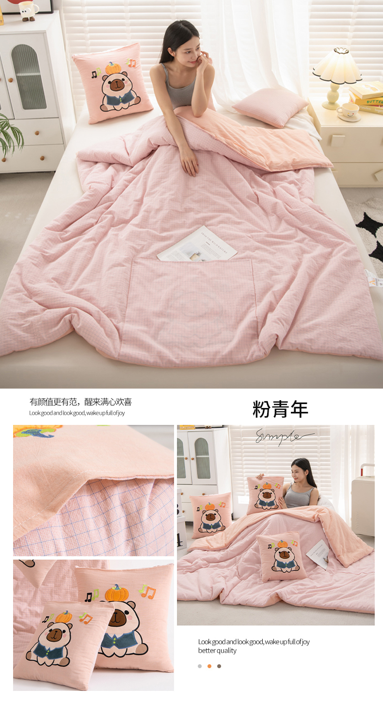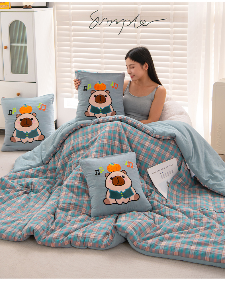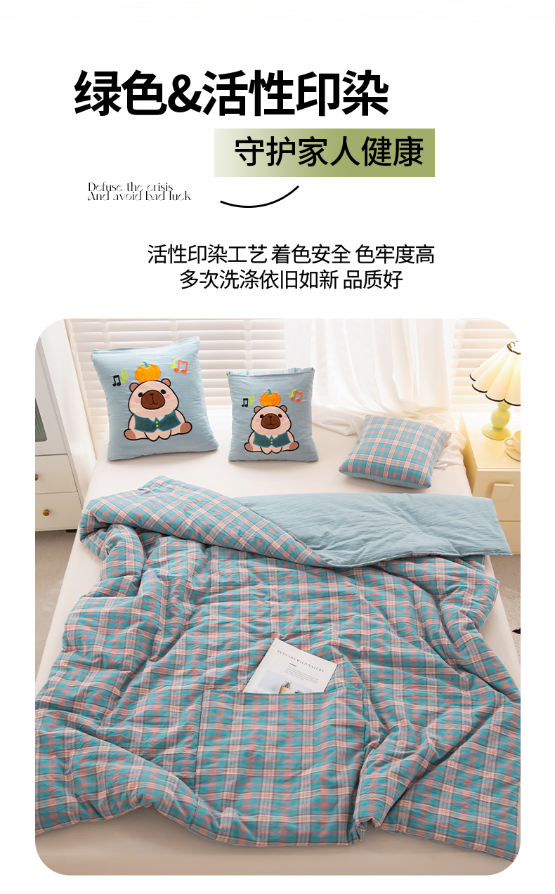 商品名称:吉利家居 2025新款全棉色织水洗抱枕被-卡皮巴拉 控价小号65 大号92 海盐蓝