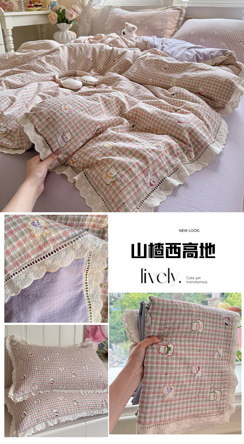 (总)Mata蔓塔家 2025新款云感双层纱全棉镂空花边四件套,草莓心愿,狗狗伙伴,桔梗语,咖啡豆,蓝风铃,落樱小屋,梦境低语,梦疏花影,青花瓷,肉桂,山楂西高地,颂歌,田园诗,兔子琴曲,夏岛,小彩糖,紫蝴蝶