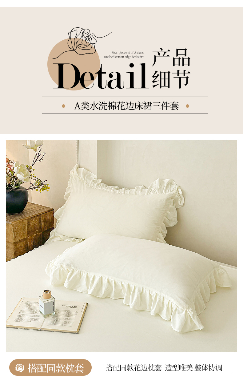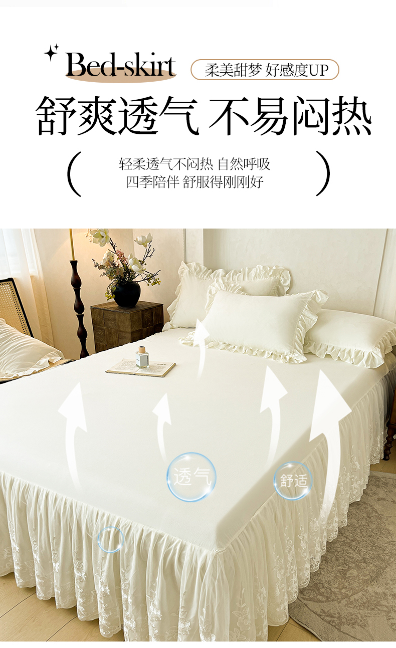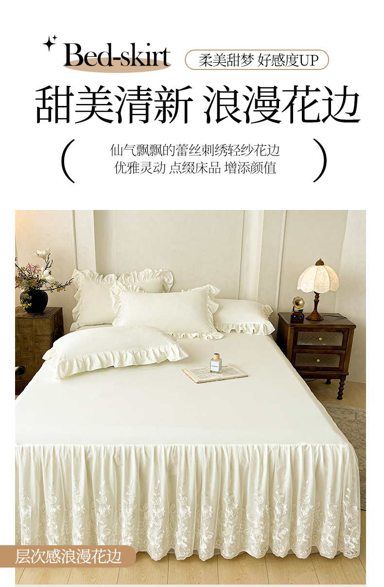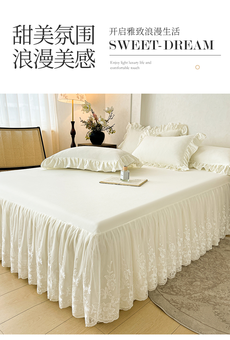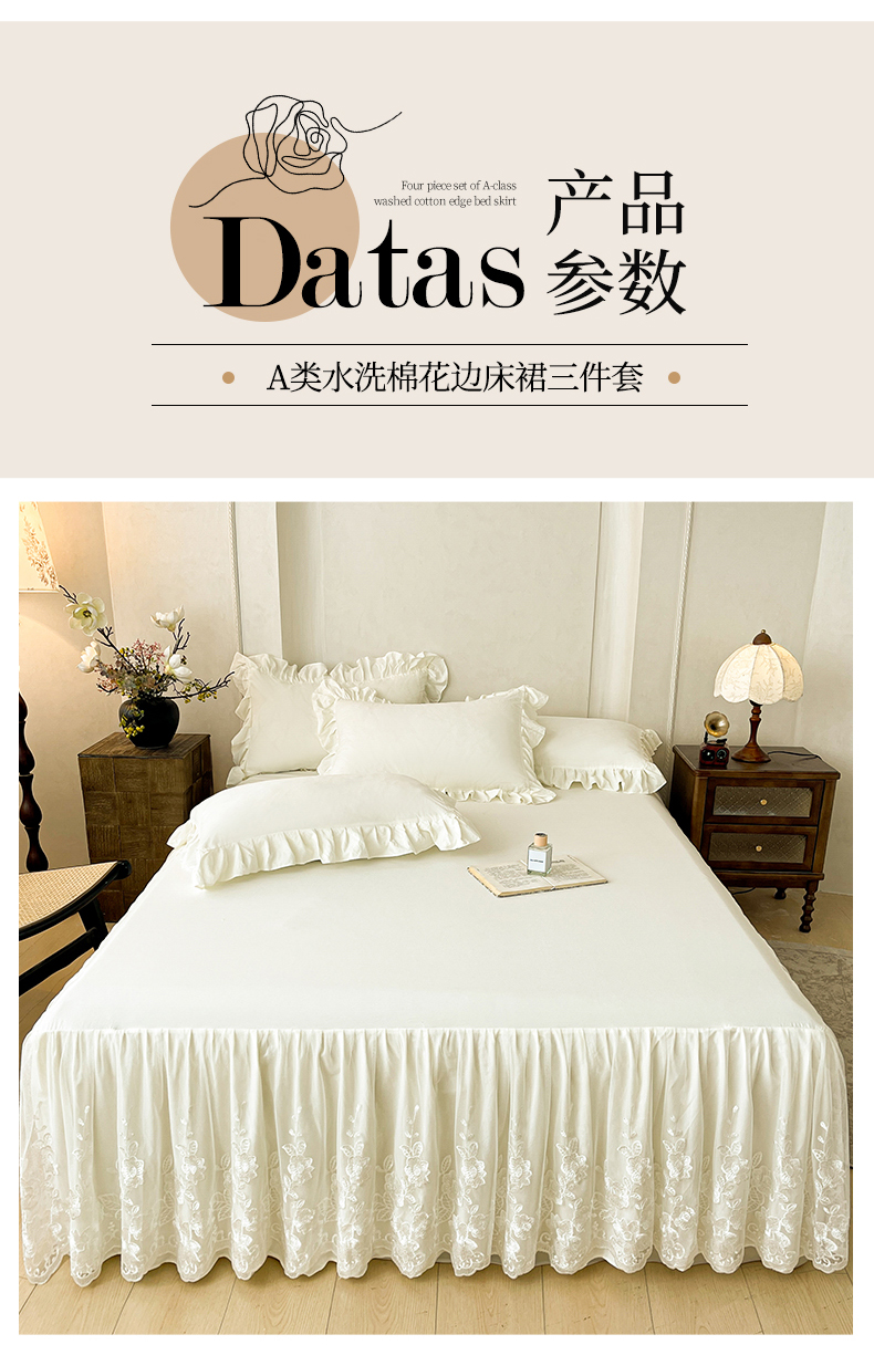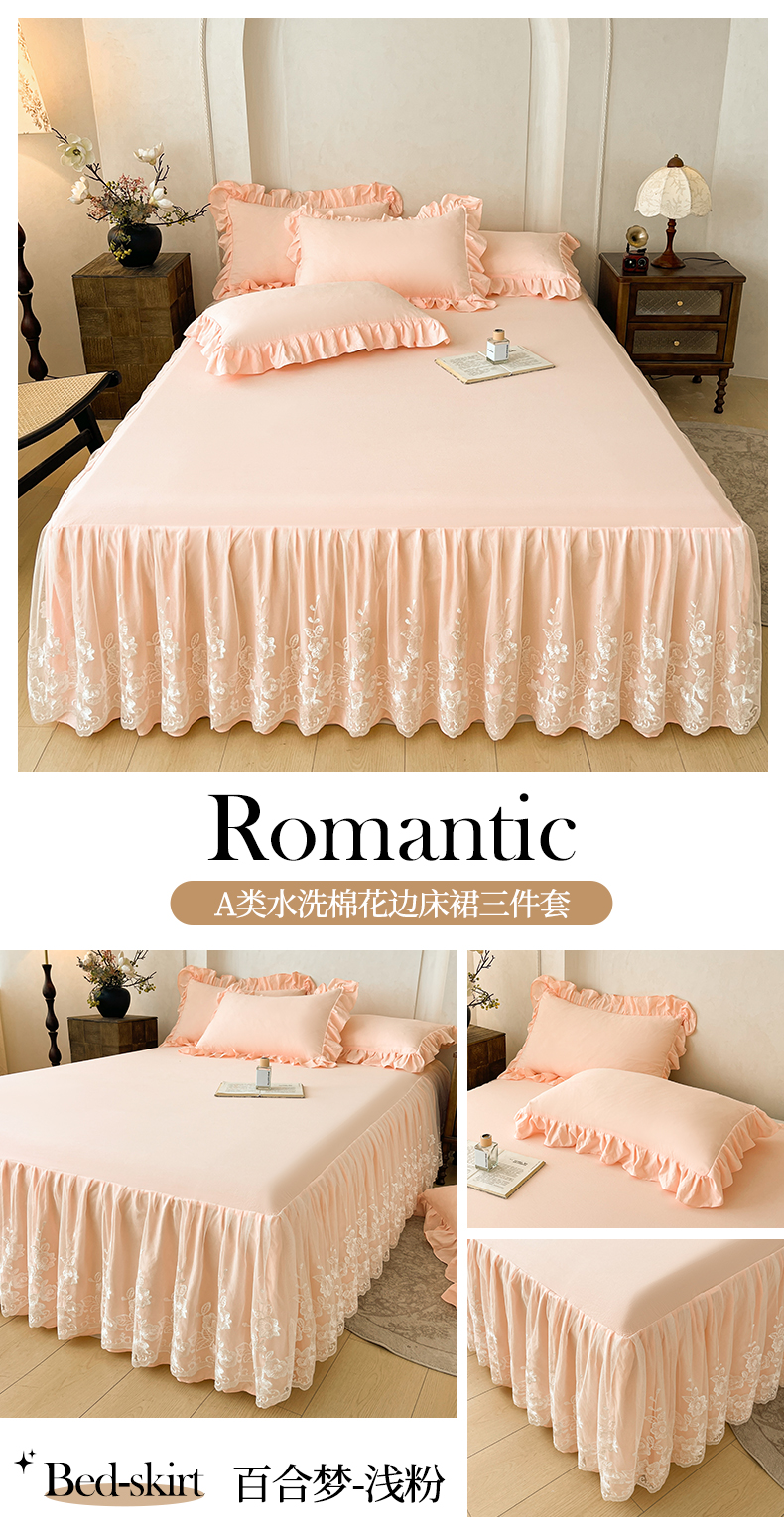 当前位置: 91家纺网 > 商品网购 > 床品套件 > 三件套 > (总)好儿喜家纺 2025新款A类水洗棉花边床裙蕾丝床罩三件套-百合梦