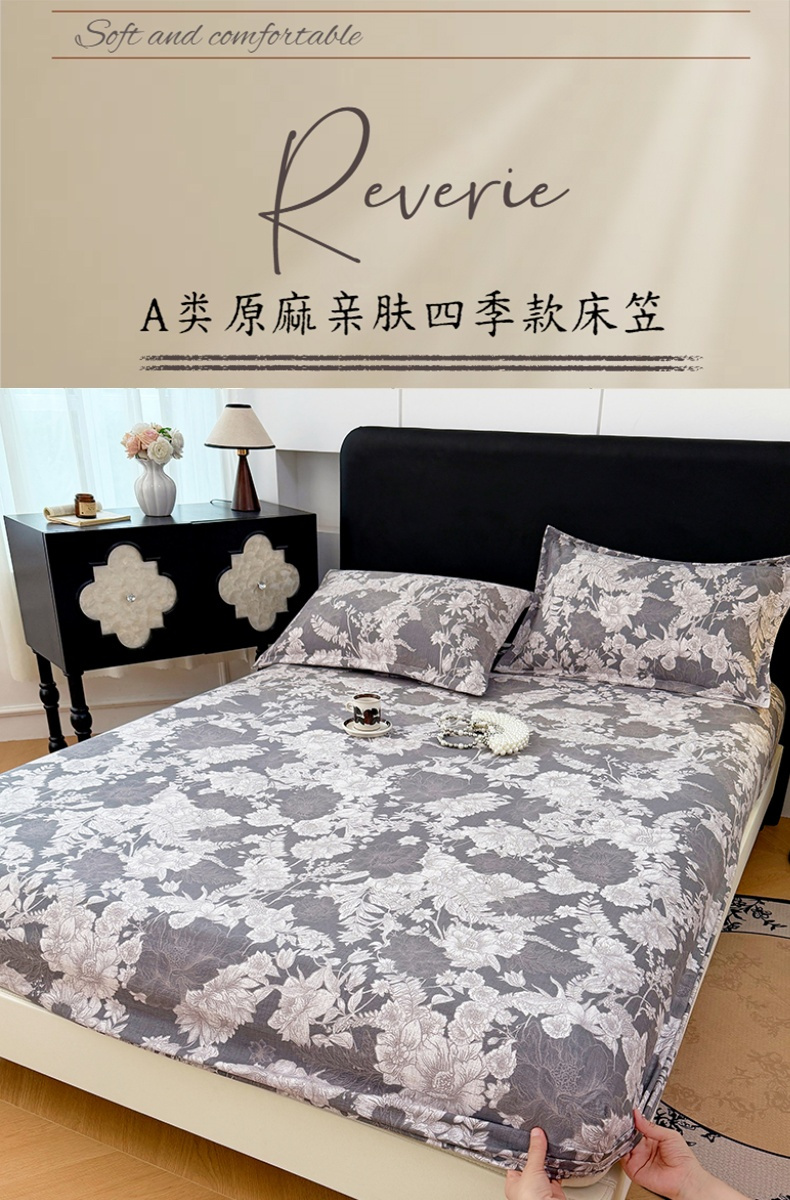 • 91家纺网 家纺一手货源 找家纺 圣比熊 2025新款原麻床笠机洗家用防滑透气四季款床罩床垫床单保护套 浮绘花影-白