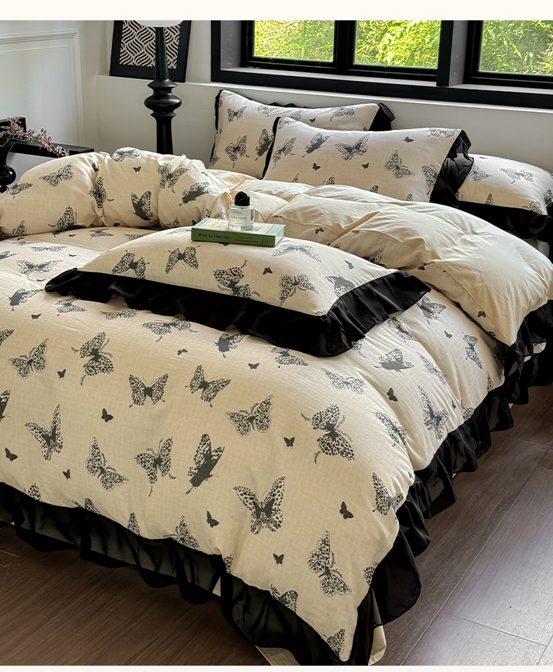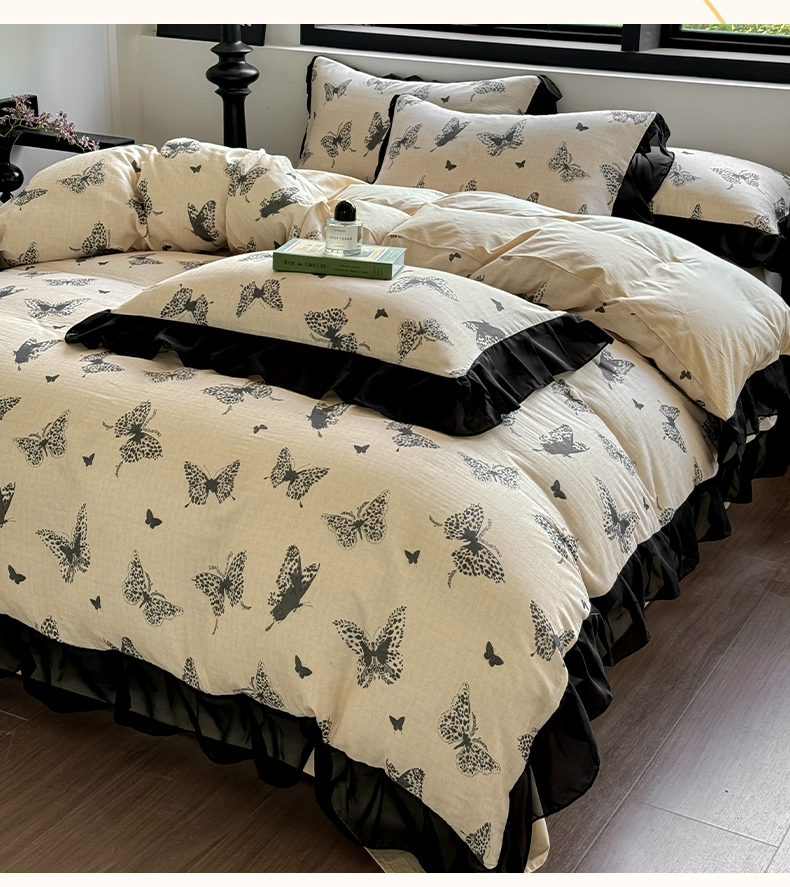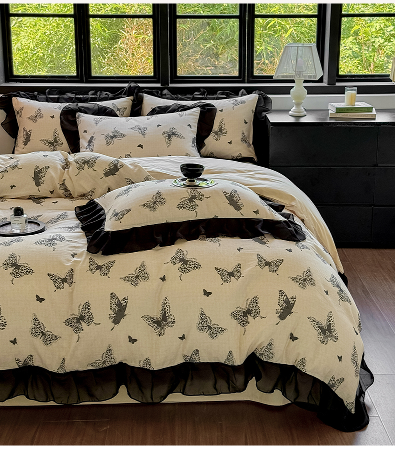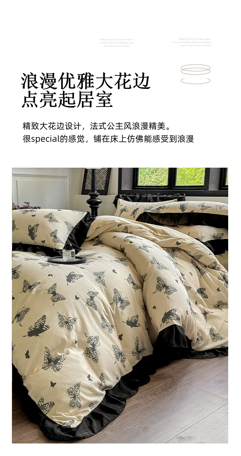 商品名称:宅家居 2025新款A类轻法式复古赫本风全棉纯棉有氧双层纱花边四件套黑色韩式花边三件套 蝶影