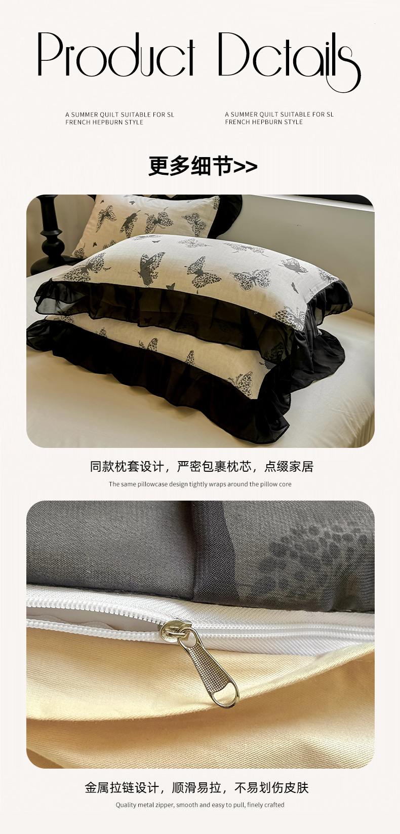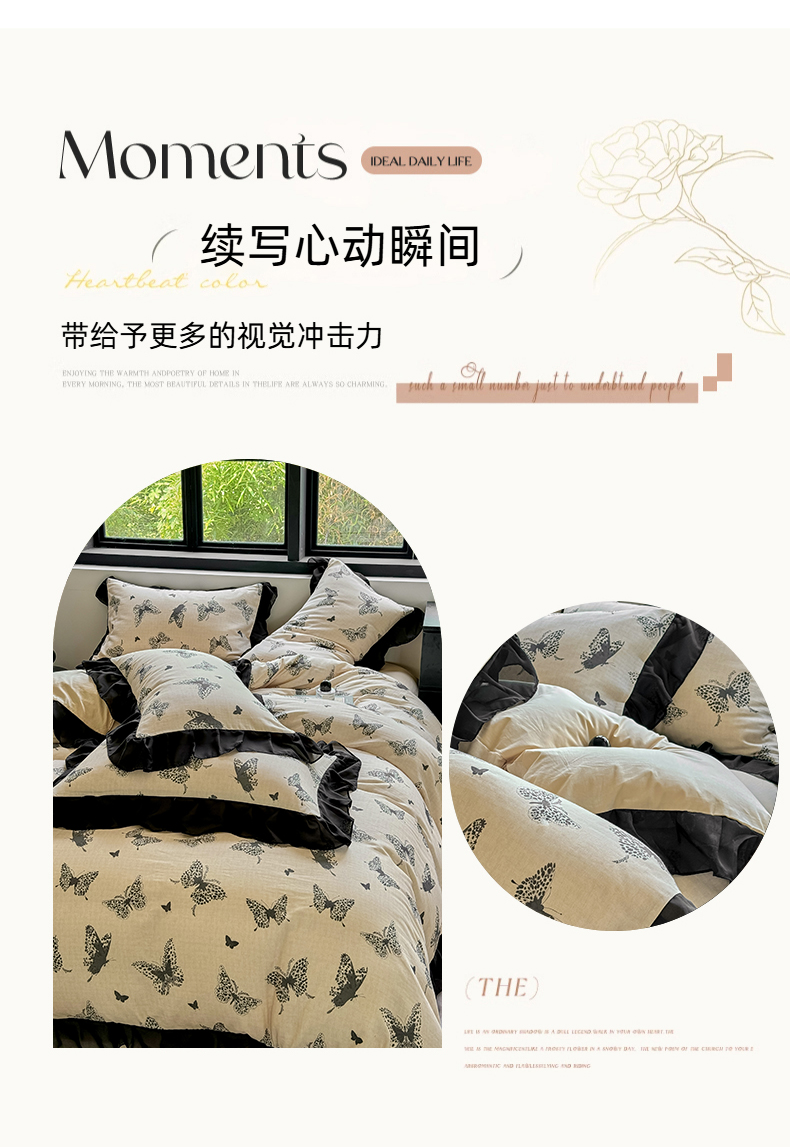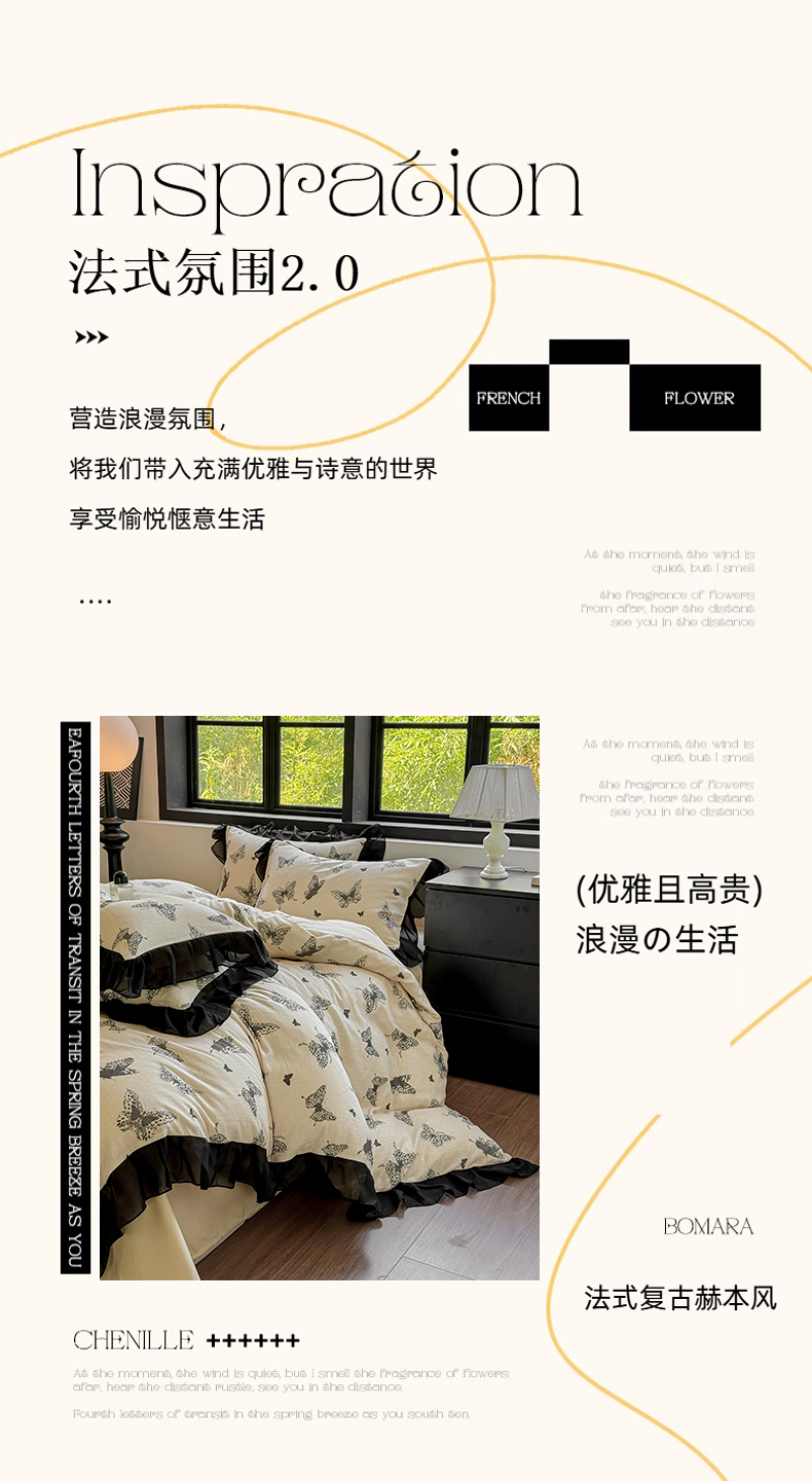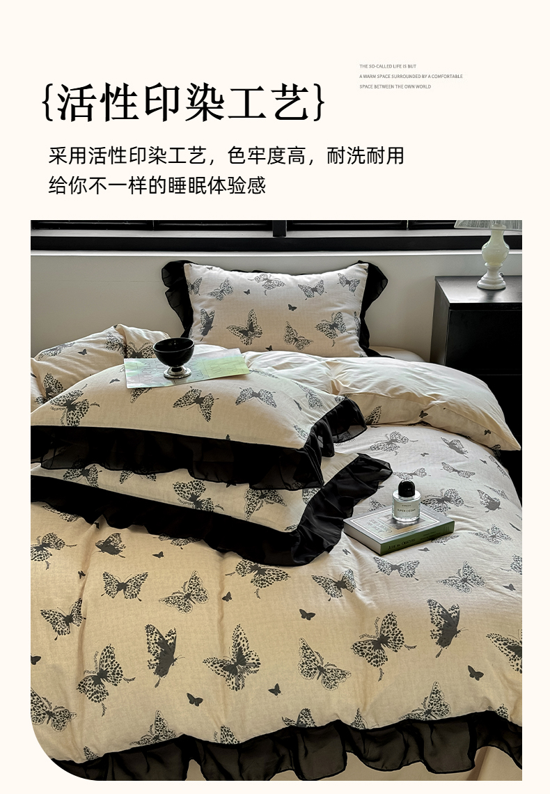 商品名称:宅家居 2025新款A类轻法式复古赫本风全棉纯棉有氧双层纱花边四件套黑色韩式花边三件套 蝶影