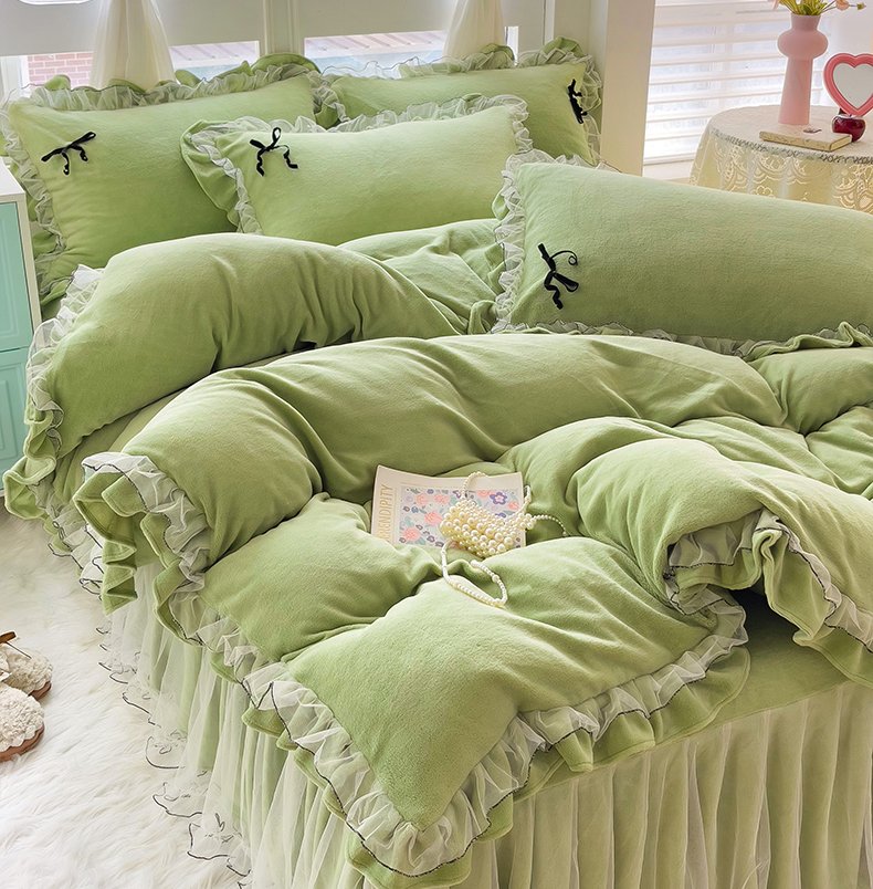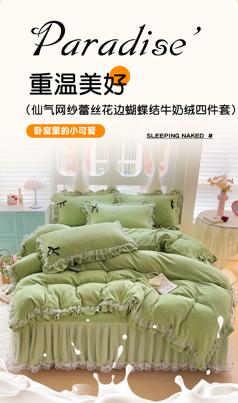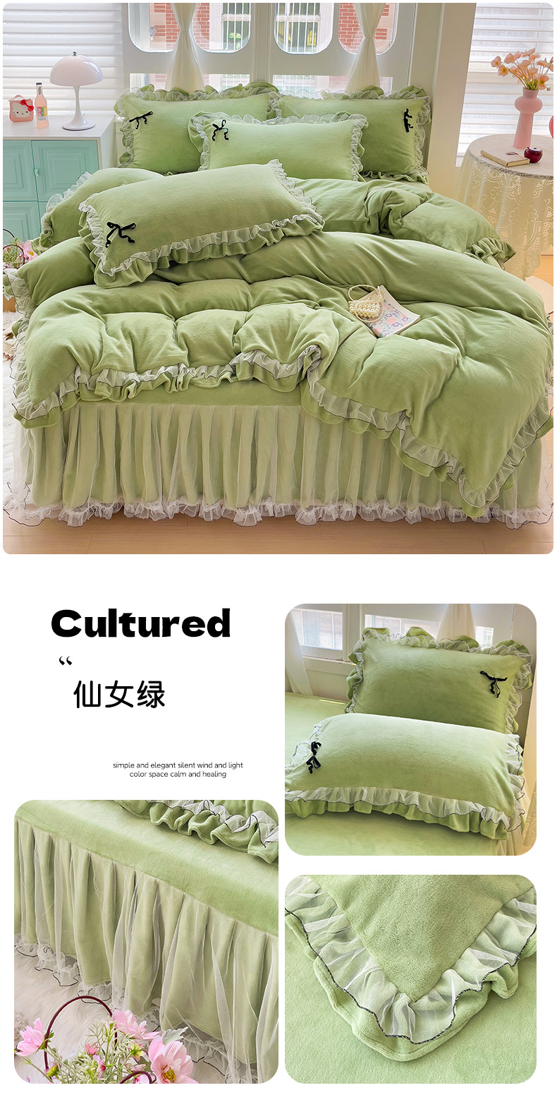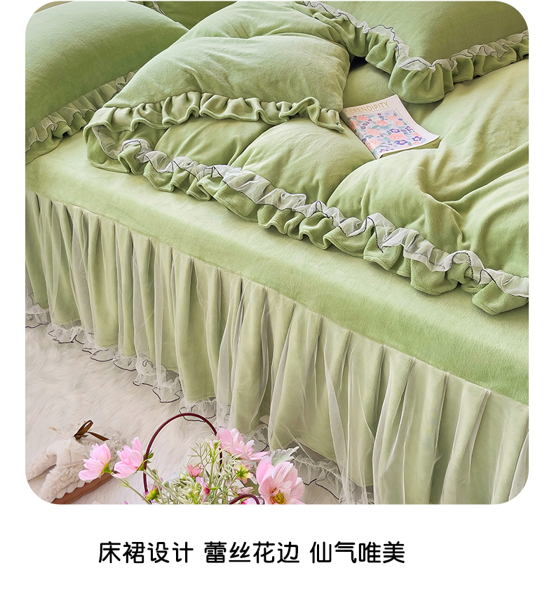 商品名称:言熙居家纺 2025新款仙气网纱蕾丝花边蝴蝶结牛奶绒四件套 仙女绿