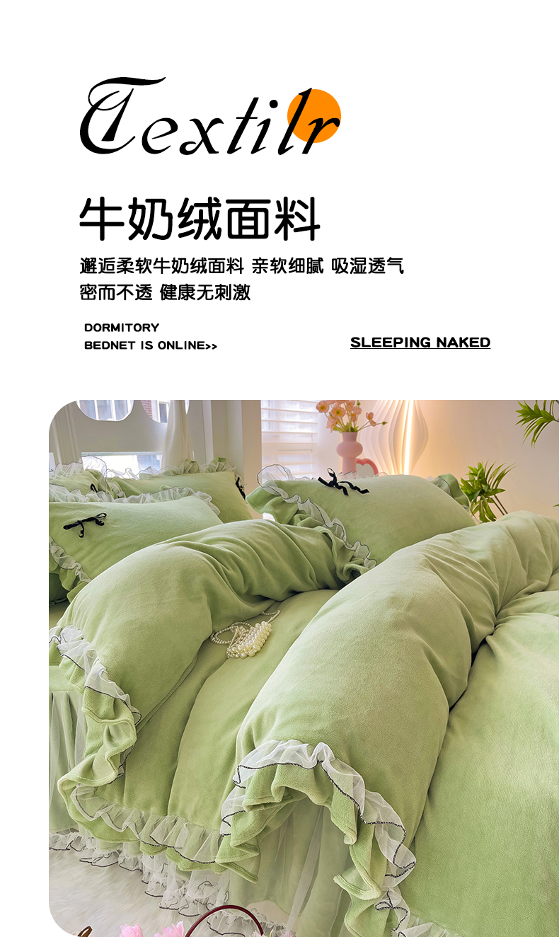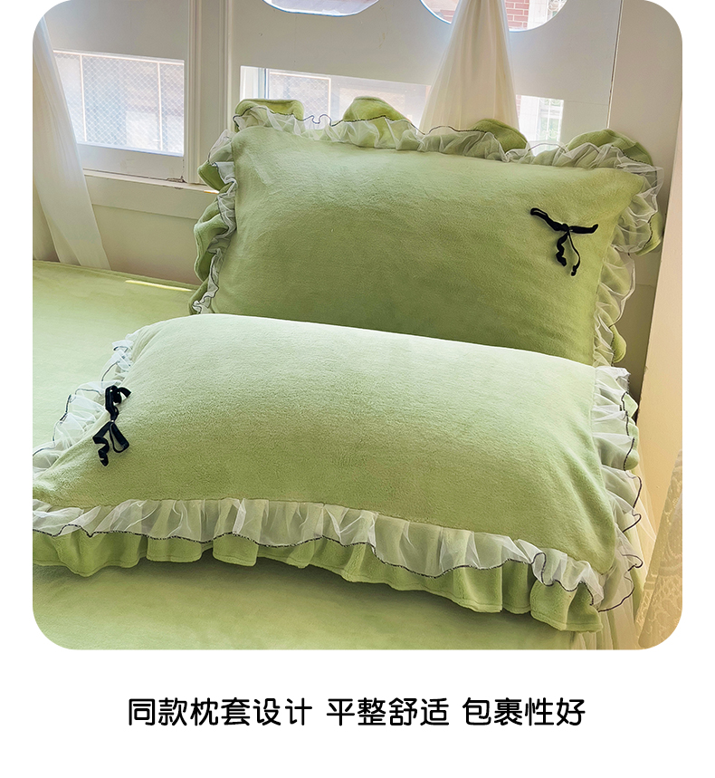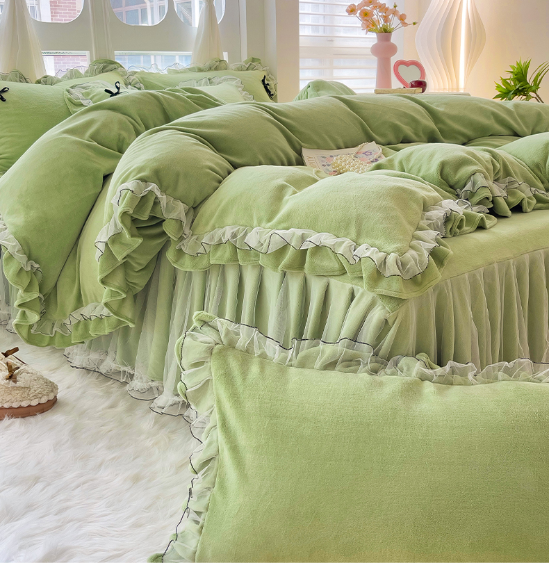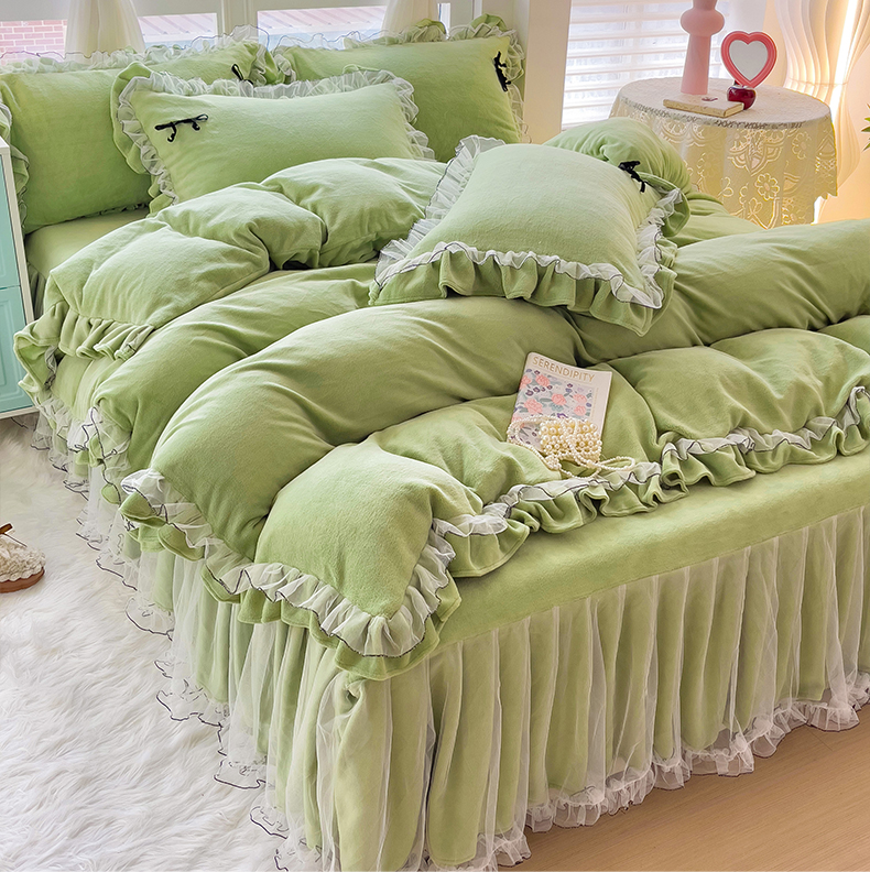 商品名称:言熙居家纺 2025新款仙气网纱蕾丝花边蝴蝶结牛奶绒四件套 仙女绿