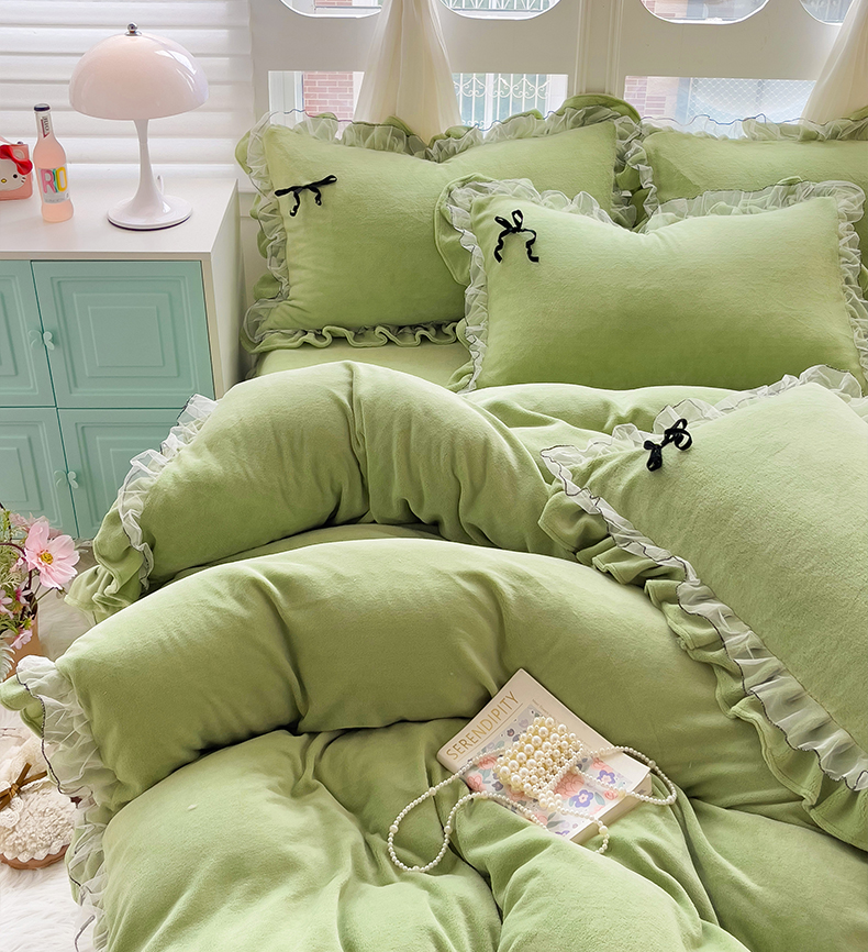 言熙居家纺 2025新款仙气网纱蕾丝花边蝴蝶结牛奶绒四件套 仙女绿