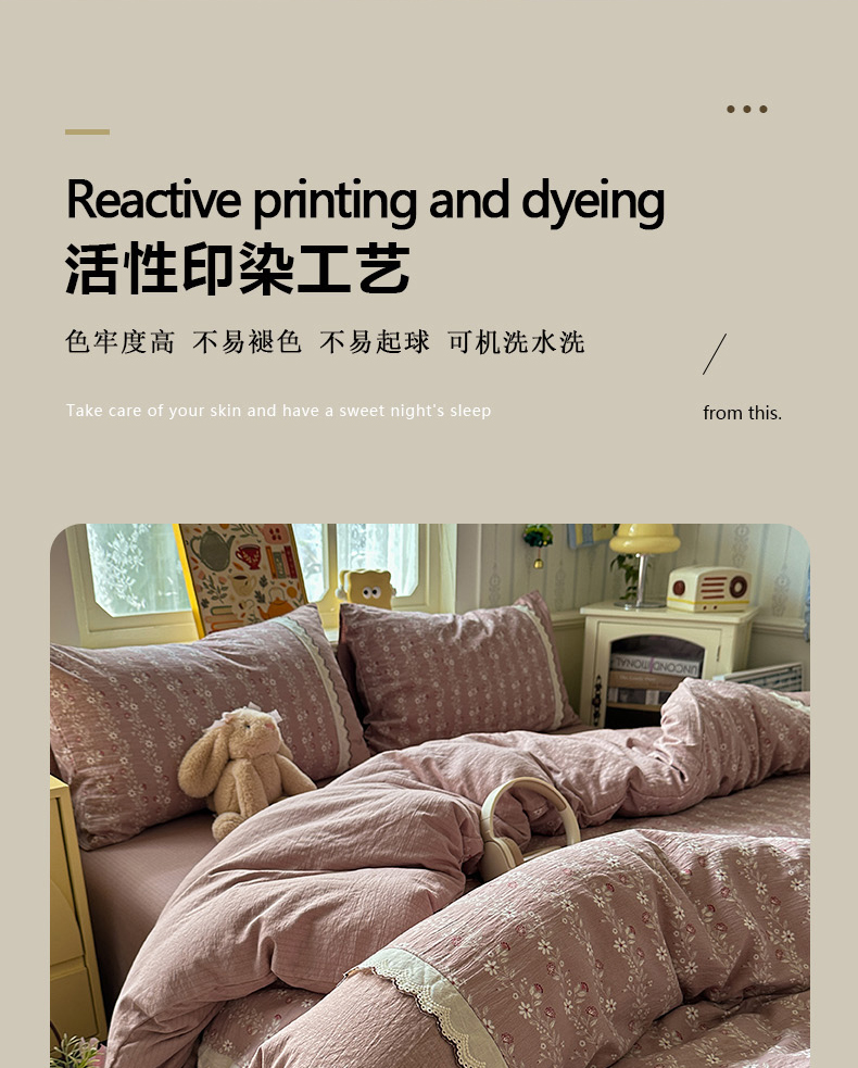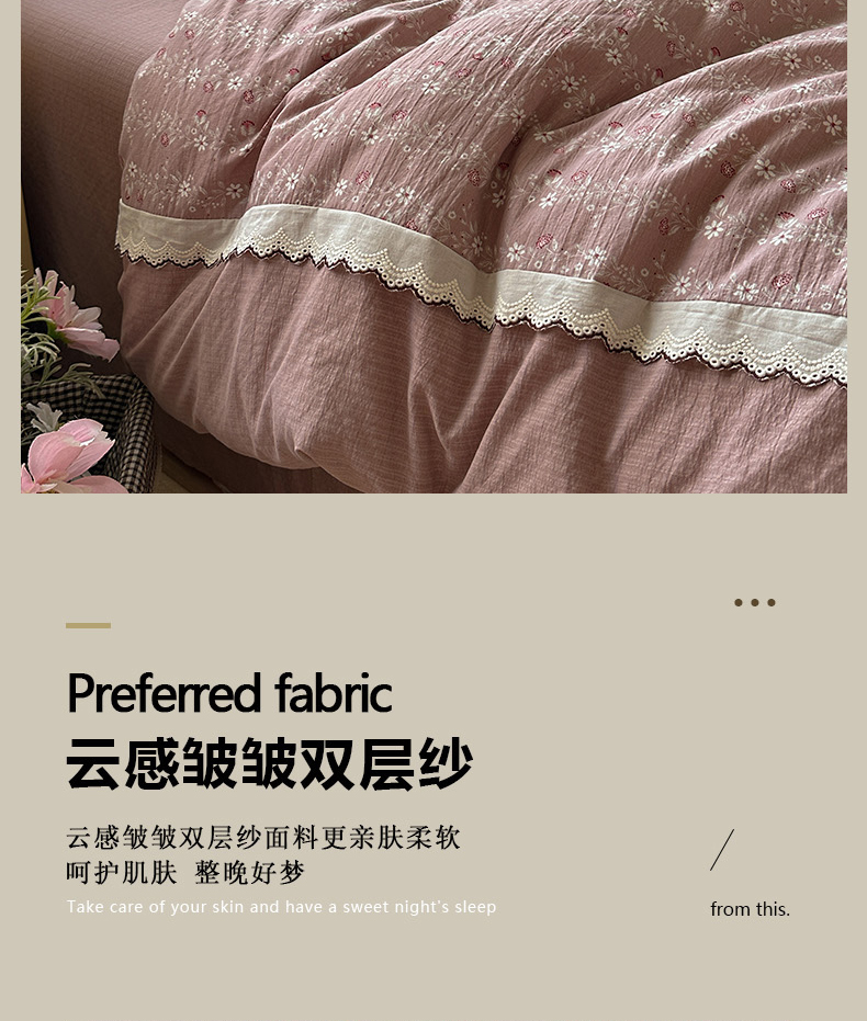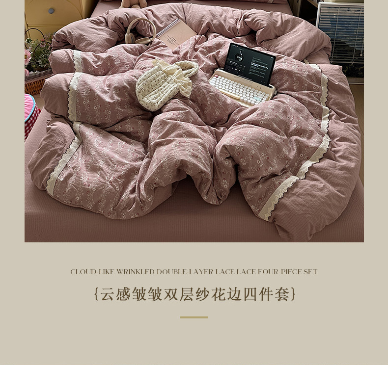 当前位置: 91家纺网 > 商品网购 > 床品套件 > 四件套 > 全棉普通四件套 > 水墨江南 2025新款云感皱皱纱全棉花边四件套场景一 花边款-花枝