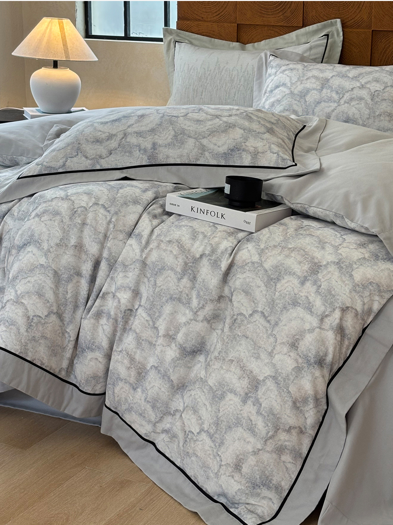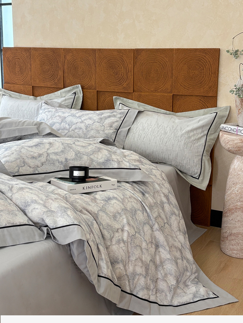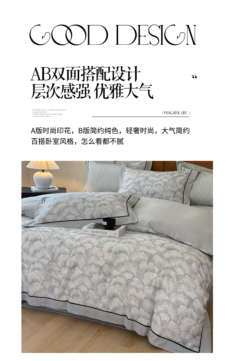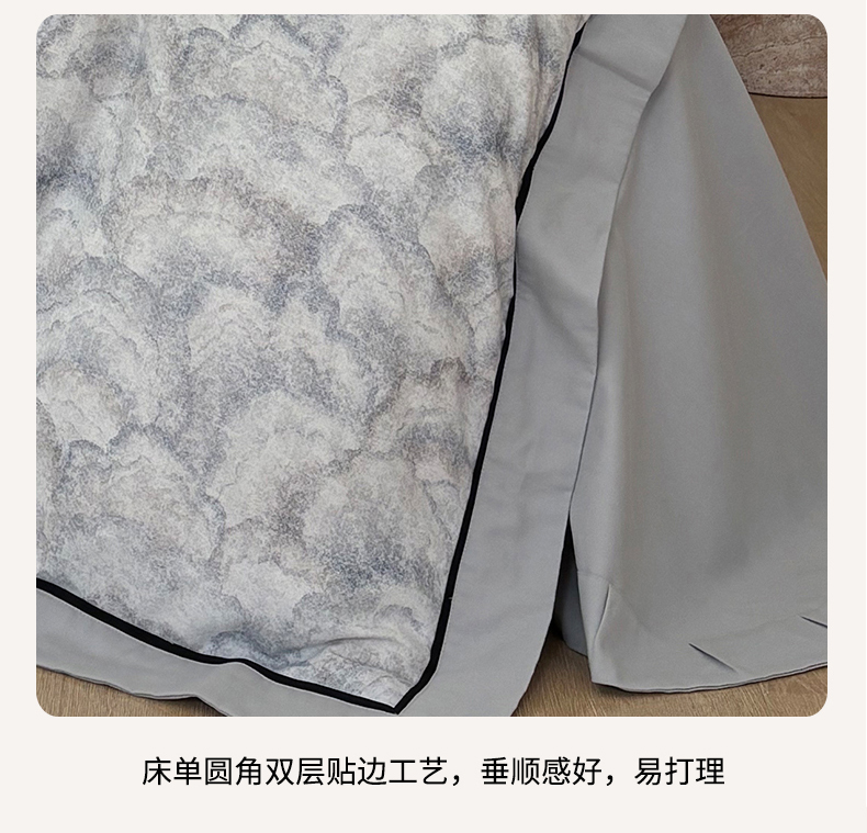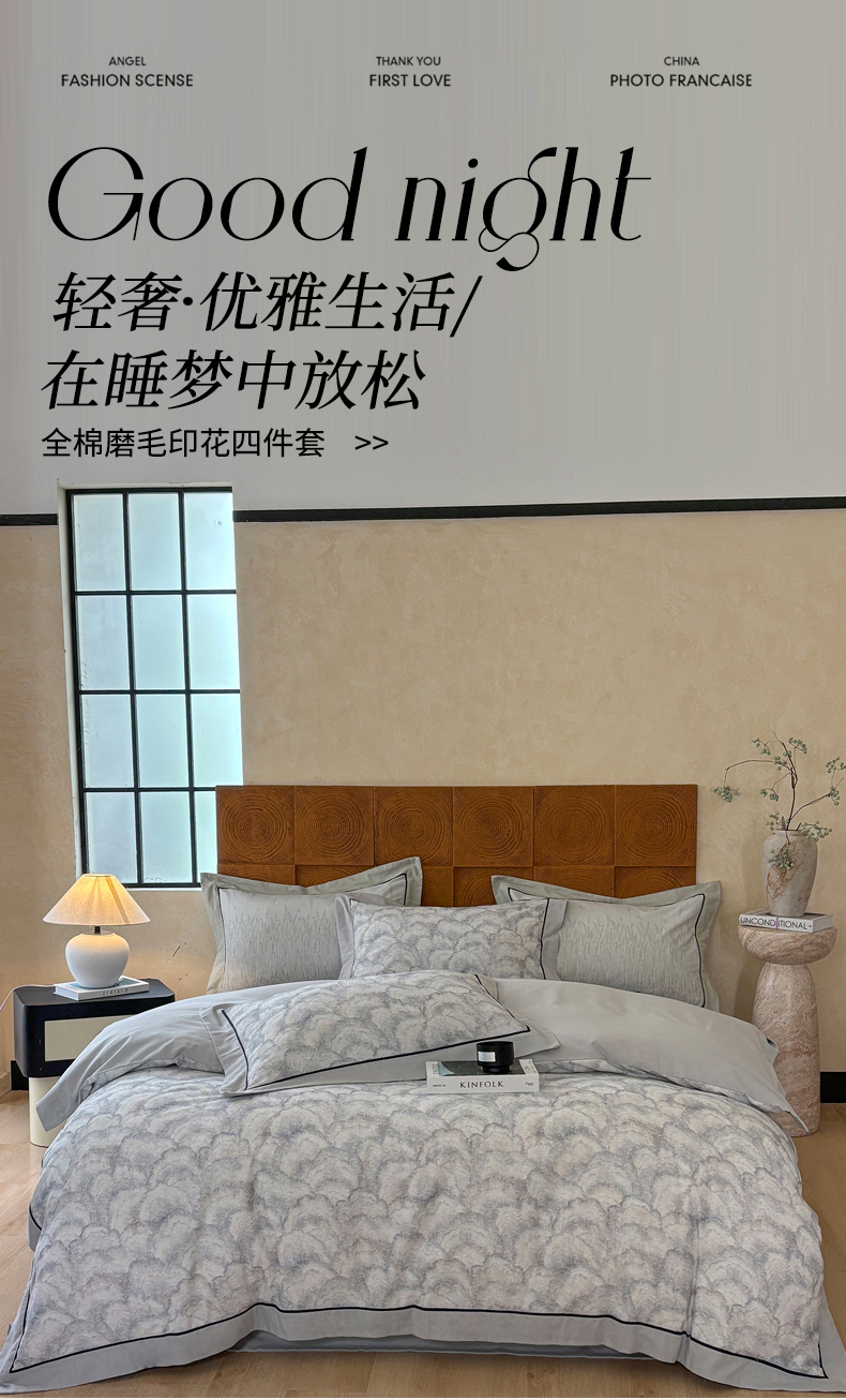 商品名称:嘉汀兰2025新款全棉臻品磨毛轻奢时尚秋冬加厚四件套-拼角款 雾林-浅灰