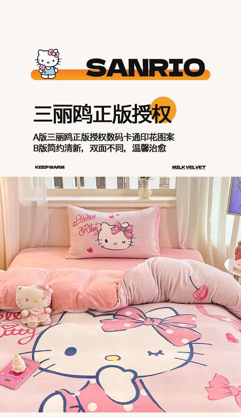 商品名称:(总)金爱家 2025新款正版三丽鸥授权大版卡通平网数码印花加厚高克重牛奶绒系列四件套-第一批