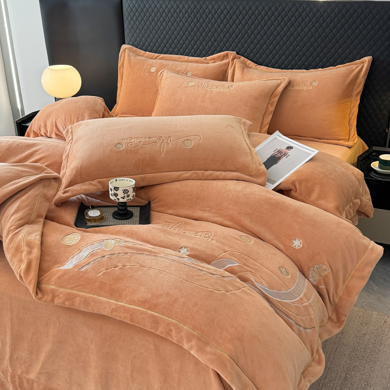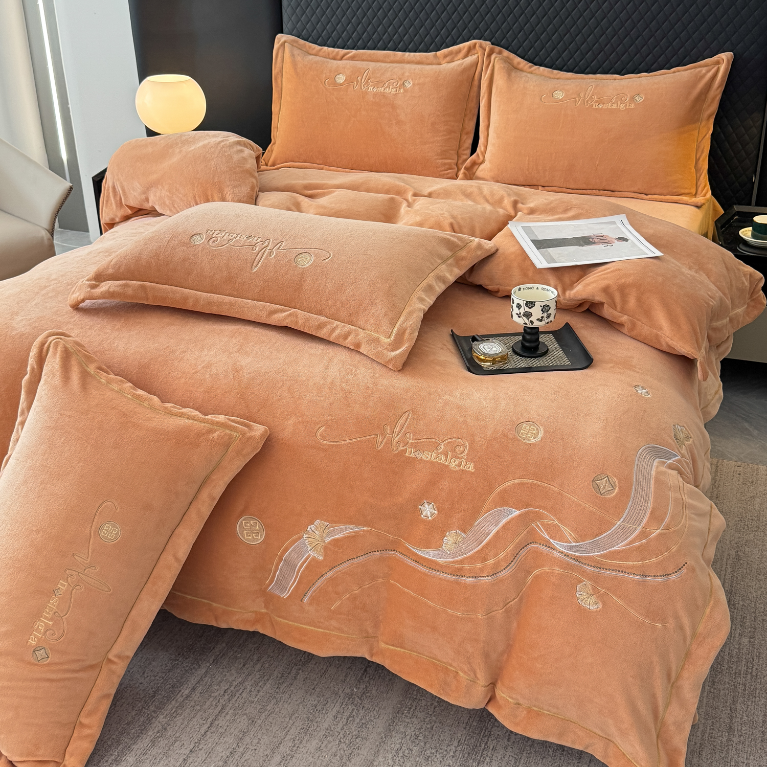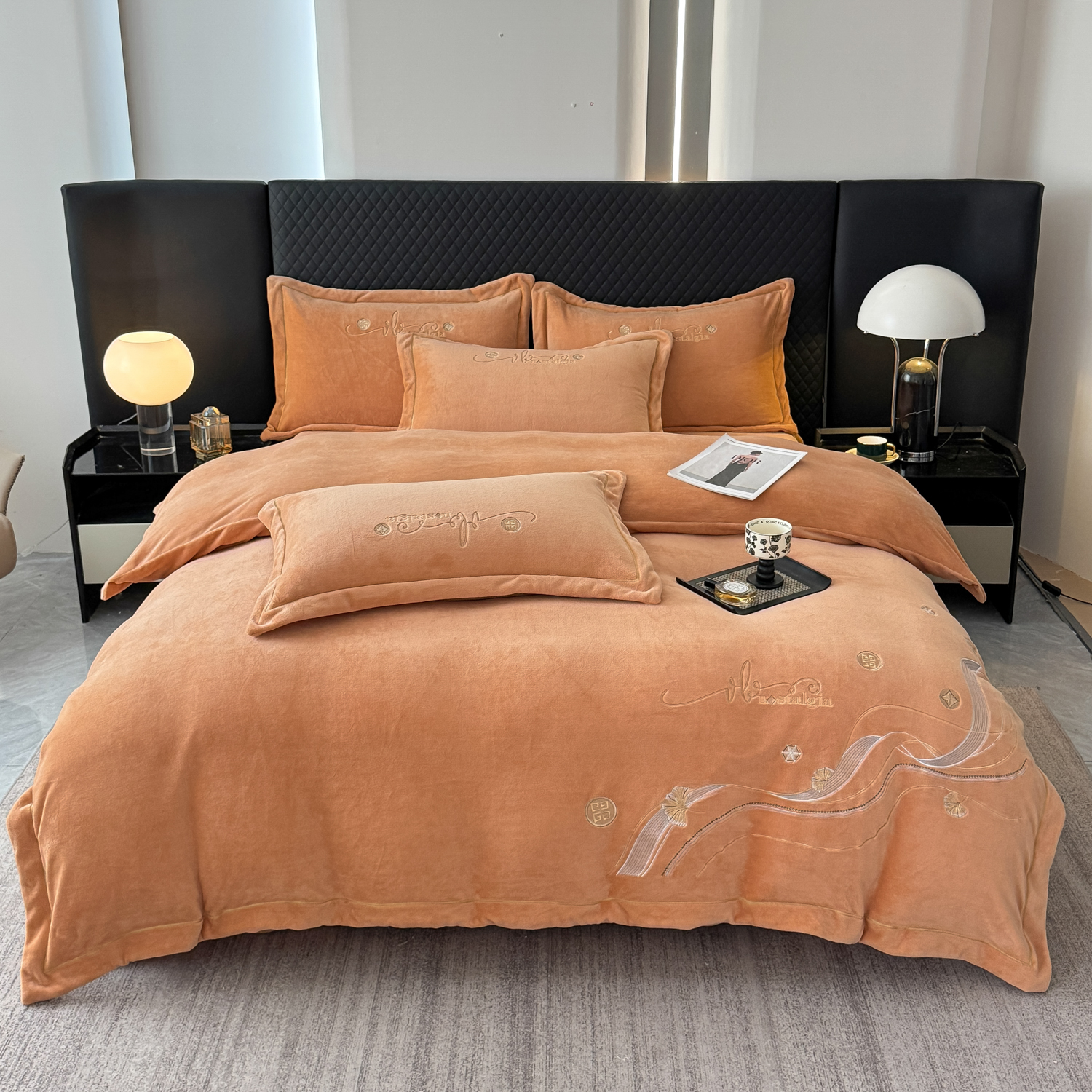 慕克斯 2025直播新款高克重8.5斤纯色刺绣牛奶绒四件套 朝花夕拾-浅橘,朝花夕拾-浅橘