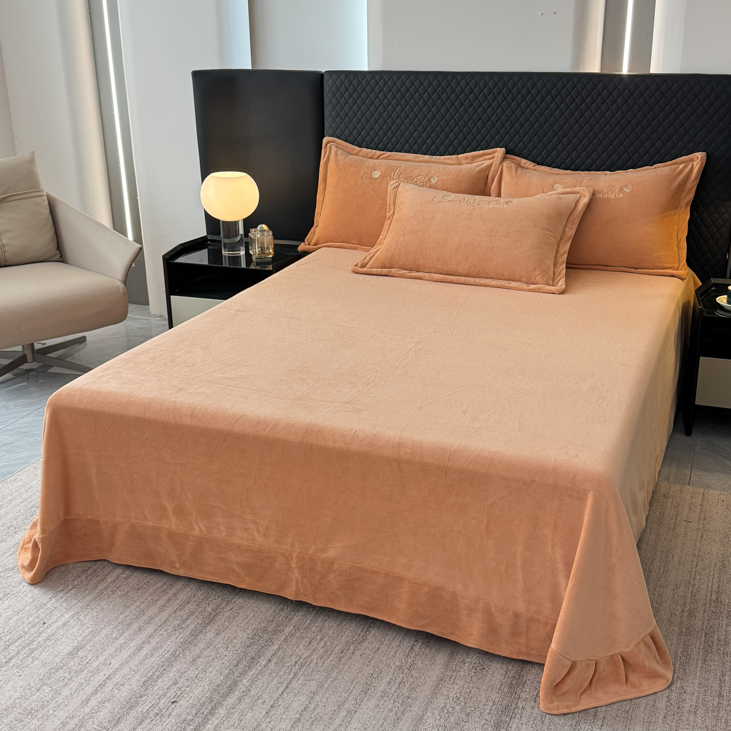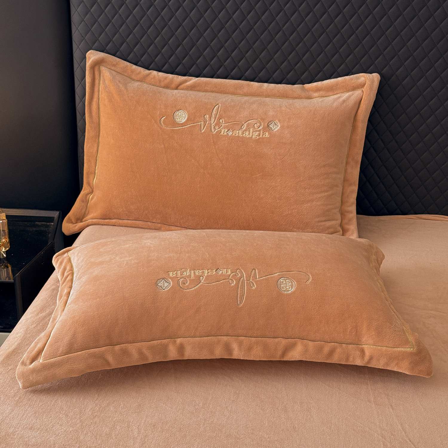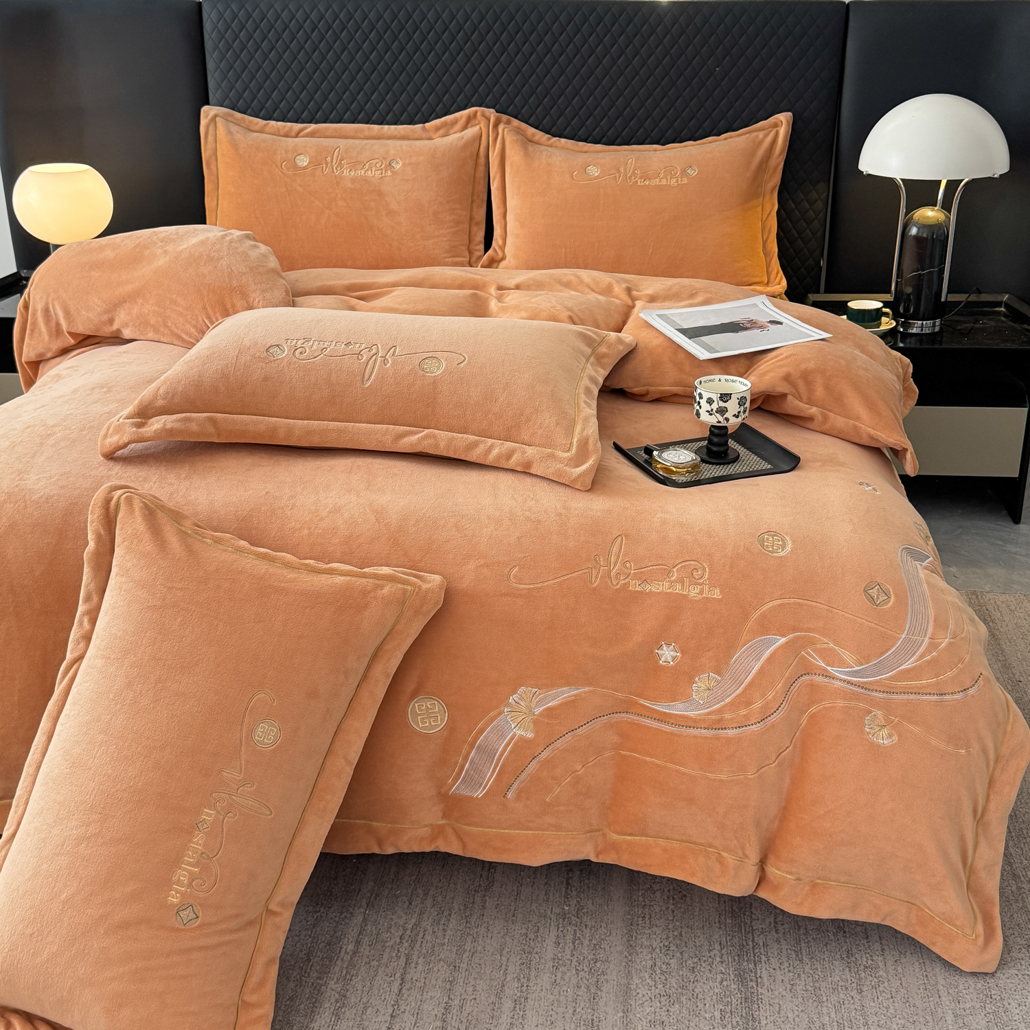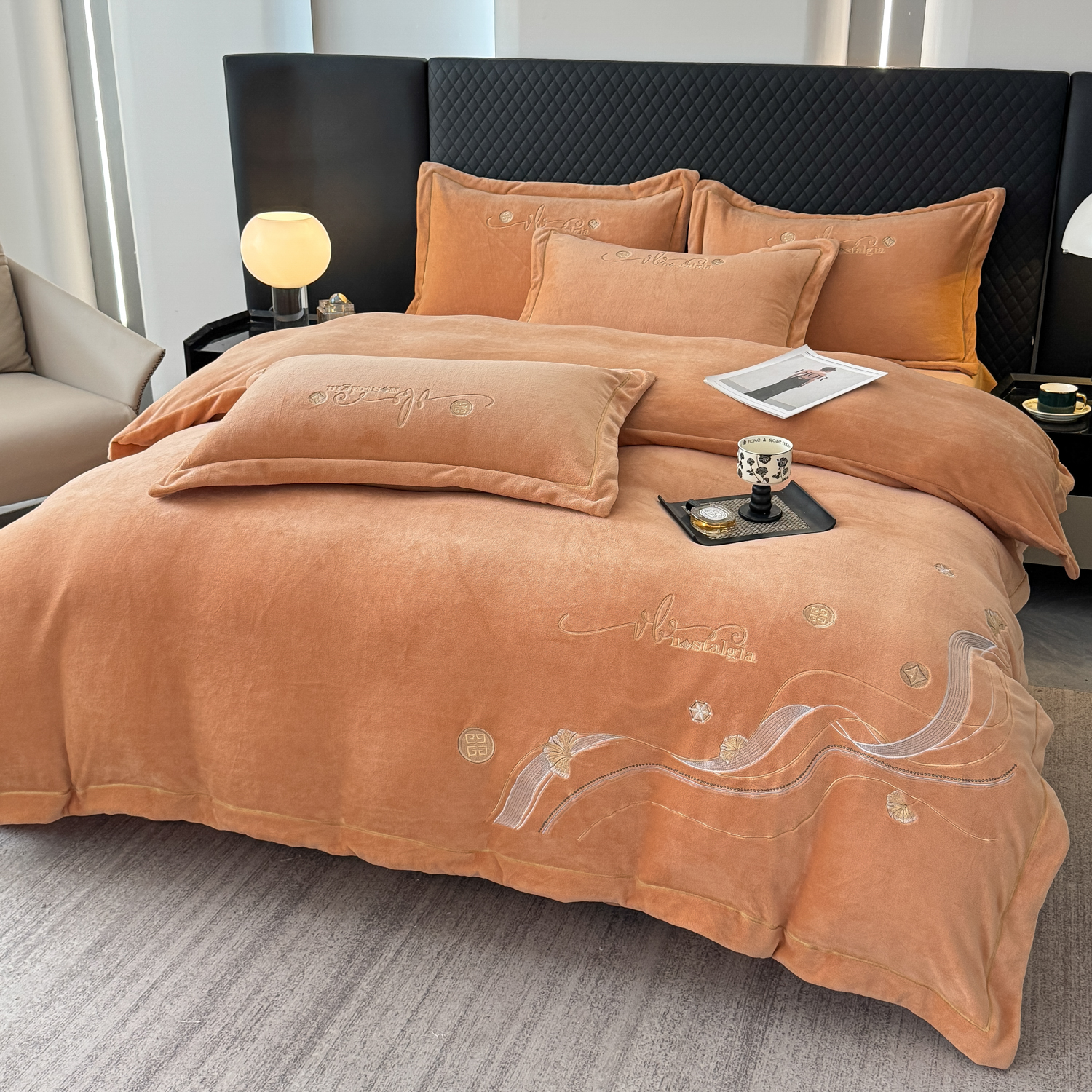 慕克斯 2025直播新款高克重8.5斤纯色刺绣牛奶绒四件套 朝花夕拾-浅橘,朝花夕拾-浅橘