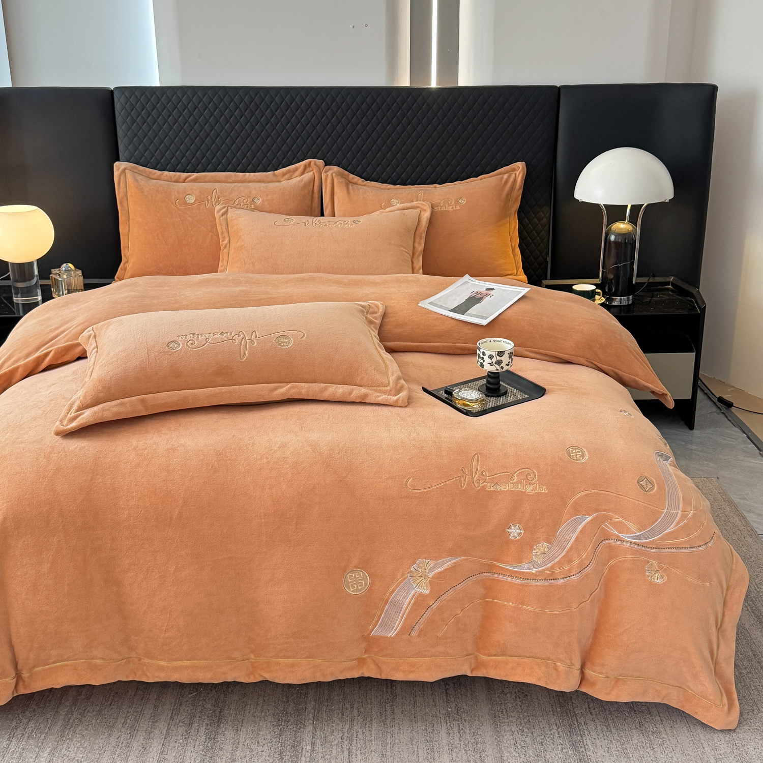 慕克斯 2025直播新款高克重8.5斤纯色刺绣牛奶绒四件套 朝花夕拾-浅橘