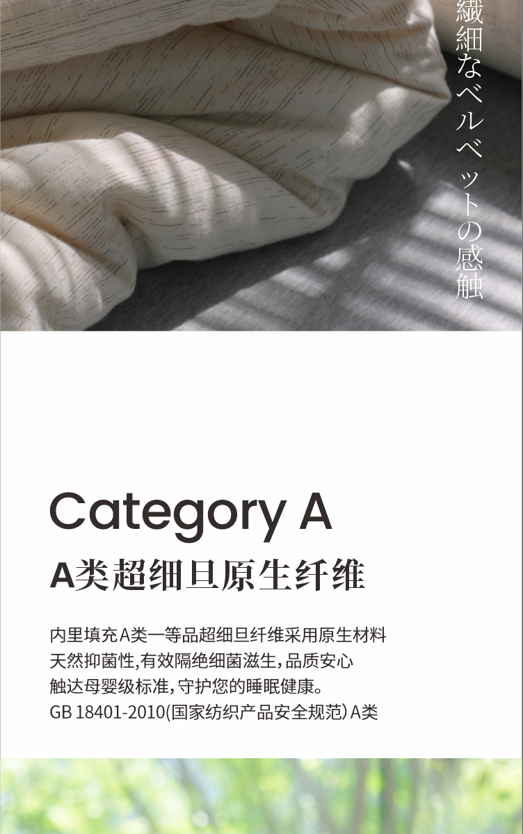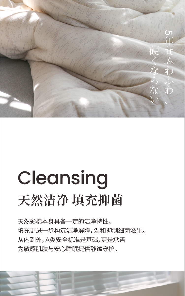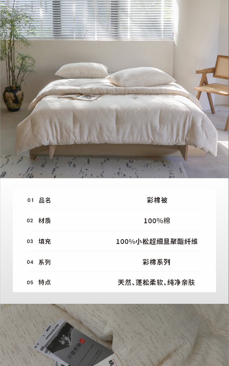 天然洁净填充抑菌 天然彩棉本身具备一定的洁净特性。填充更进一步构筑洁净屏障,温和抑制细菌滋生。