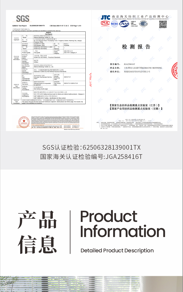 从内到外,A类安全标准是基础,更是承诺为致感肌肤与安心睡眠提供静谧守护。 Authoritative Testing 双重权威检测 由第三方权威检测机构SGS和南京海关出具的质检报告 告别虚假宣传,质量更有保证