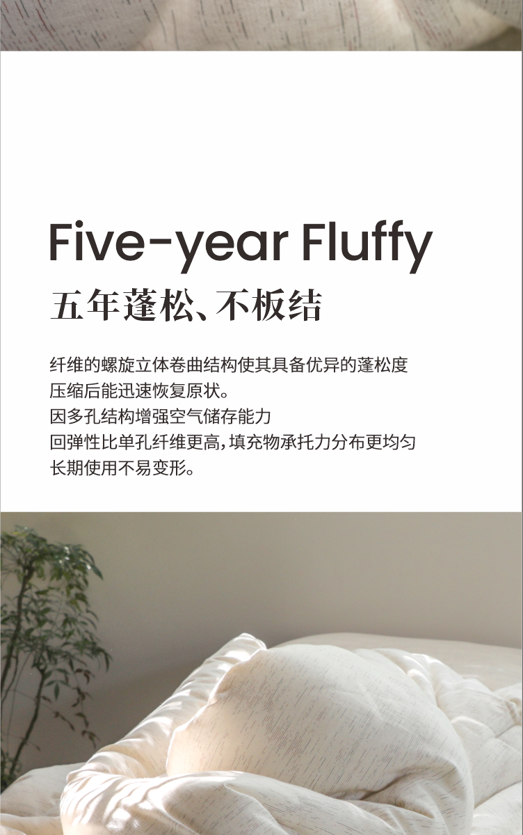 蓬松饱满,久用不易板结。 五年蓬松、不板结 纤维的螺旋立体卷曲结构使其具备优异的蓬松度压缩后能迅速恢复原状。