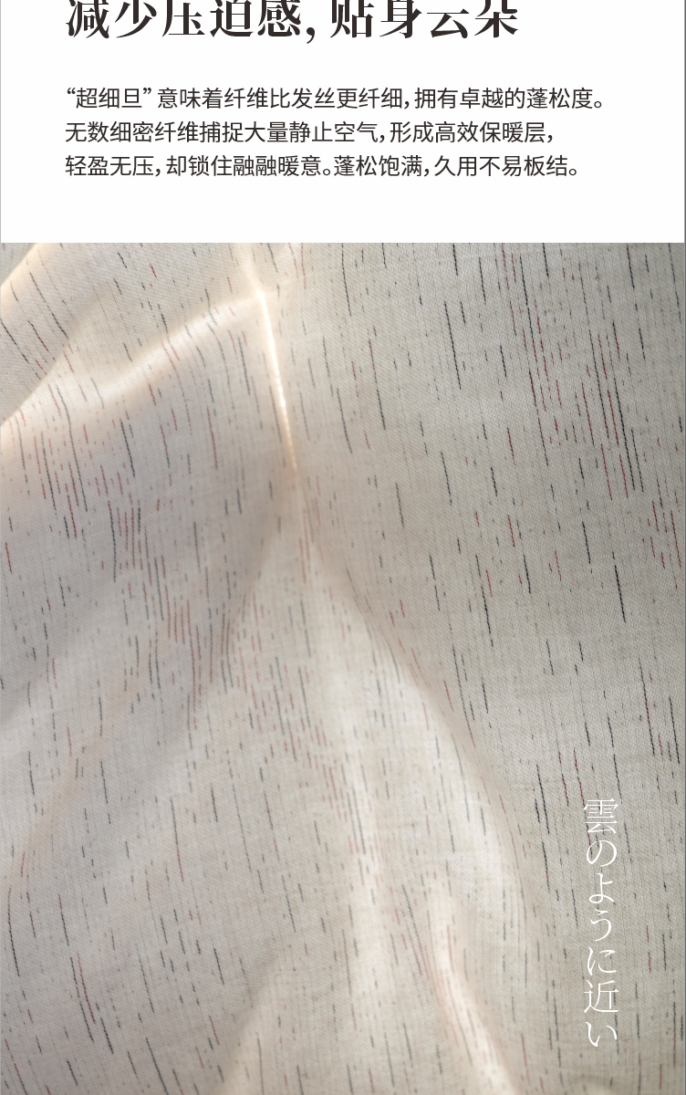 减少压迫感,贴身云朵 “超细旦”意味着纤维比发丝更纤细,拥有卓越的蓬松度。无数细密纤维捕捉大量静止空气,形成高效保暖层,轻盈无压,却锁住融融暖意。