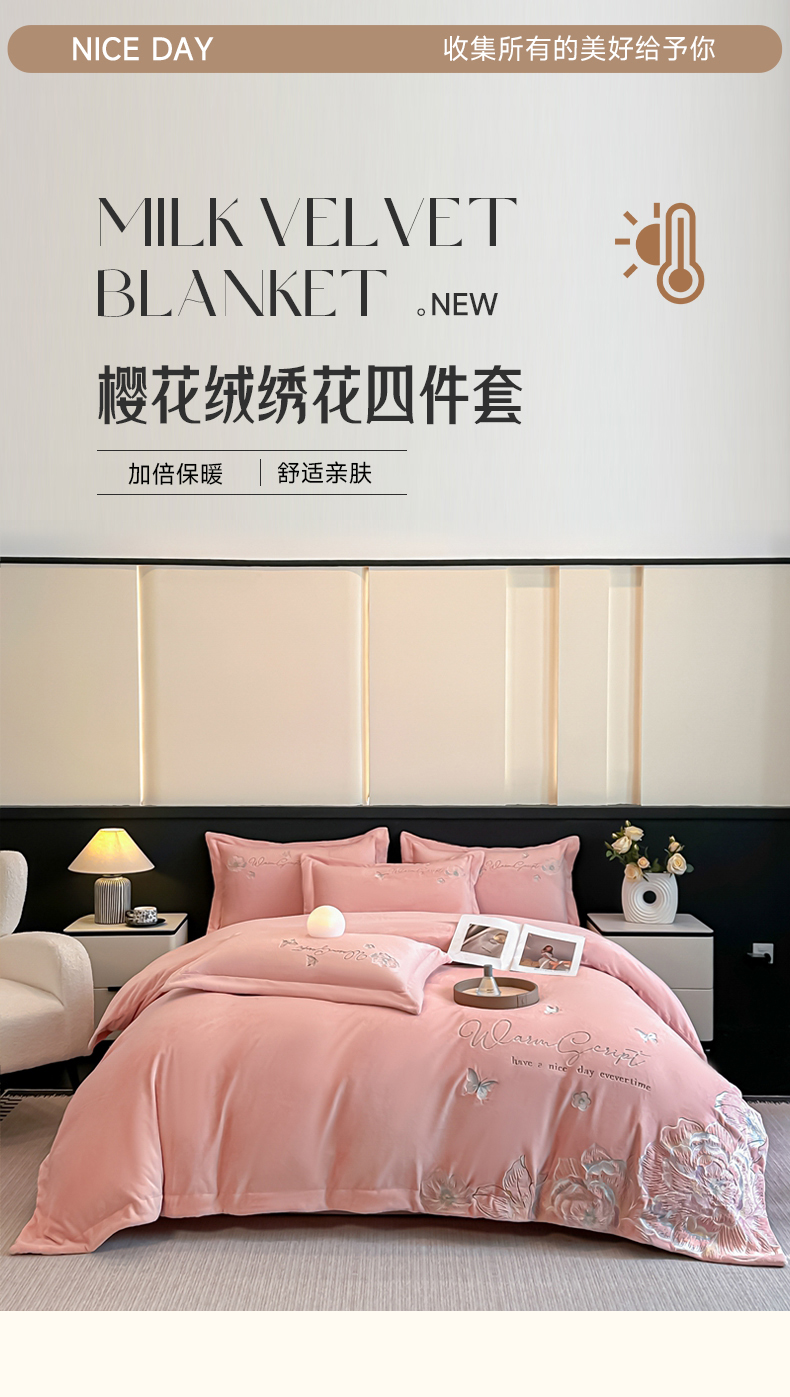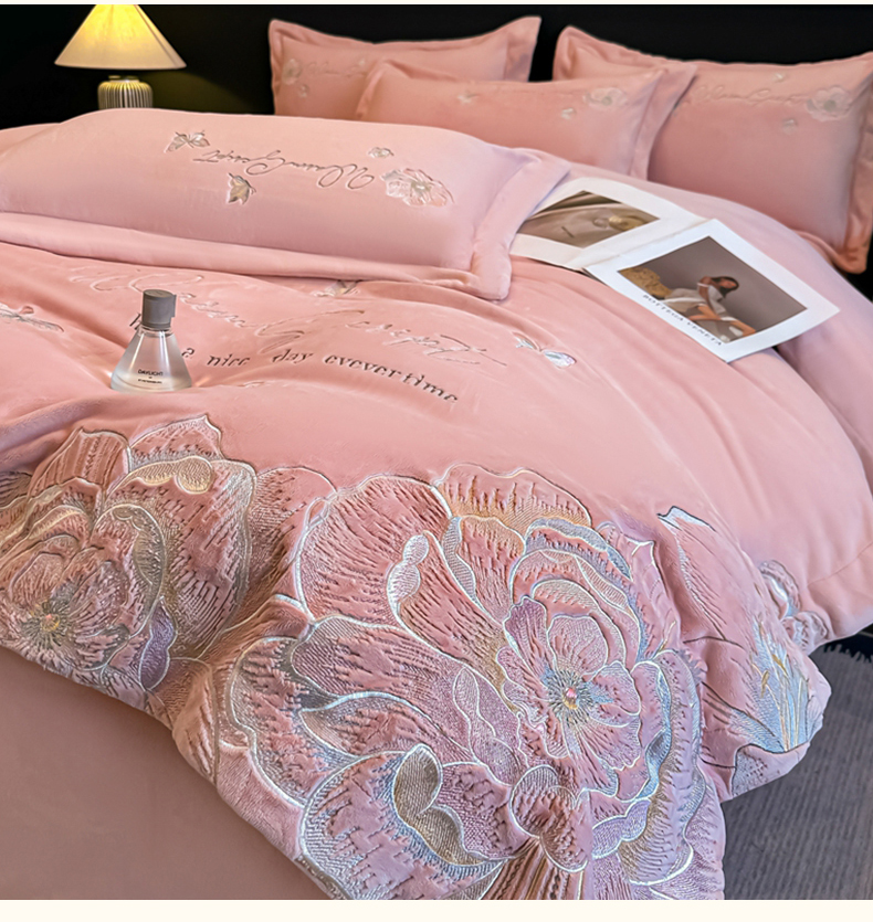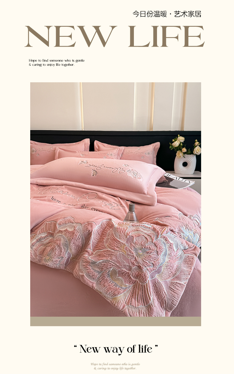 锦铭源家纺 2025新款75D全消光超柔樱花绒绣花四件套牛奶绒四件套【有买家秀】 花颜-粉
