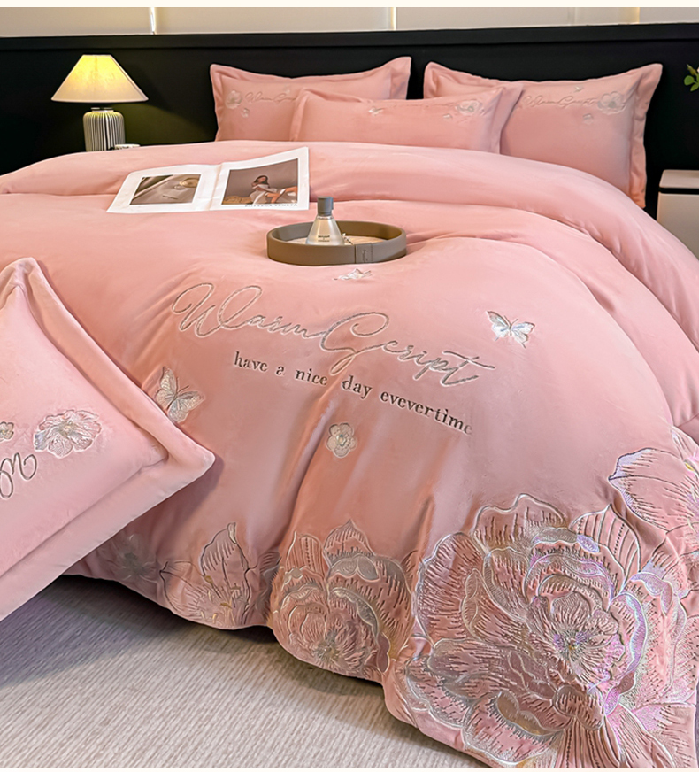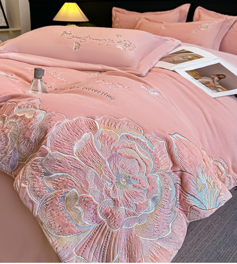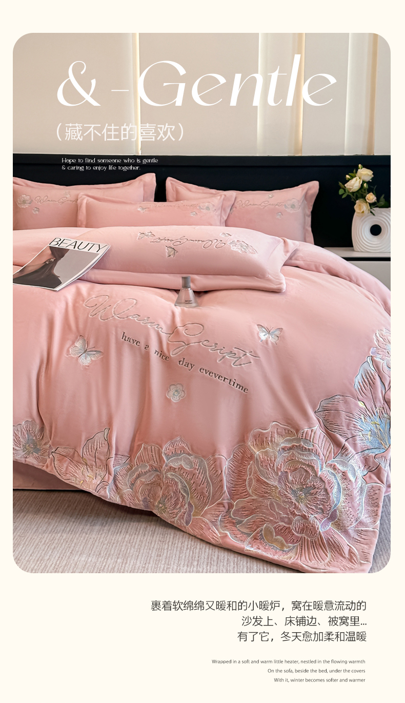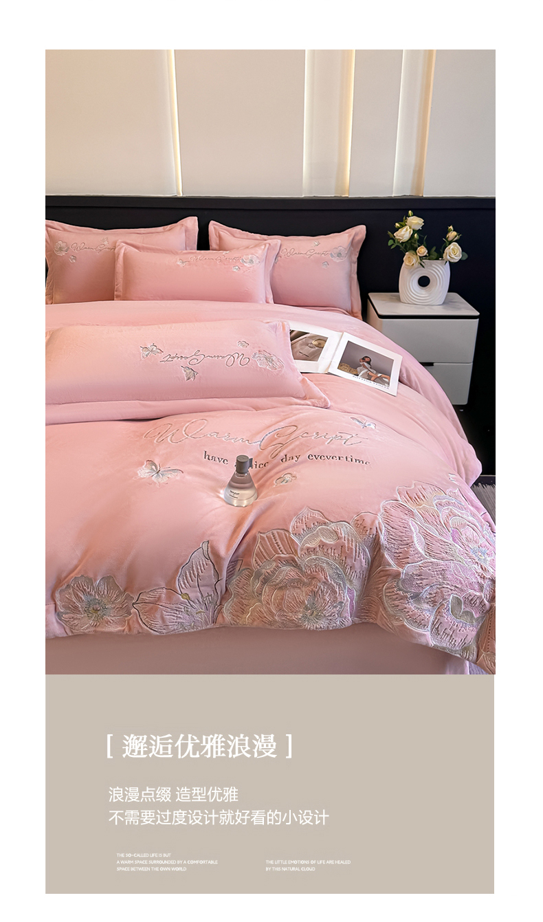 锦铭源家纺 2025新款75D全消光超柔樱花绒绣花四件套牛奶绒四件套【有买家秀】 花颜-粉