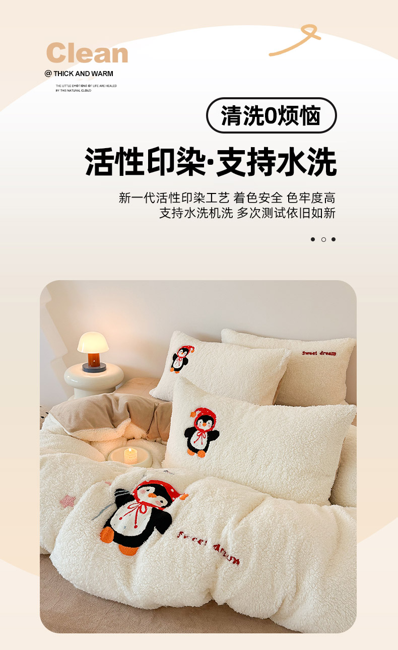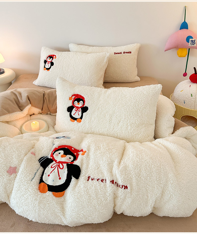商品名称:乐坊 2025新款小阪羊羔绒牛奶绒卡通四件套冬季加厚保暖 企鹅-白卡其
