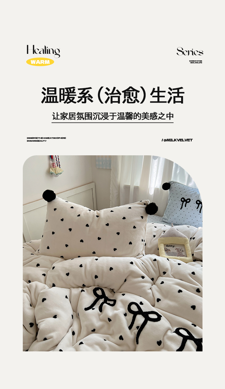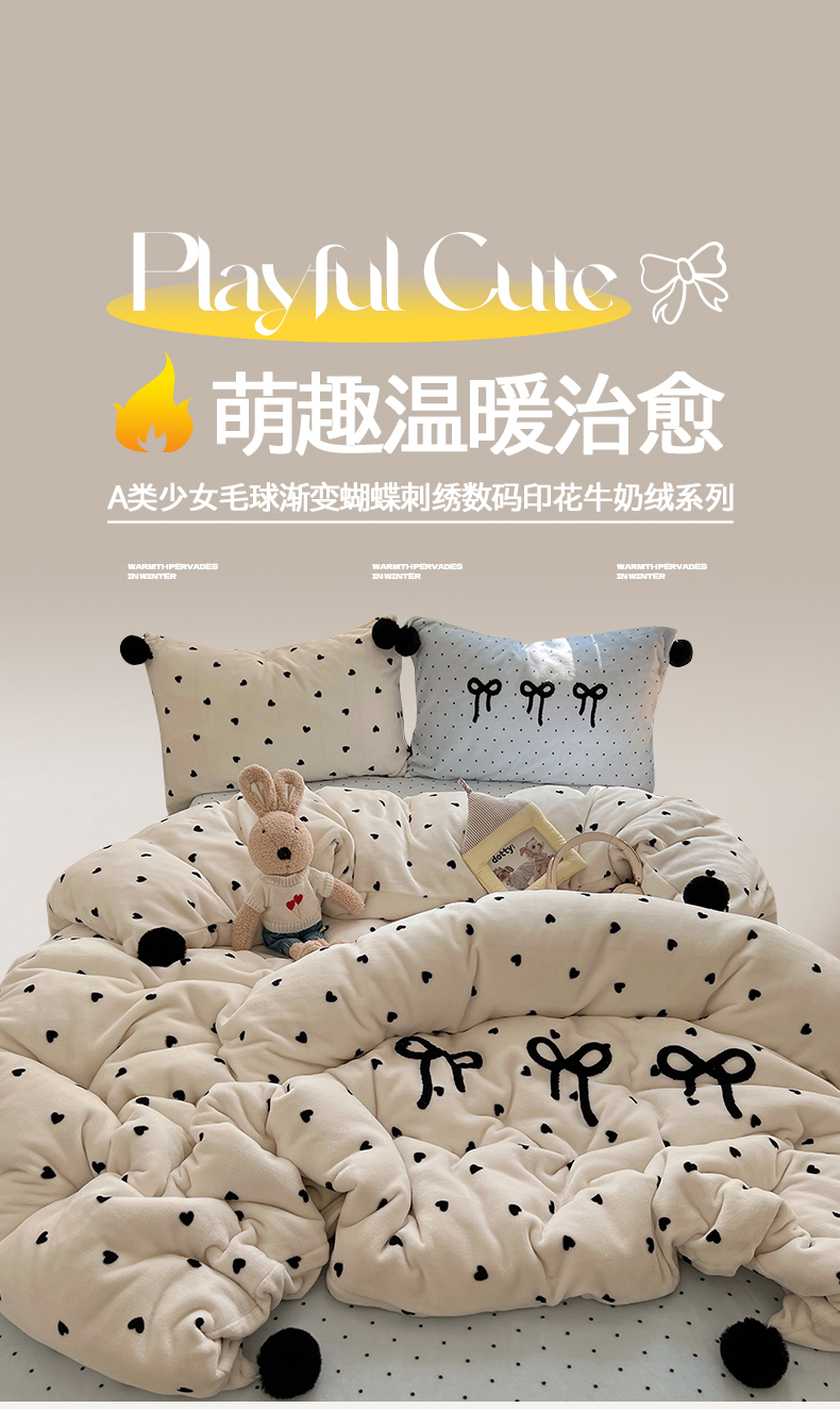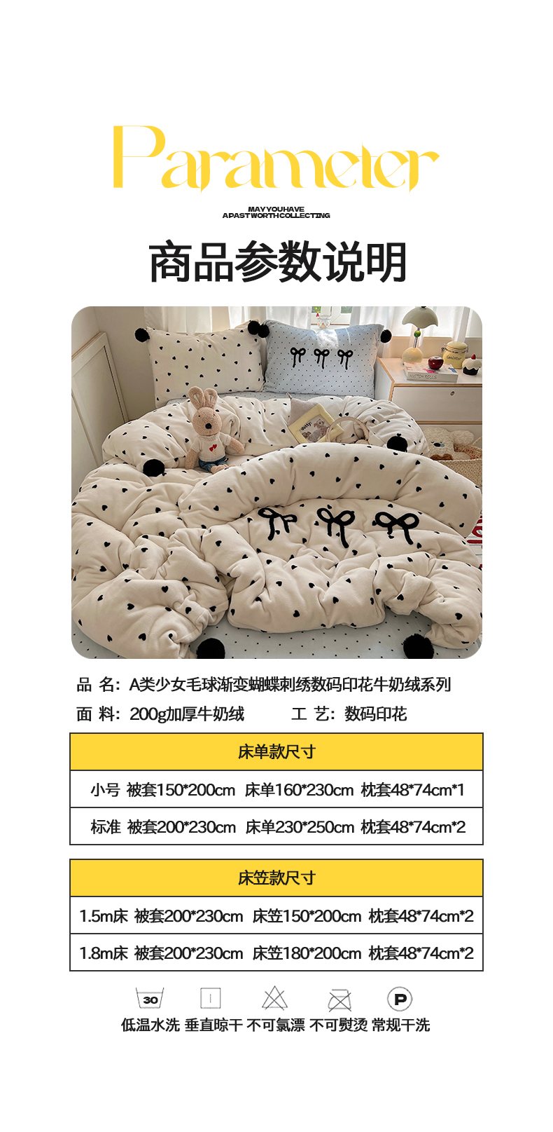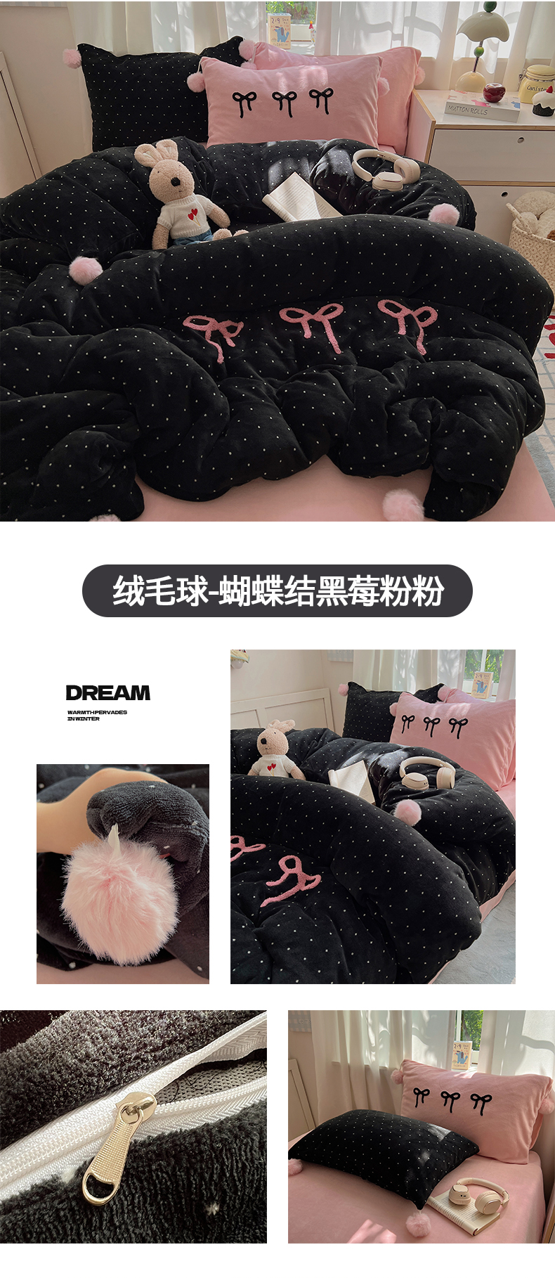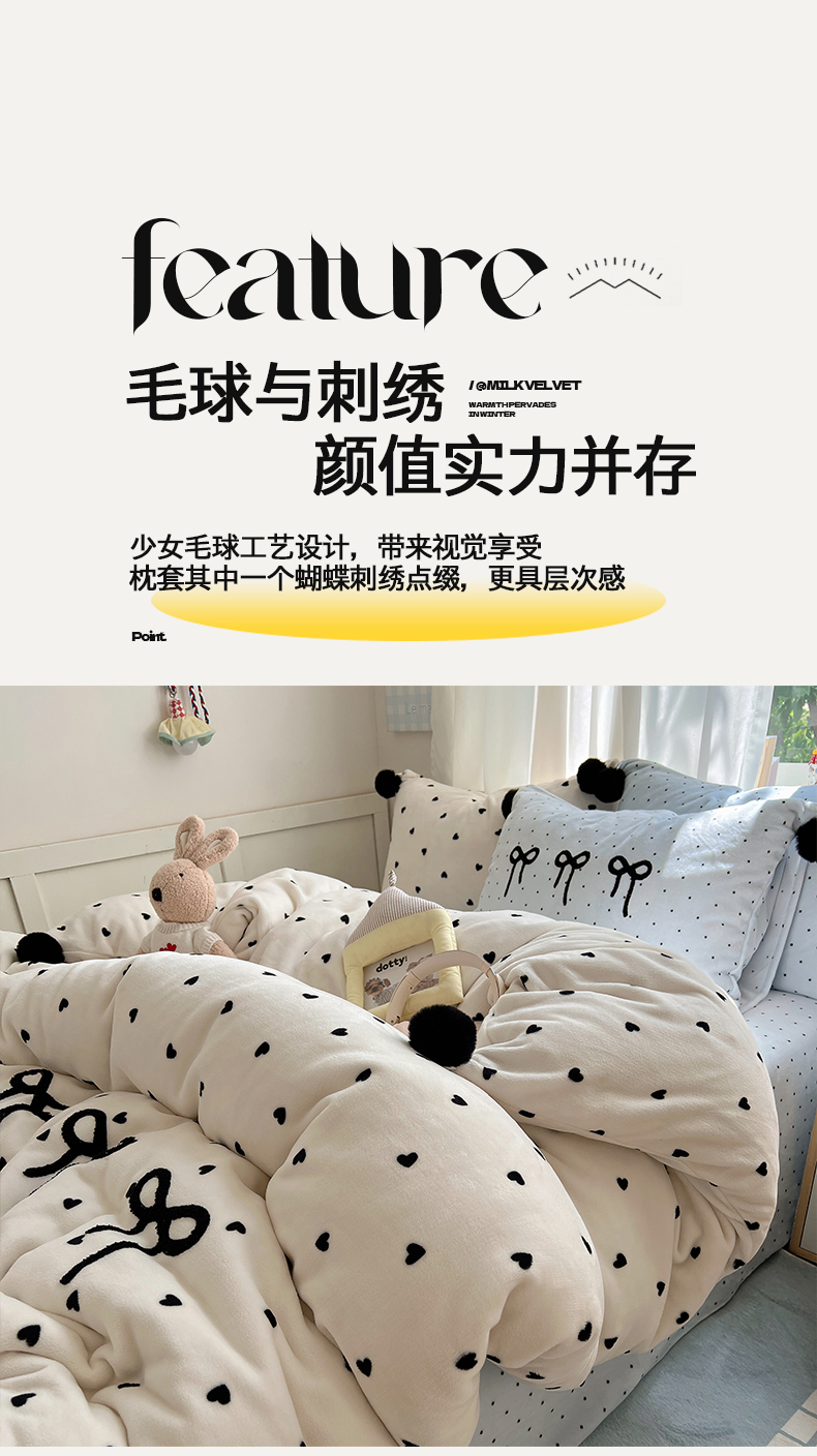 当前位置: 91家纺网 > 商品网购 > 床品套件 > 四件套 > 牛奶绒四件套 > 桃子家居 2025新款insA类少女甜心毛球混搭工艺蝴蝶结刺绣毛巾绣印花加厚牛奶绒四件套 绒毛球-蝴蝶结白心奶蓝