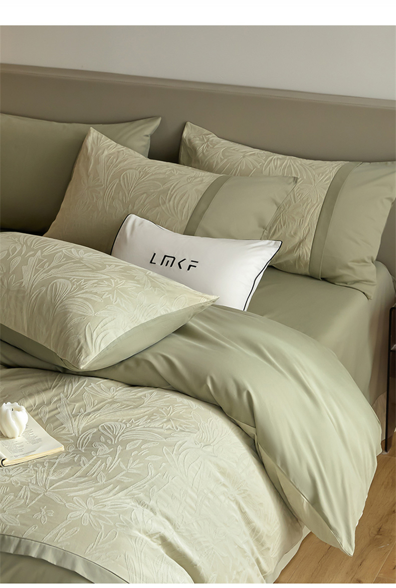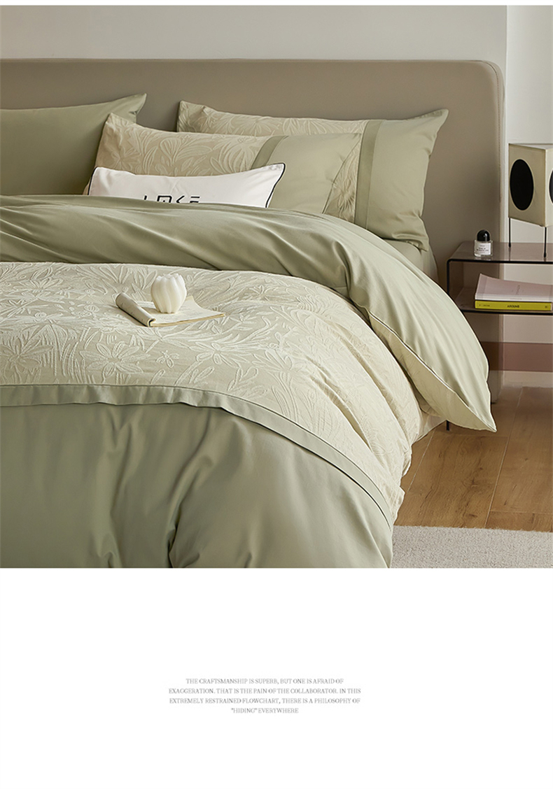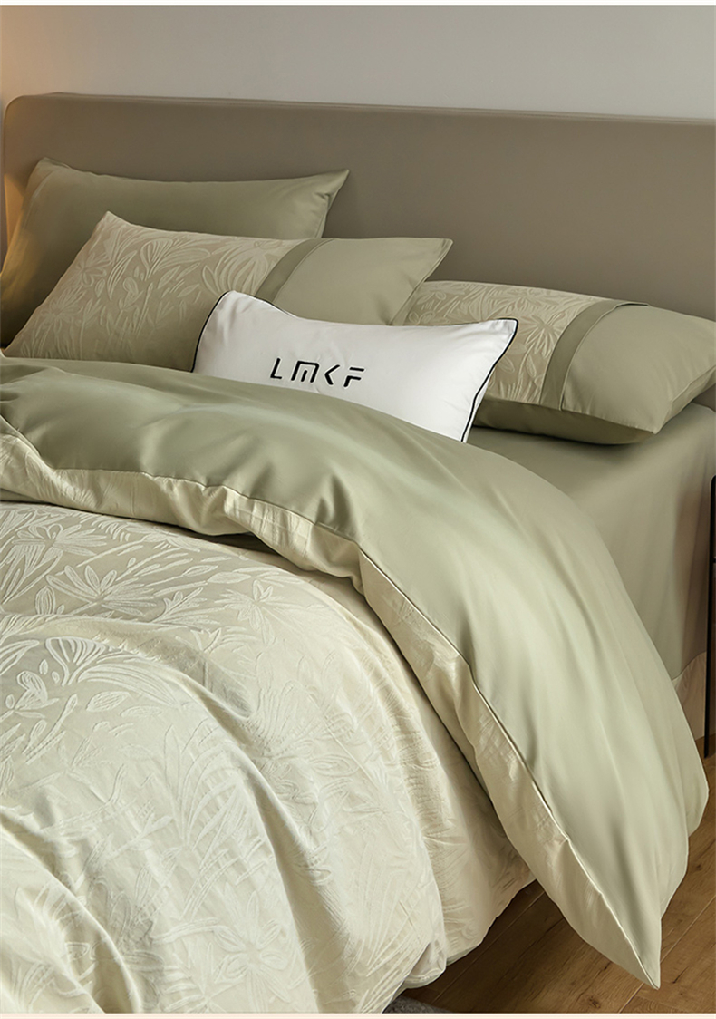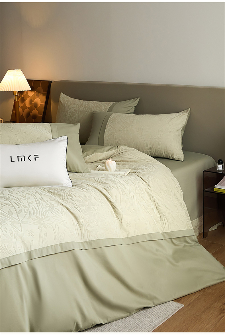 商品名称:蓝米卡夫 2025秋冬-A类全棉亮面提花50S*50S双股磨毛拼接款(礼盒包装)提供买家秀 秘境-奶绿
