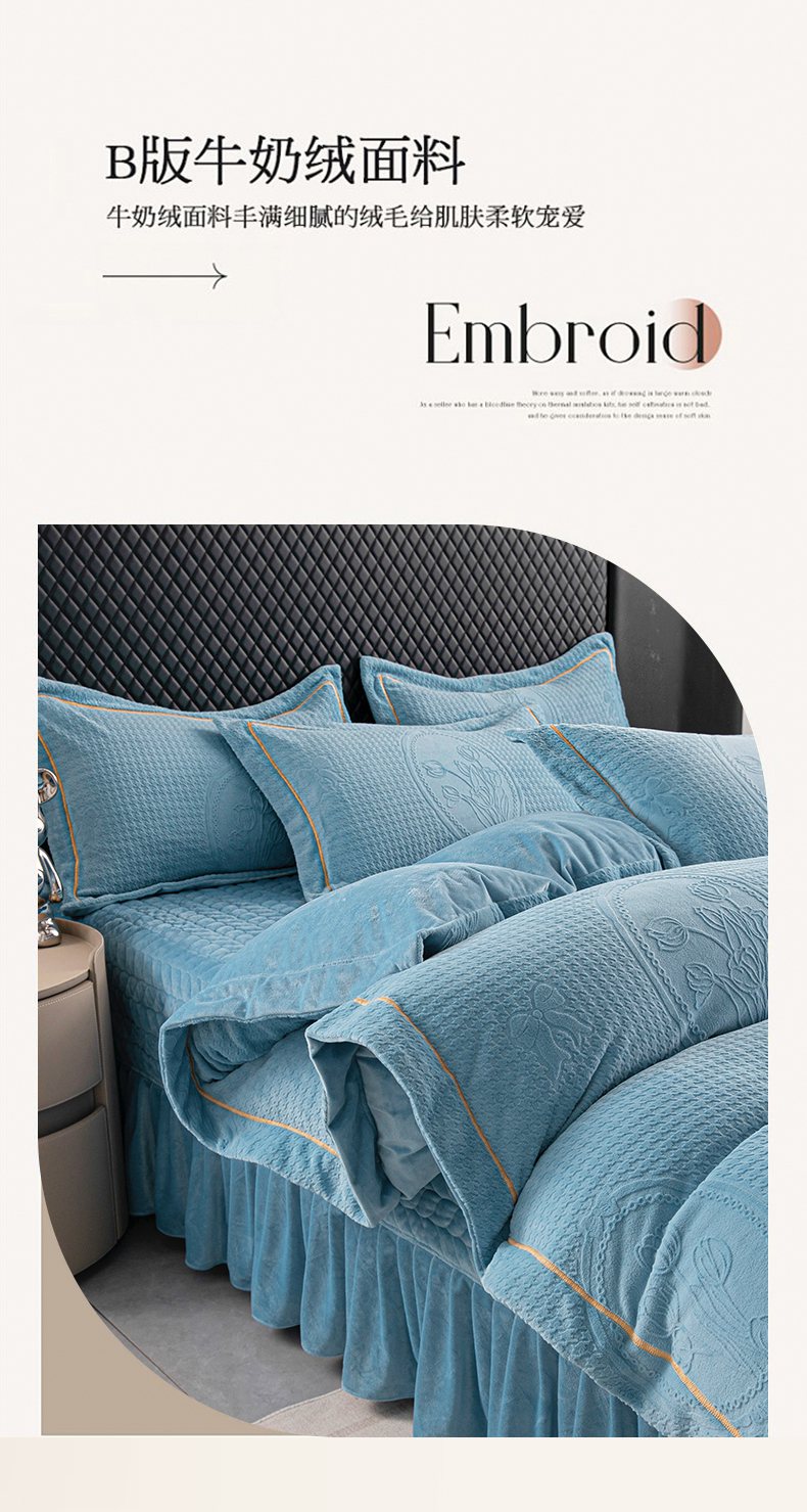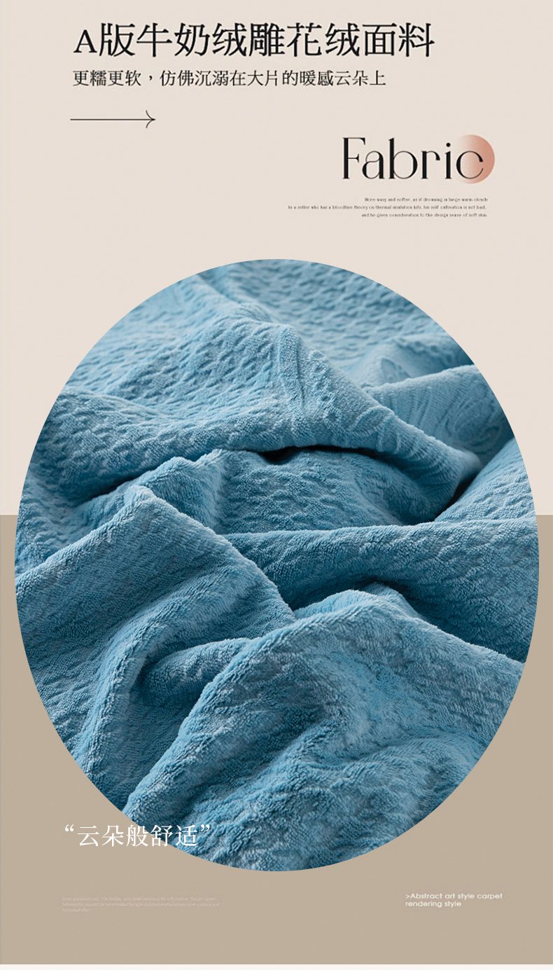 商品名称:畅畅家纺 2025新款冬季12斤加厚轻奢款230克全消光立体雕花牛奶绒夹棉床盖四件套 轻奢花语-蓝色