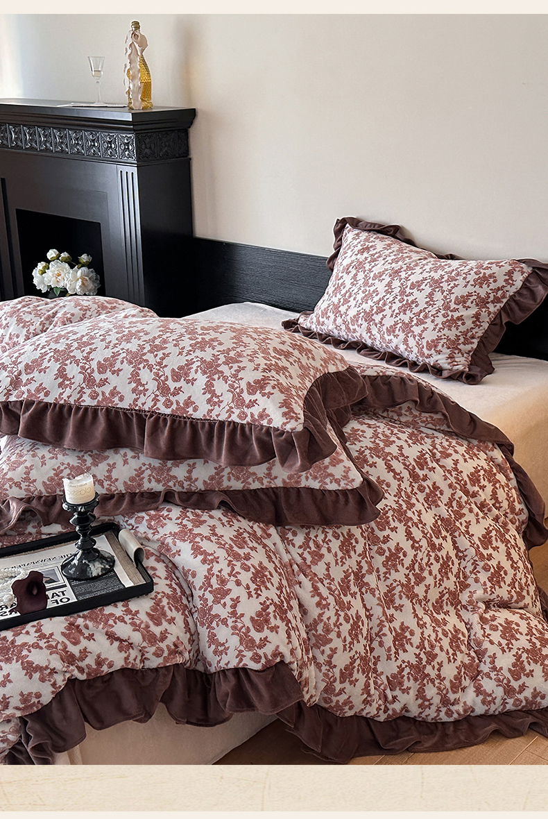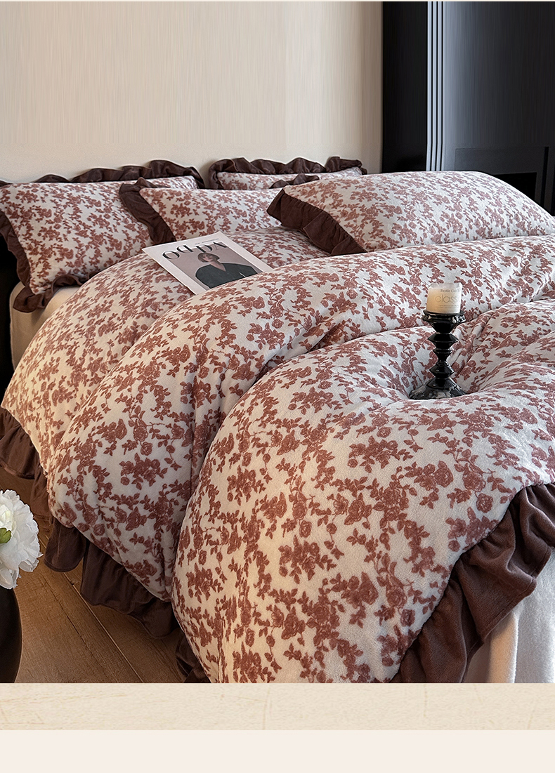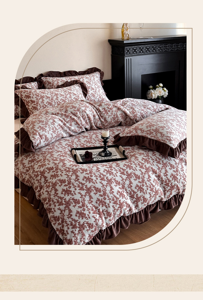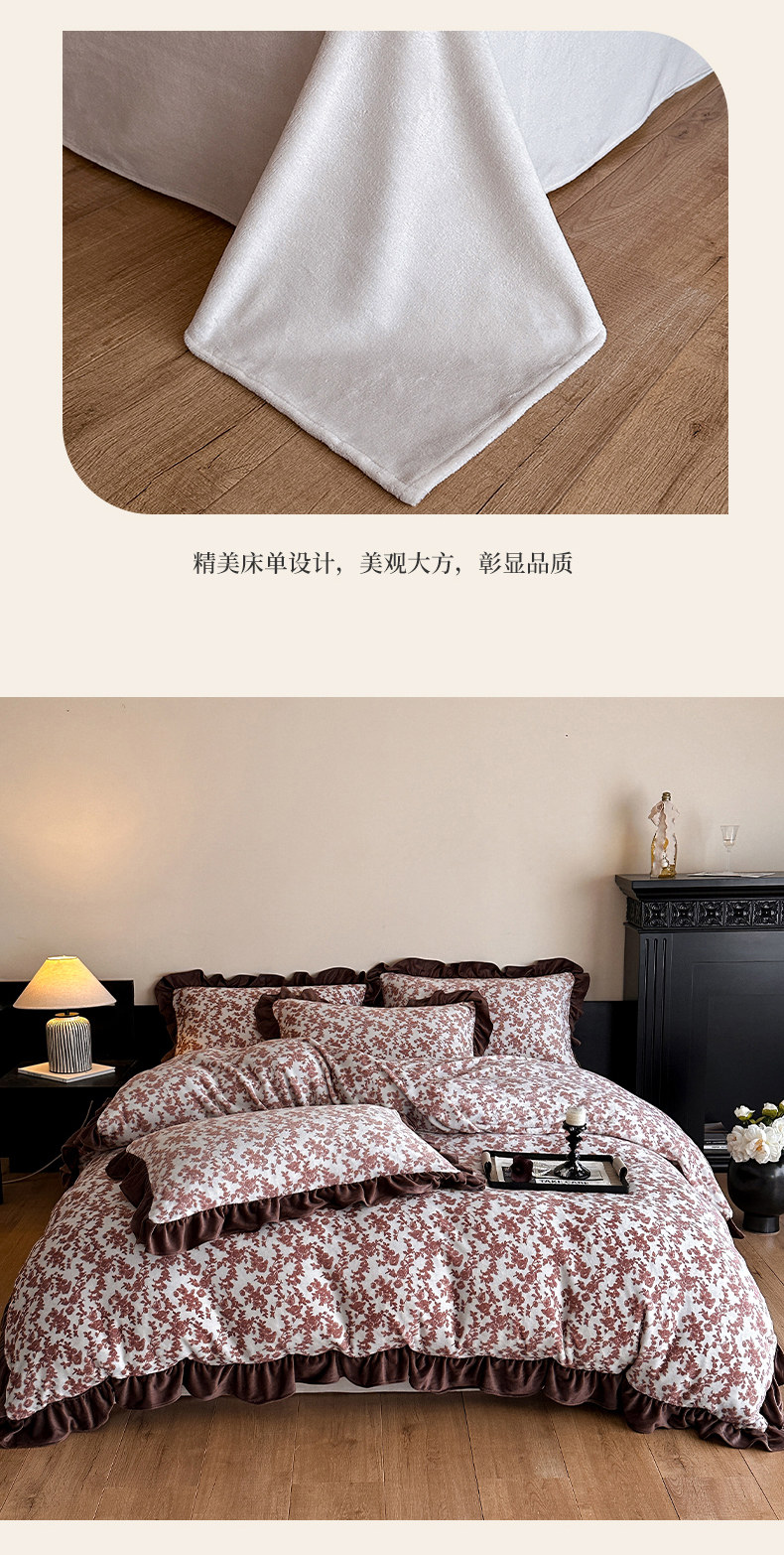 三朵家纺 2025新款秋冬法式复古风法莱绒花边四件套 紫嫣