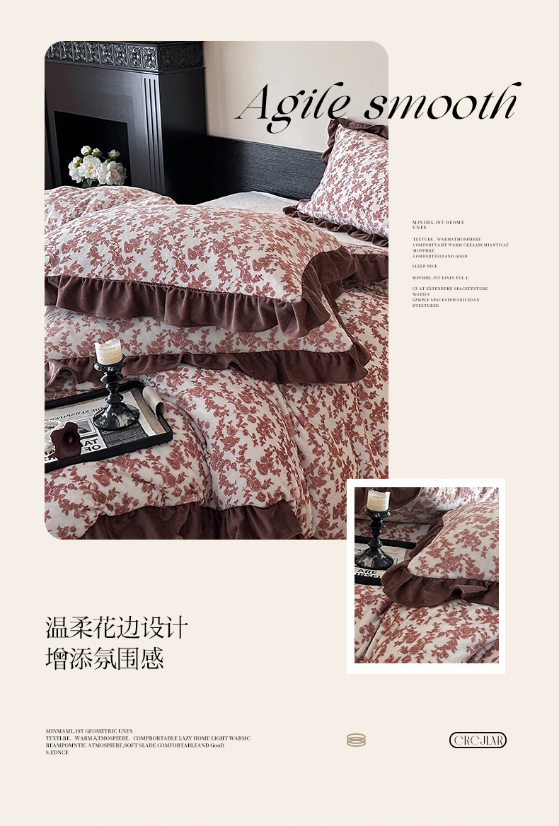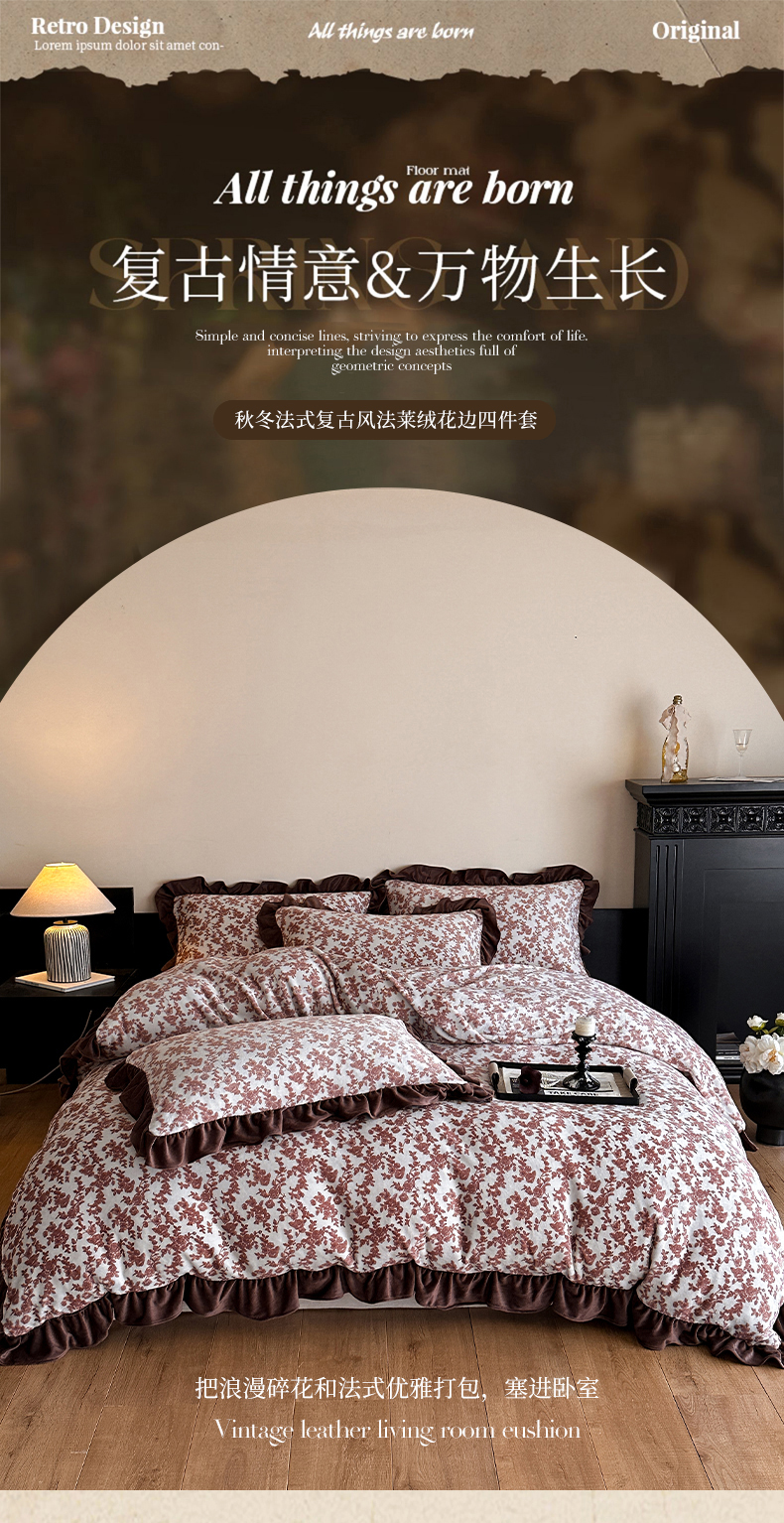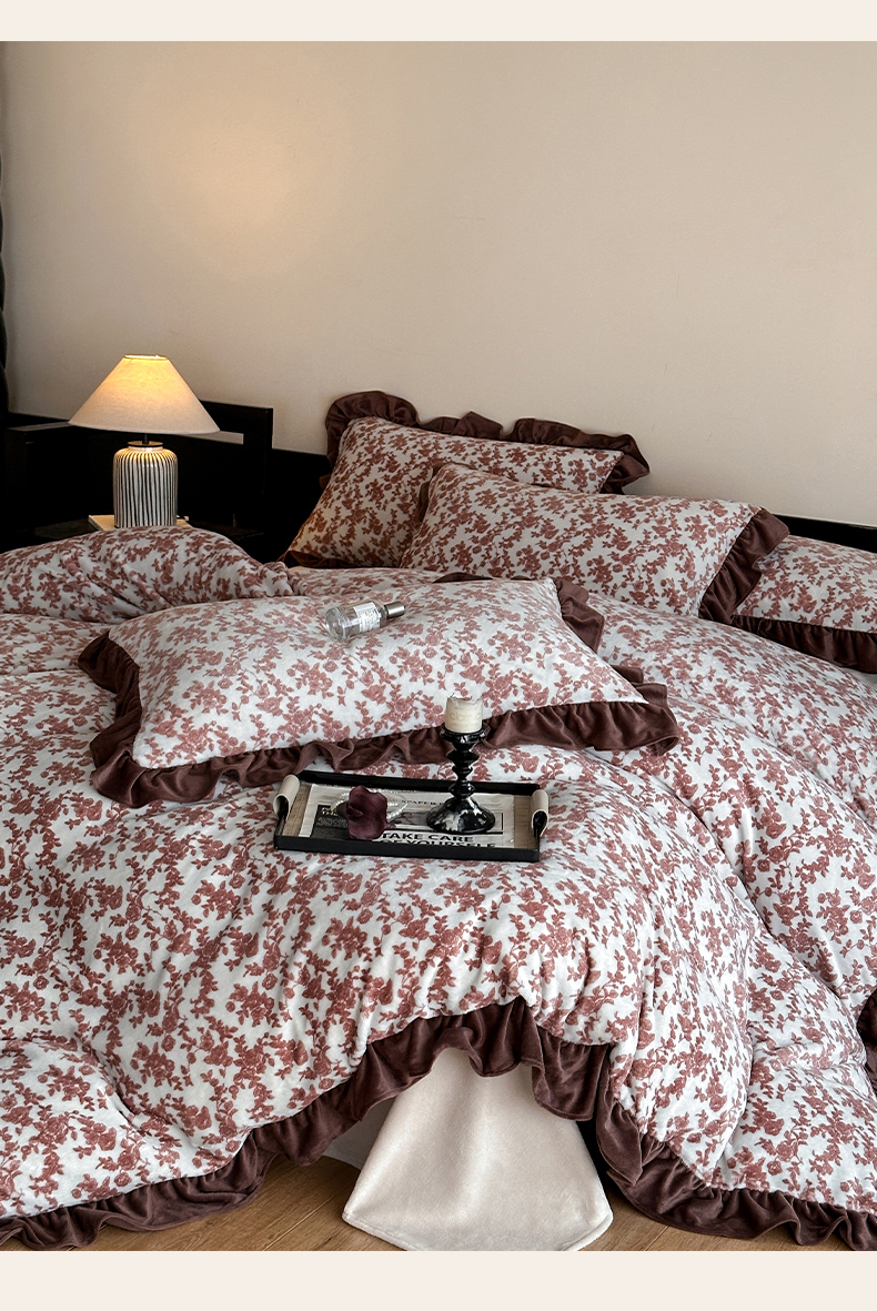 三朵家纺 2025新款秋冬法式复古风法莱绒花边四件套 紫嫣