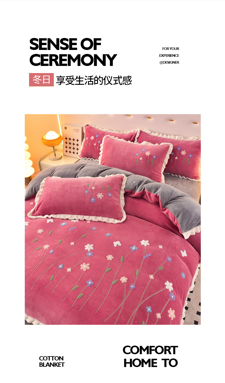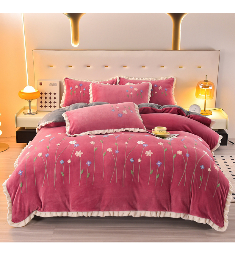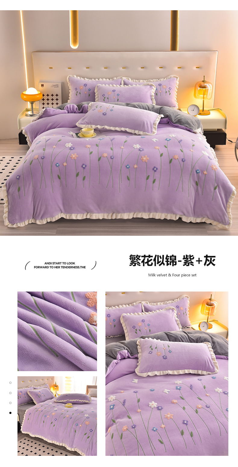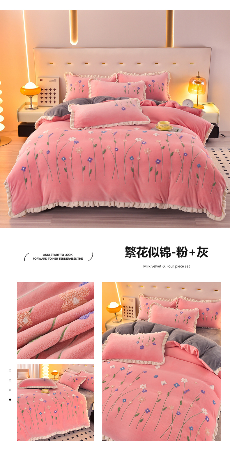 畅畅家纺 2025新款A类亲肤舒适高克重牛奶绒绣花系列冬季四件套-繁花似锦 繁花似锦-豆沙+灰