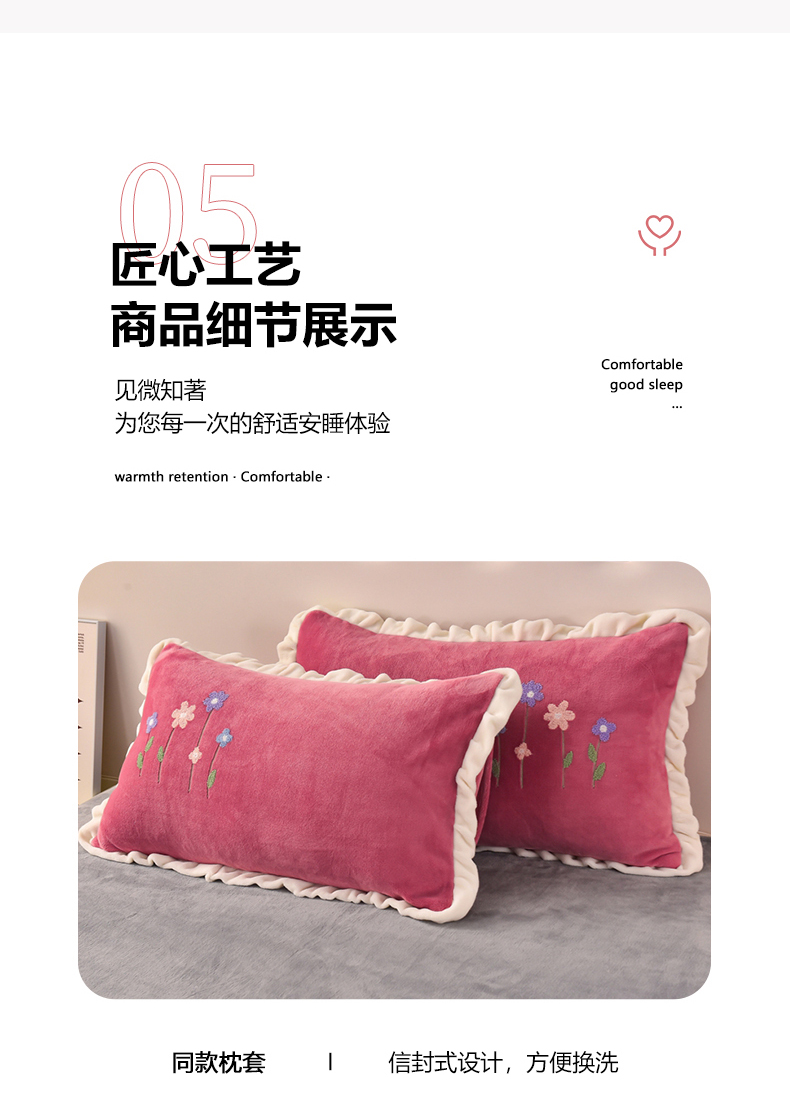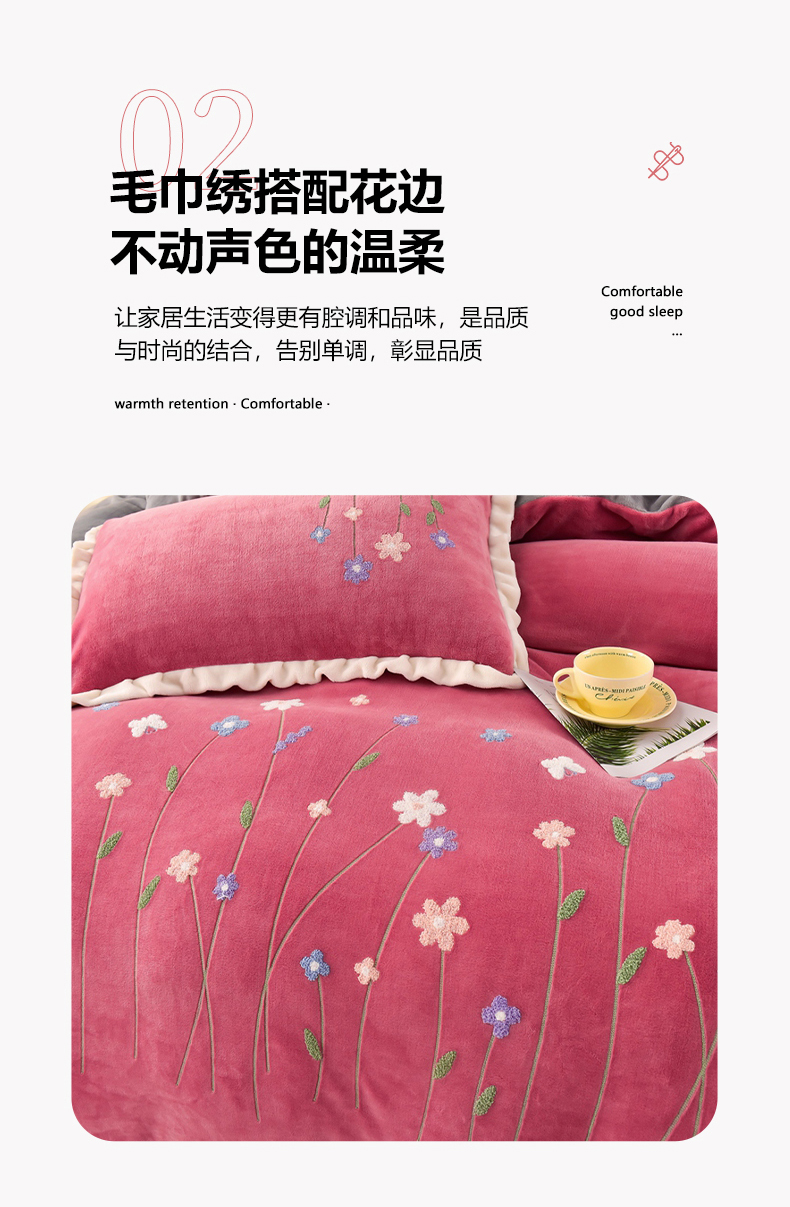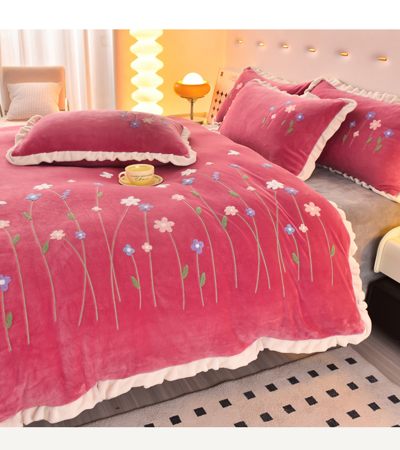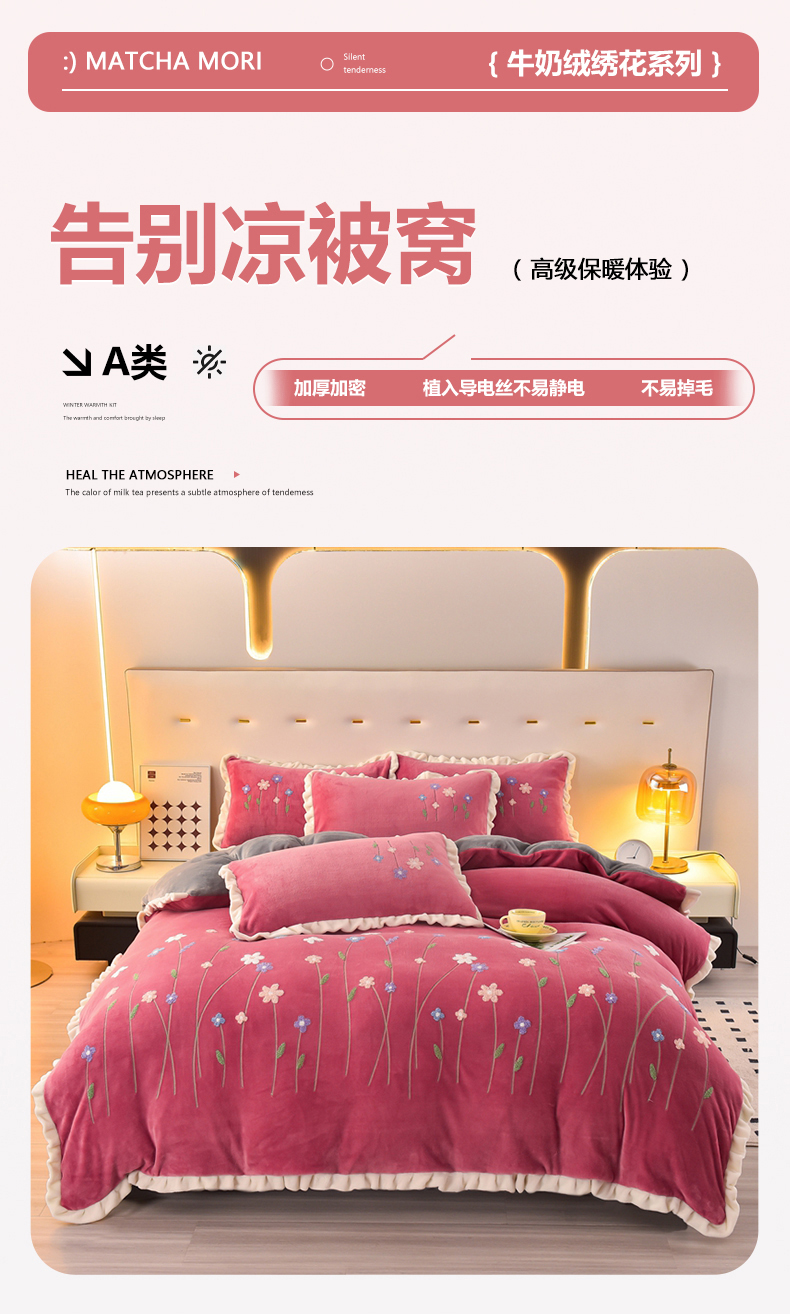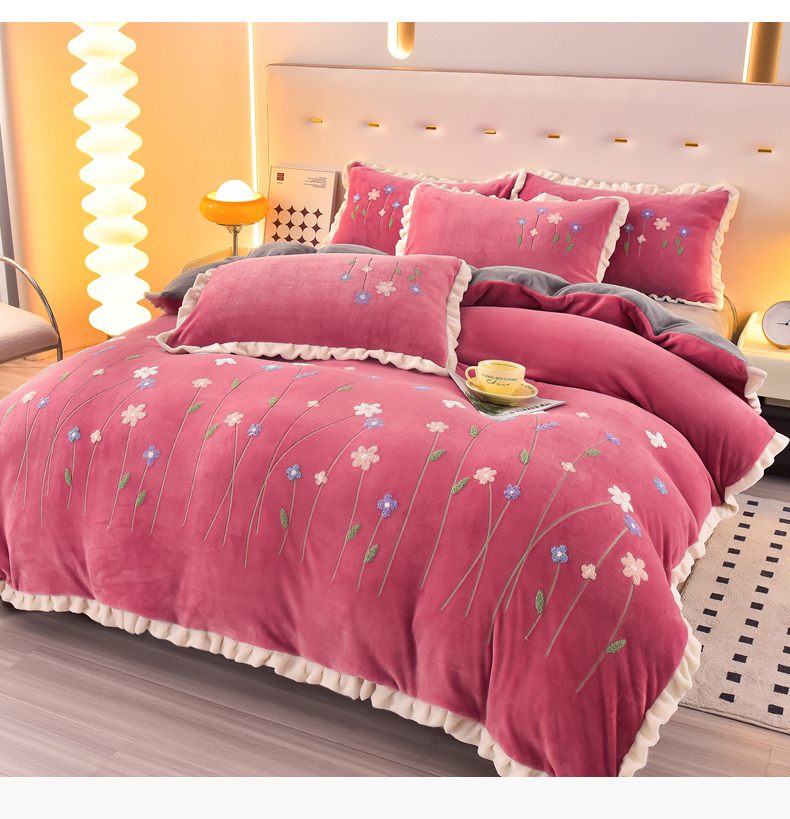 畅畅家纺 2025新款A类亲肤舒适高克重牛奶绒绣花系列冬季四件套-繁花似锦 繁花似锦-豆沙+灰