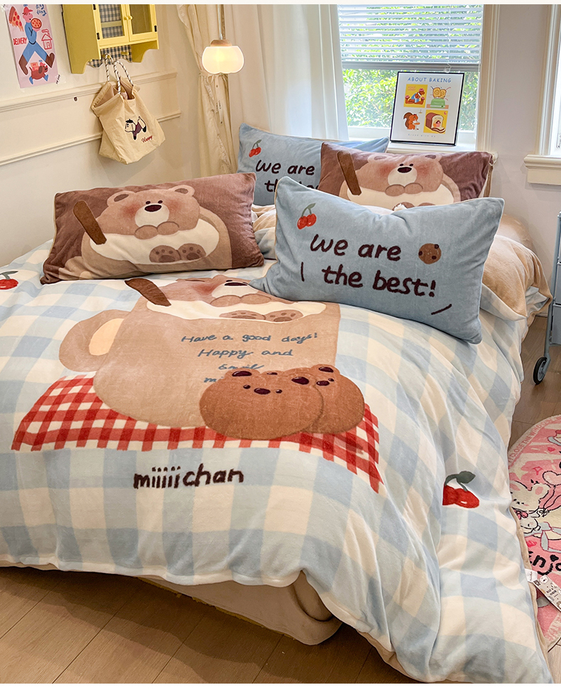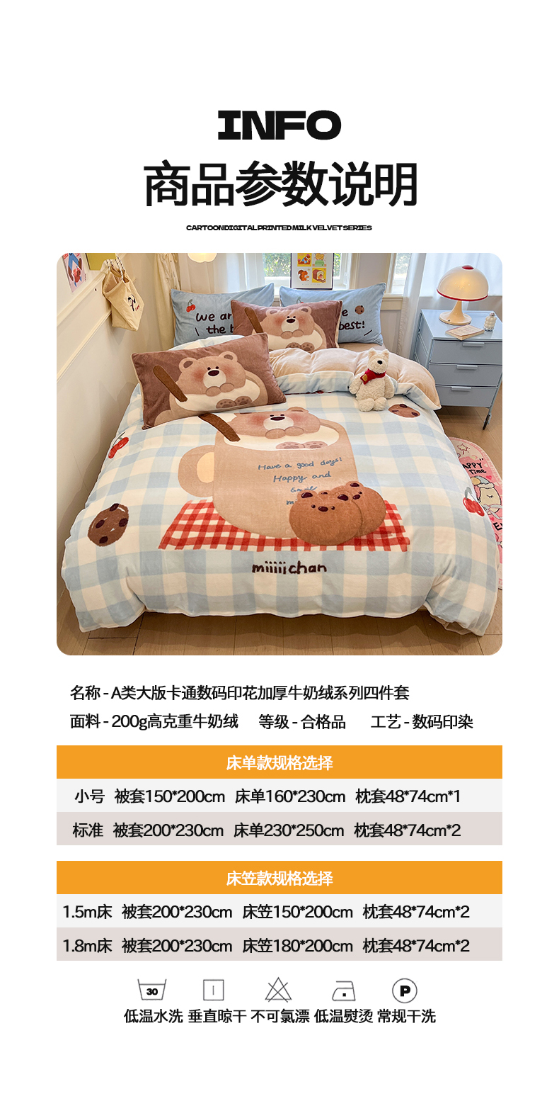 商品名称:桃子家居 2025新品A类正版授权miiiiichan咪酱大版卡通数码印花加厚牛奶绒系列四件套 绒大版-咪酱趣多多