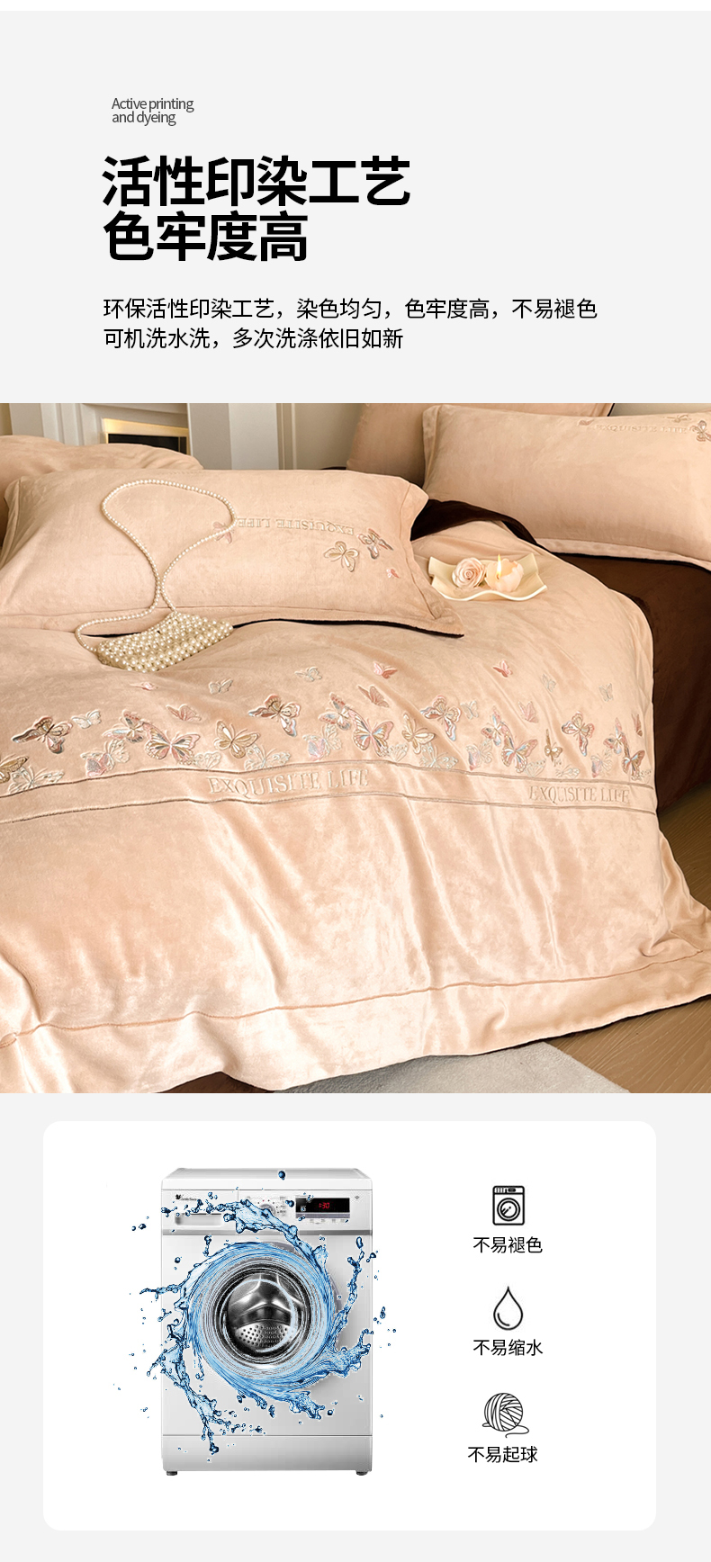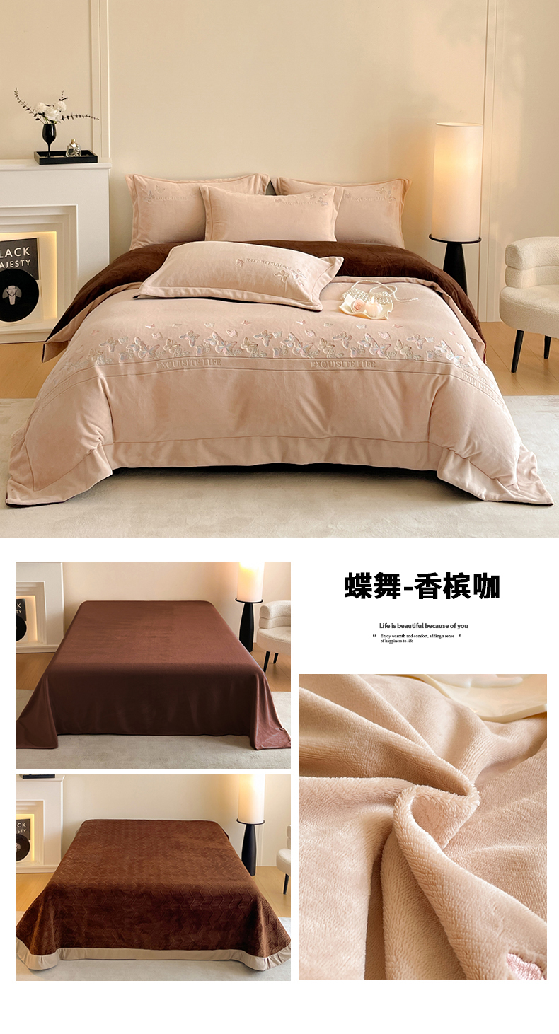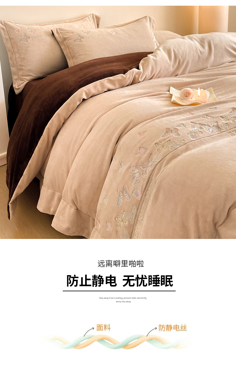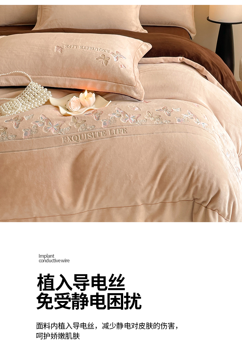 当前位置: 91家纺网 > 商品网购 > 床品套件 > 四件套 > 牛奶绒四件套 > 新方向 2025新款高克重240克A类全消光刺绣牛奶绒四件套-蝶舞 蝶舞-香槟咖