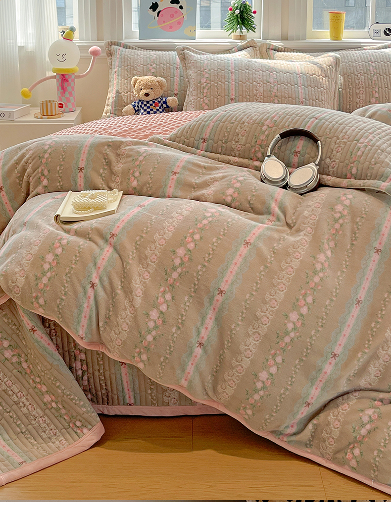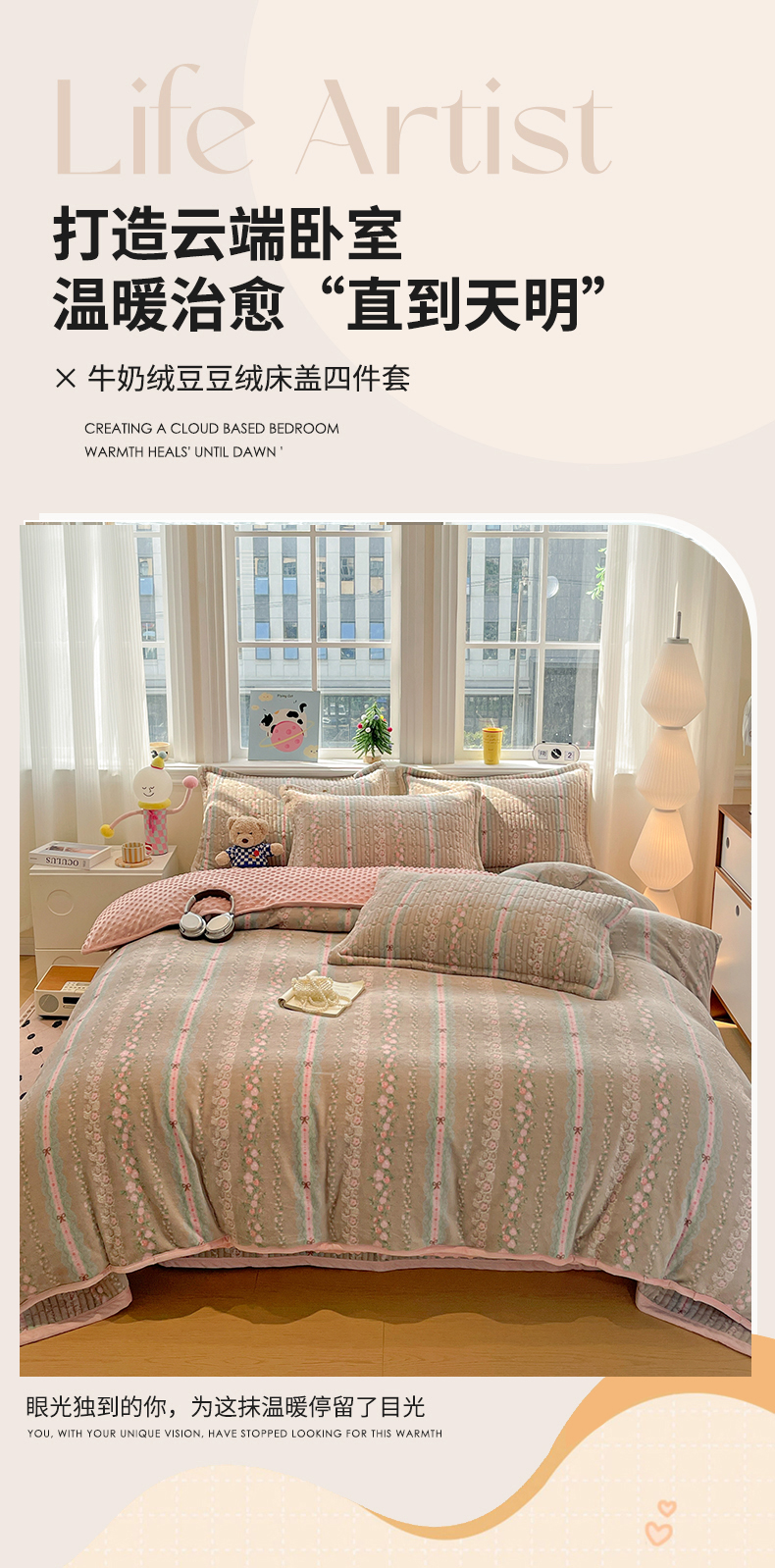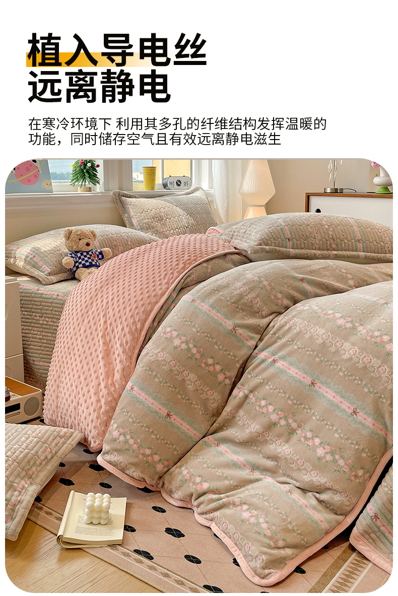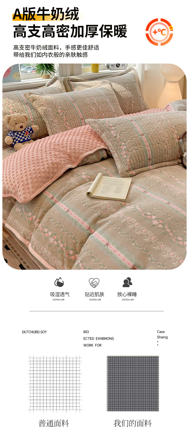 商品名称:元熙 2025新款印花小清新韩国绒牛奶绒豆豆床盖四件套-蔷薇粉