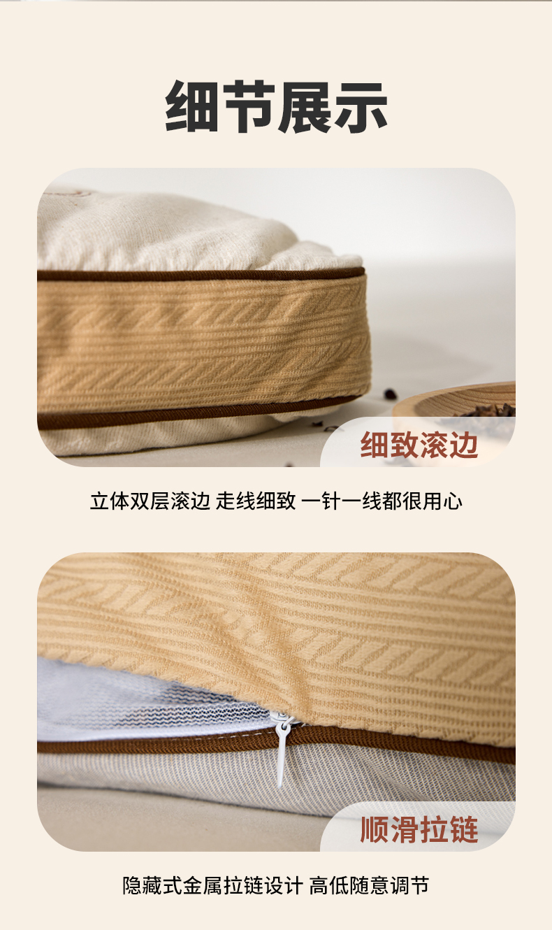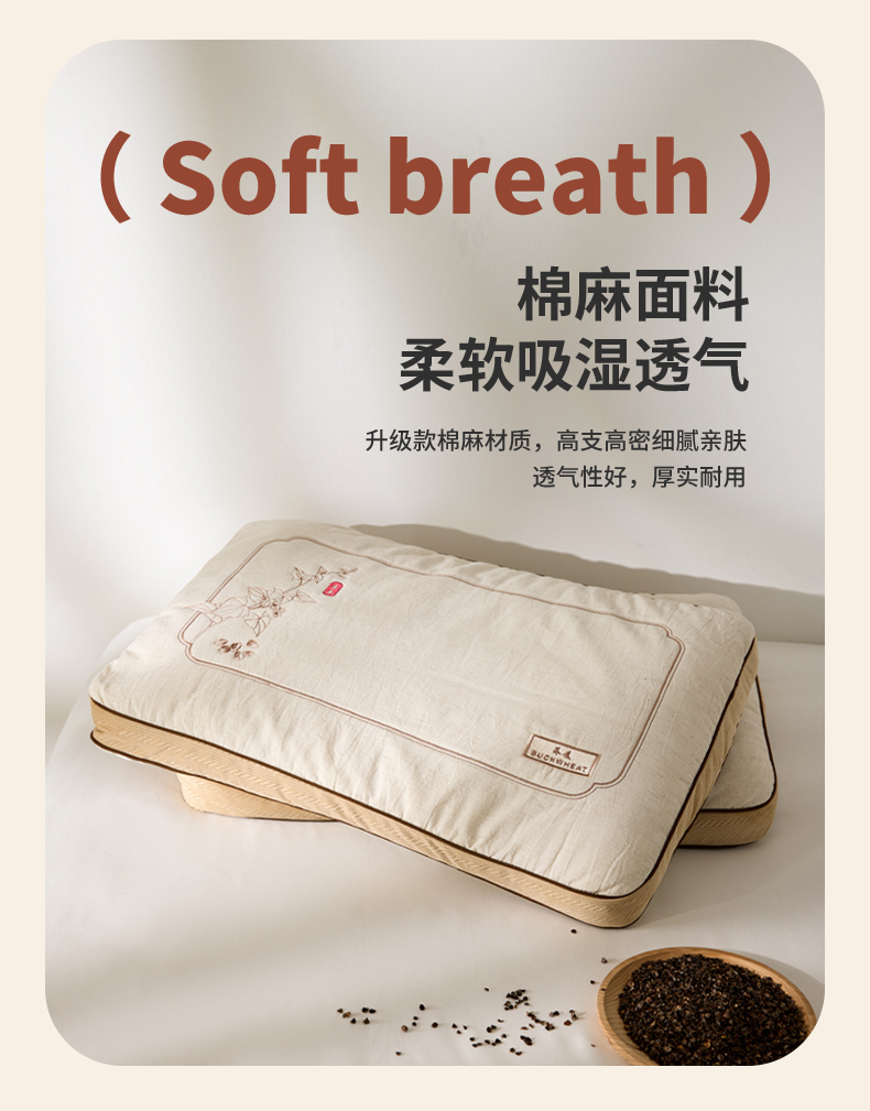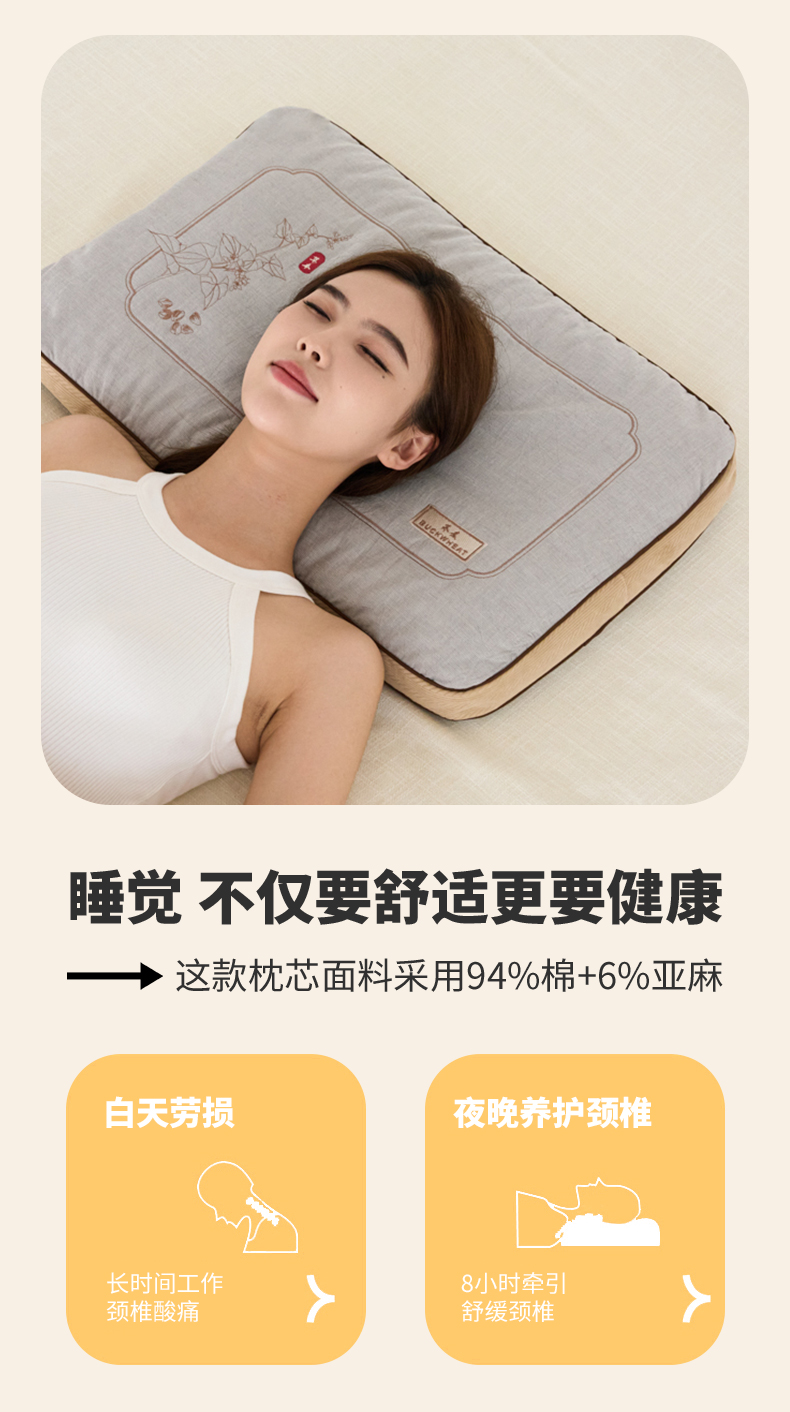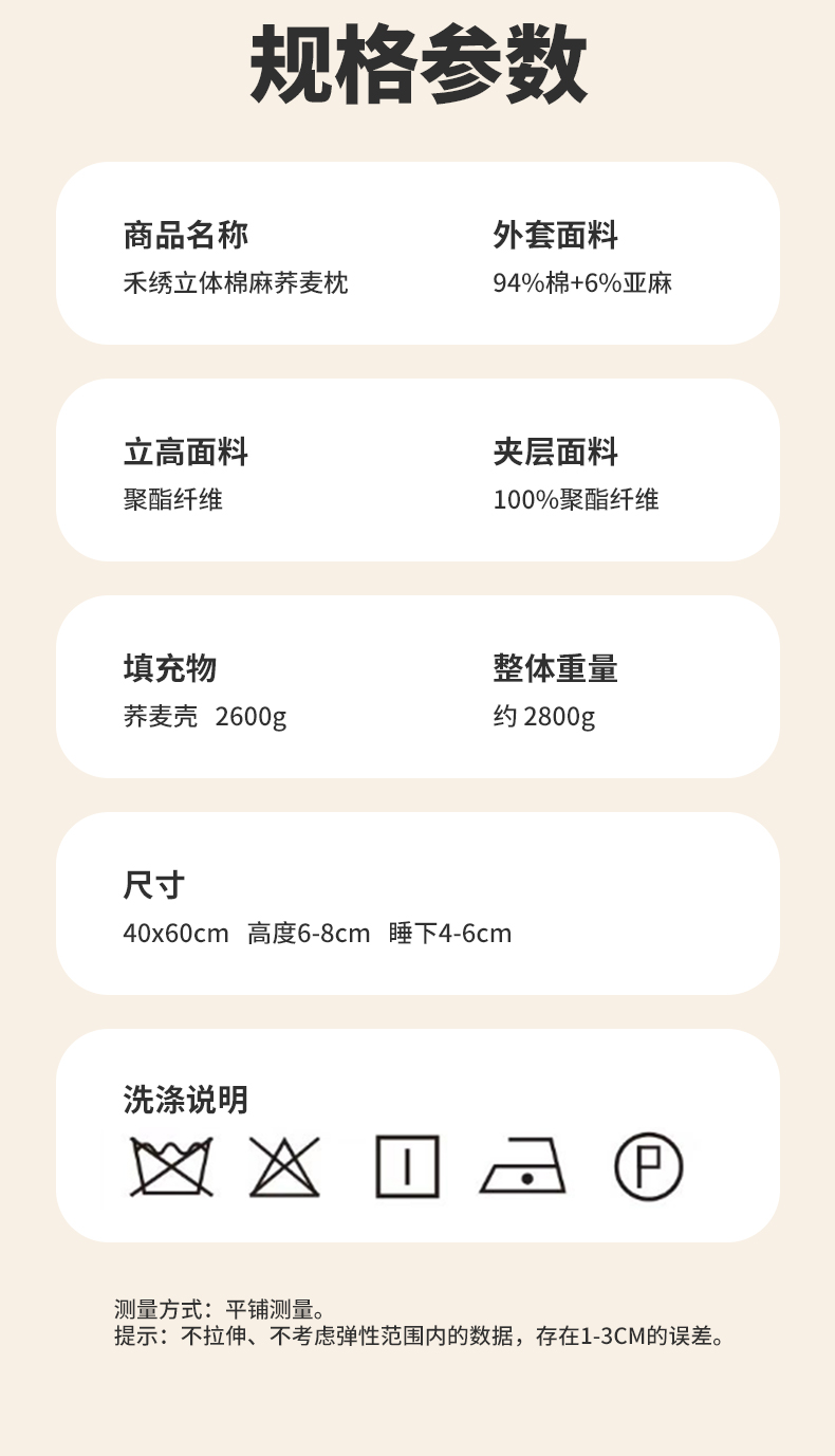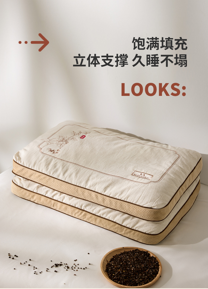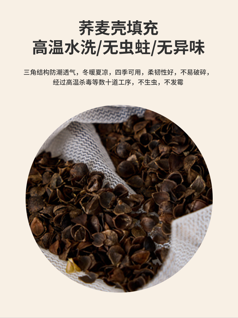 填充物:100%荞麦壳 2600g,整体重量约 2800g。尺寸:40x60cm 高度6-8cm 睡下4-6cm