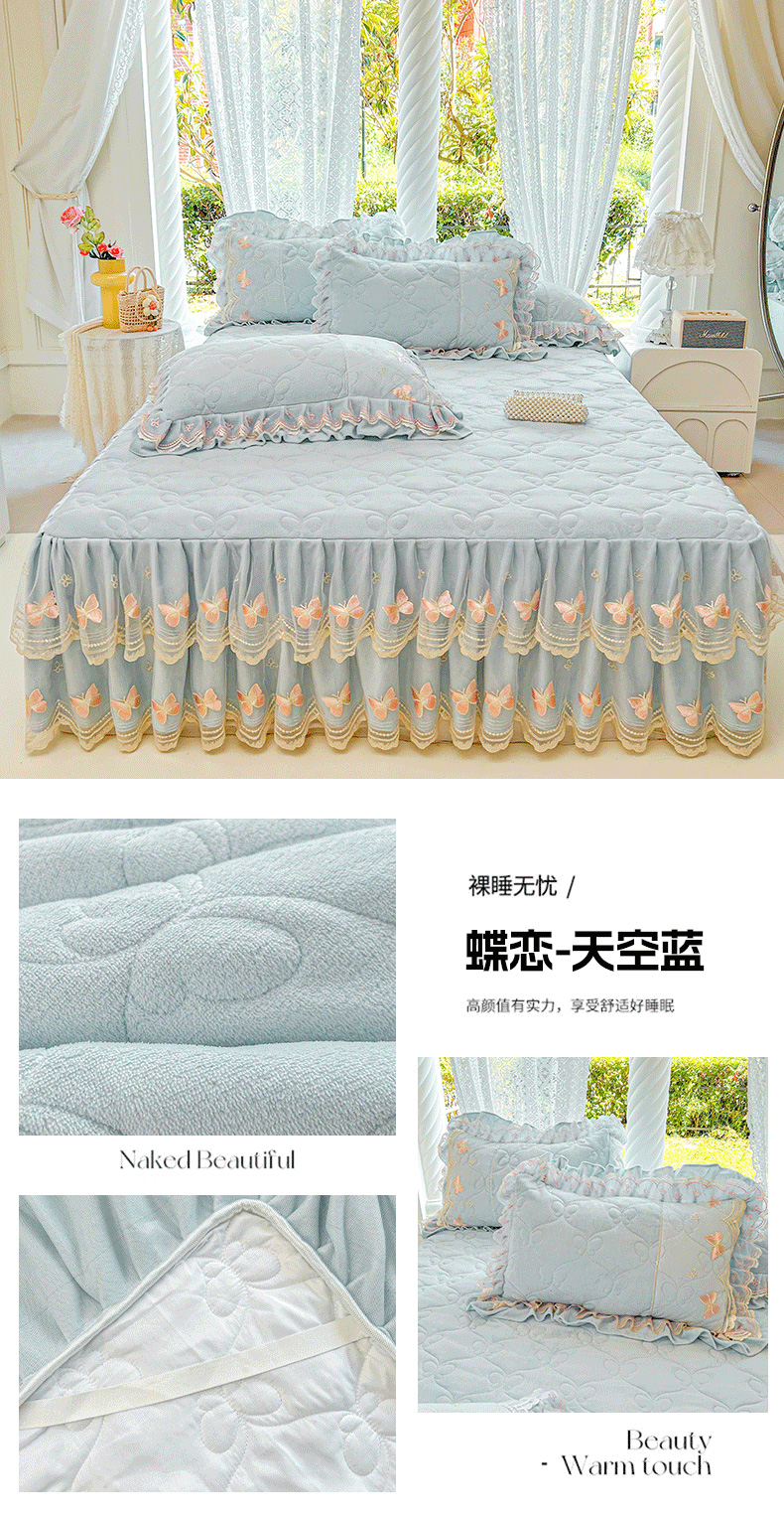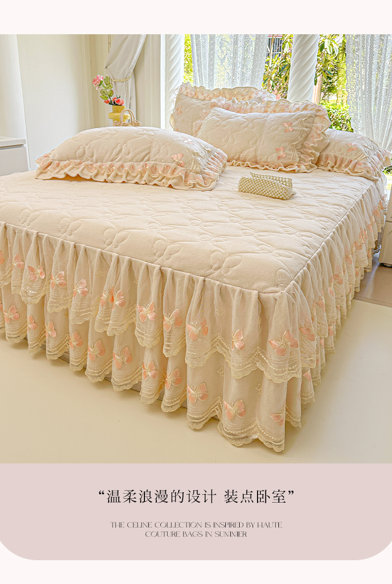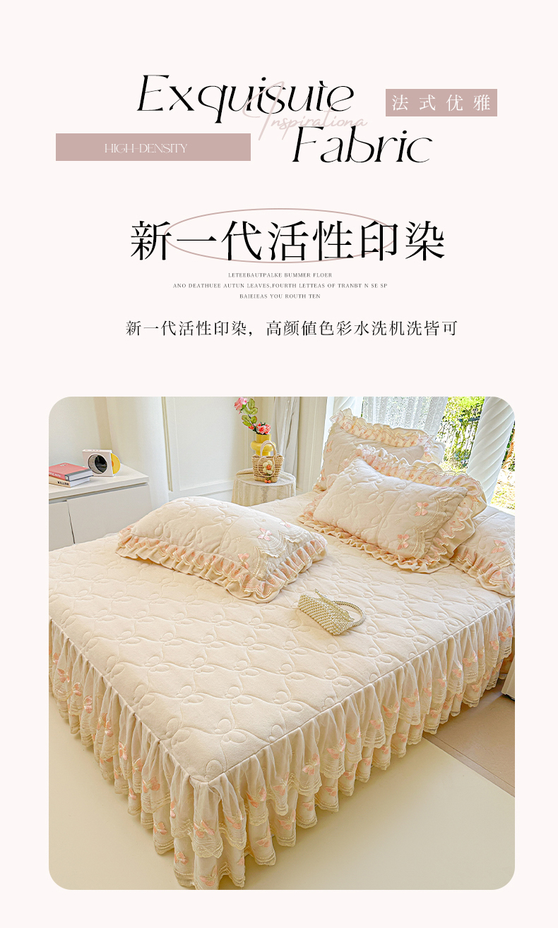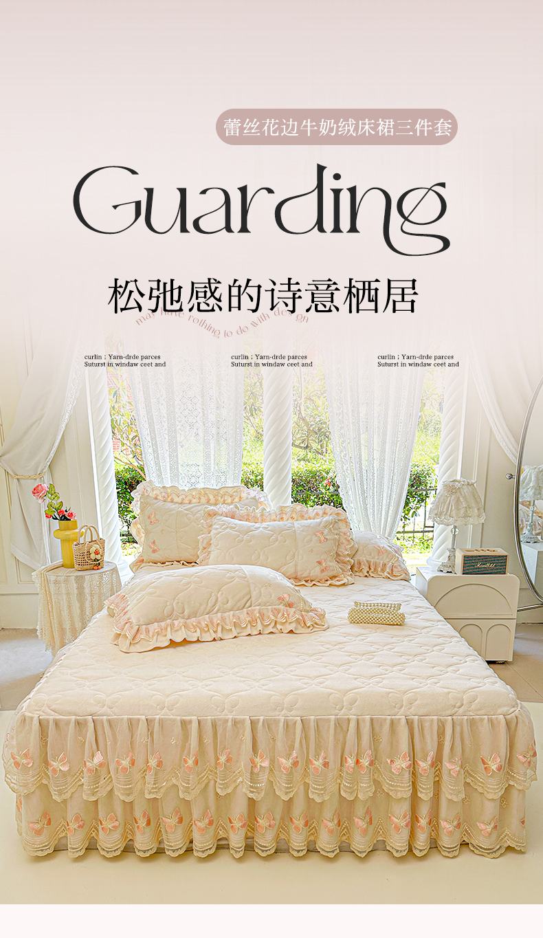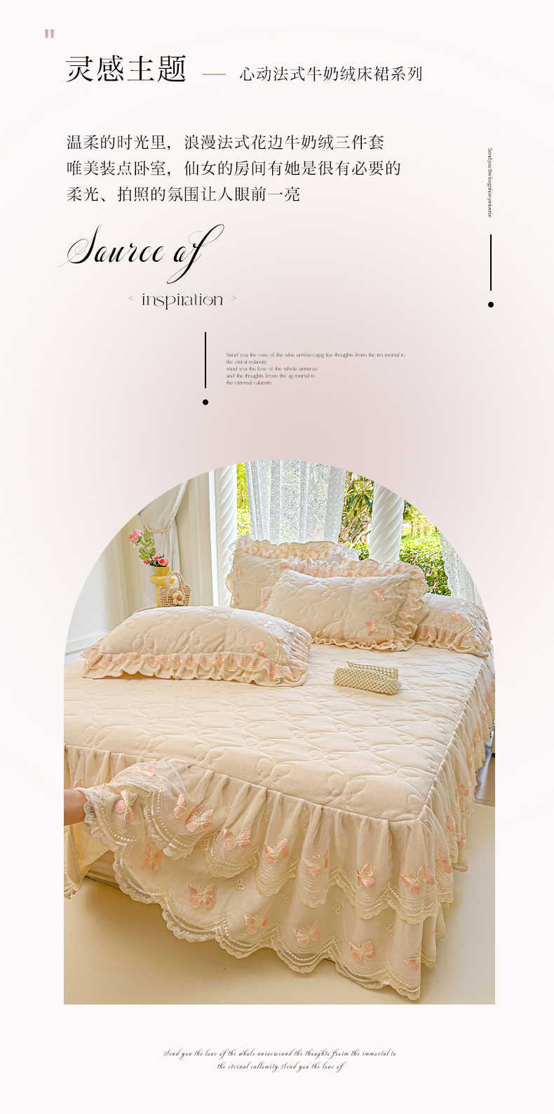 当前位置: 91家纺网 > 商品网购 > 床品套件 > 三件套 > 虹星家纺 2025新款花边牛奶绒床裙三件套系列 蝶恋-粉玉